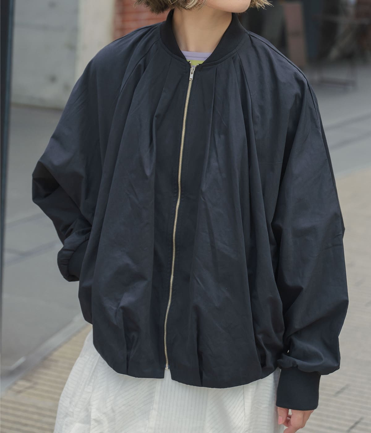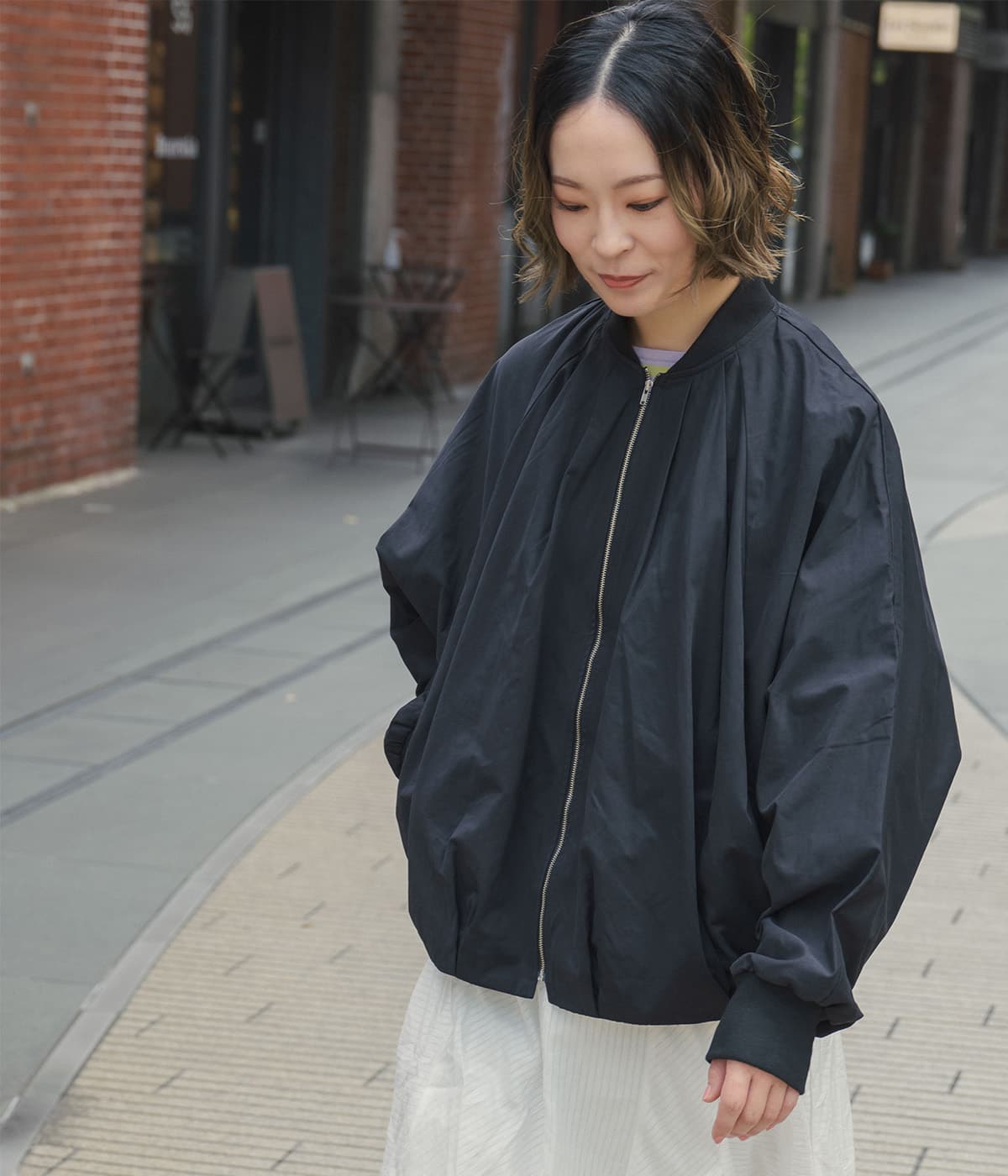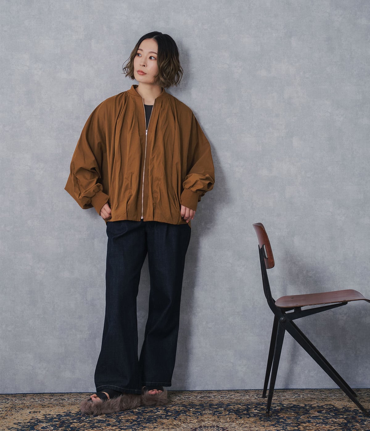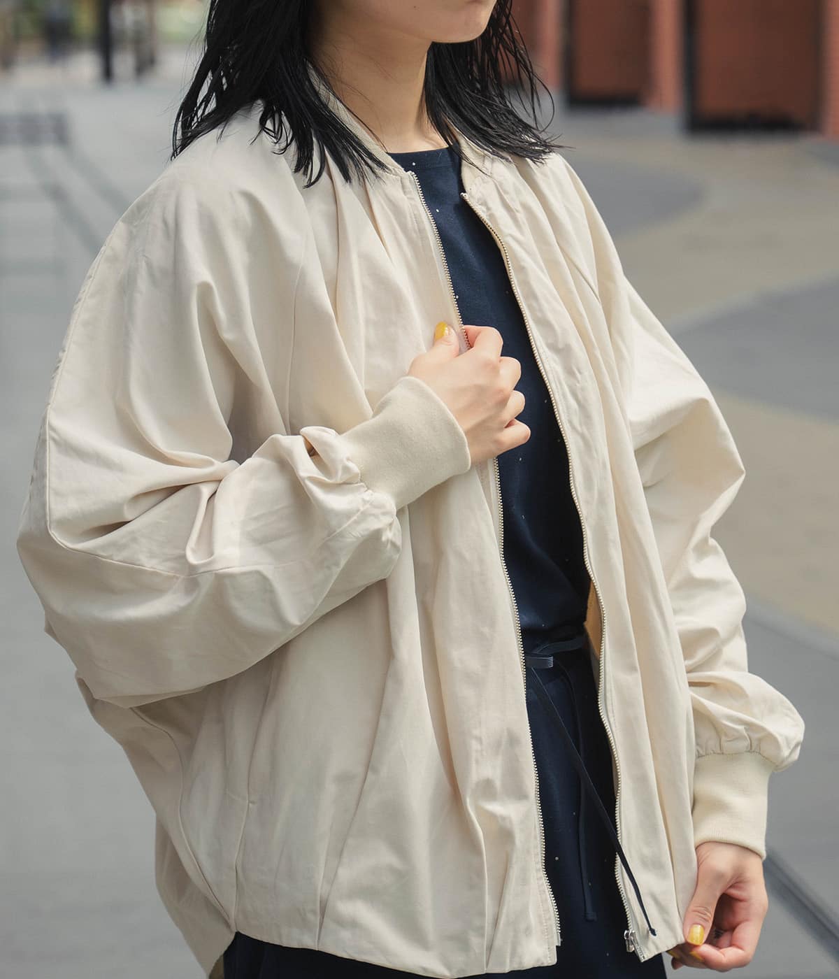 ファスナー開きのドルマンスリーブブルゾン。タックとギャザーをたっぷりと施し、後ろ身頃は中央付近で切り替えを入れることで立体感をプラス。さらに裾にもタックを入れ、裾すぼまりの丸みを描くコクーンシルエットに仕上げています。袖幅がゆったりとしたドルマンスリーブで、厚手のニットなどを合わせてももたつかず、すっきりとお召しいただけます。ポケットあり。裏地なし。