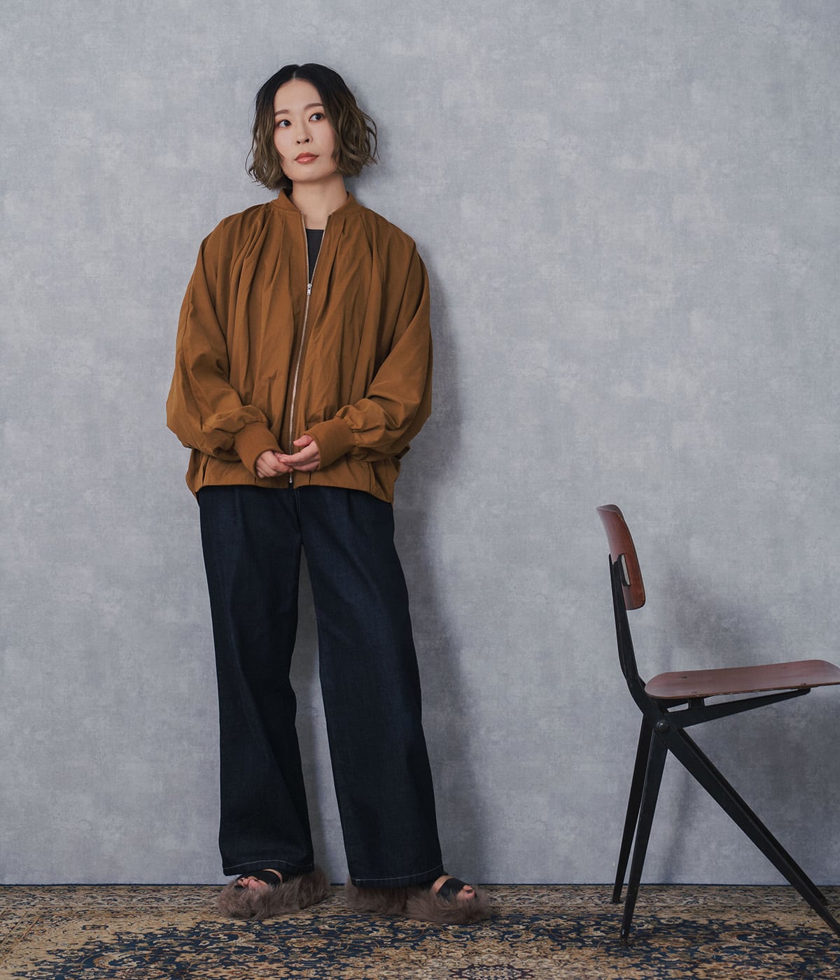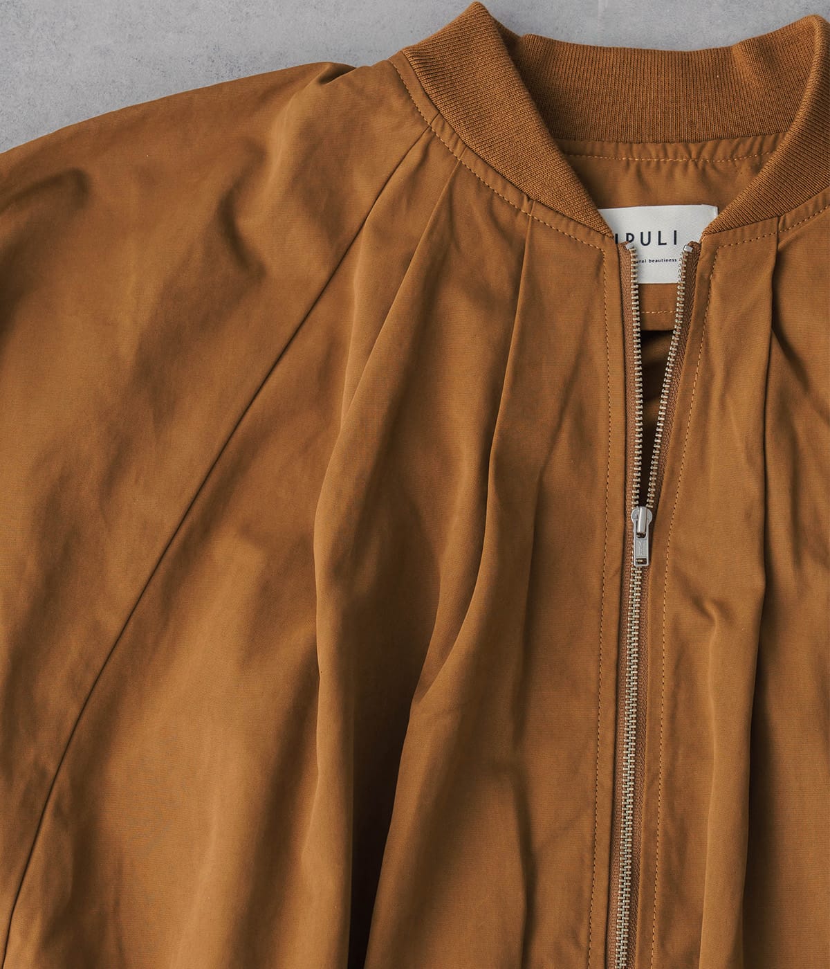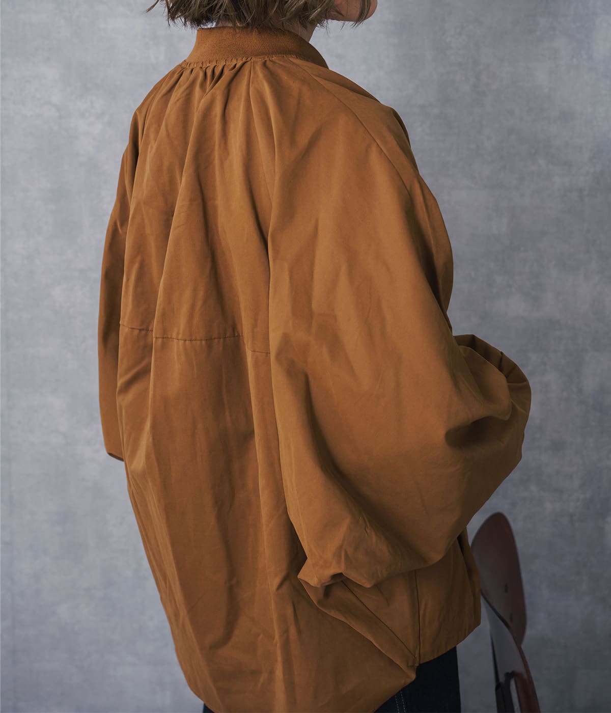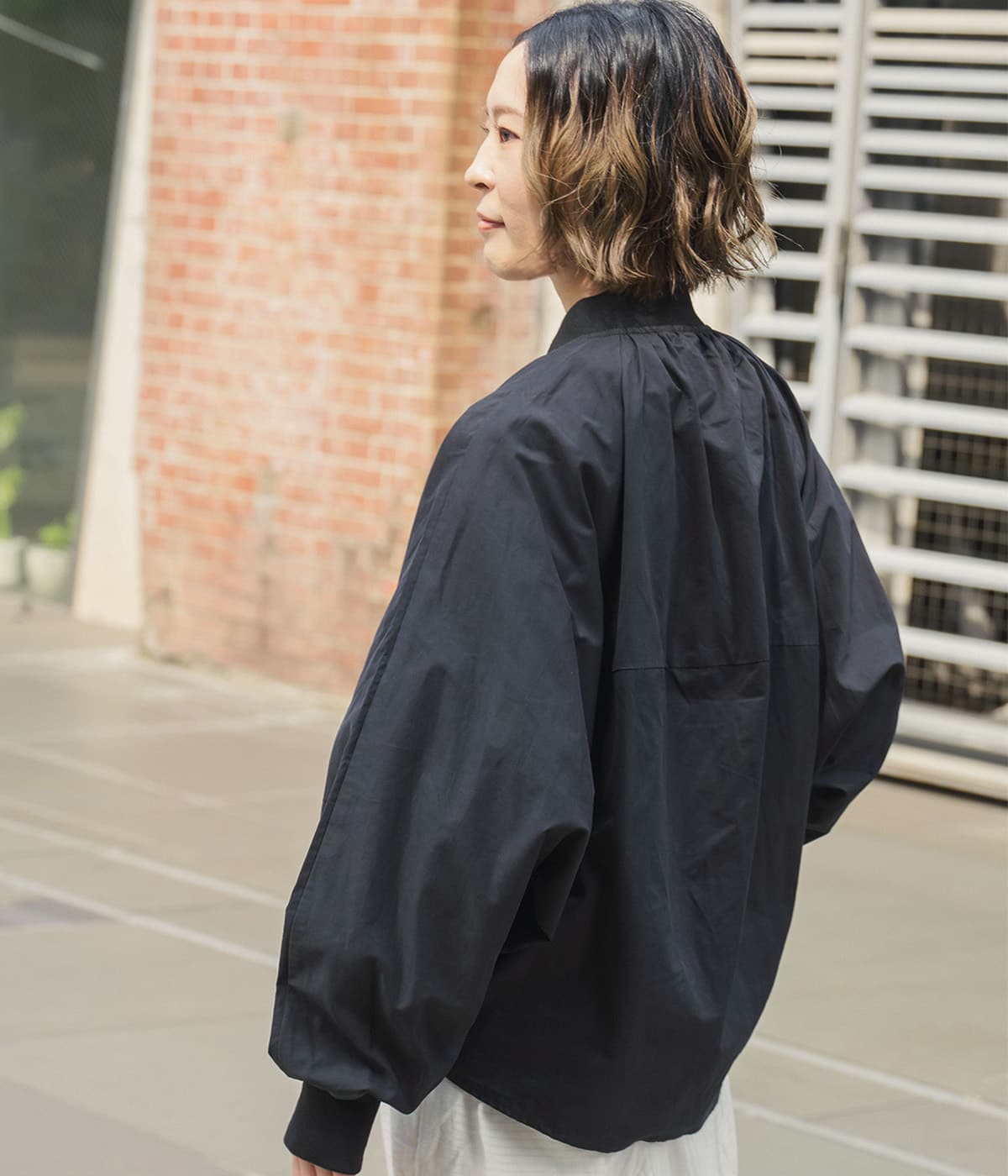 ファスナー開きのドルマンスリーブブルゾン。タックとギャザーをたっぷりと施し、後ろ身頃は中央付近で切り替えを入れることで立体感をプラス。さらに裾にもタックを入れ、裾すぼまりの丸みを描くコクーンシルエットに仕上げています。袖幅がゆったりとしたドルマンスリーブで、厚手のニットなどを合わせてももたつかず、すっきりとお召しいただけます。ポケットあり。裏地なし。
