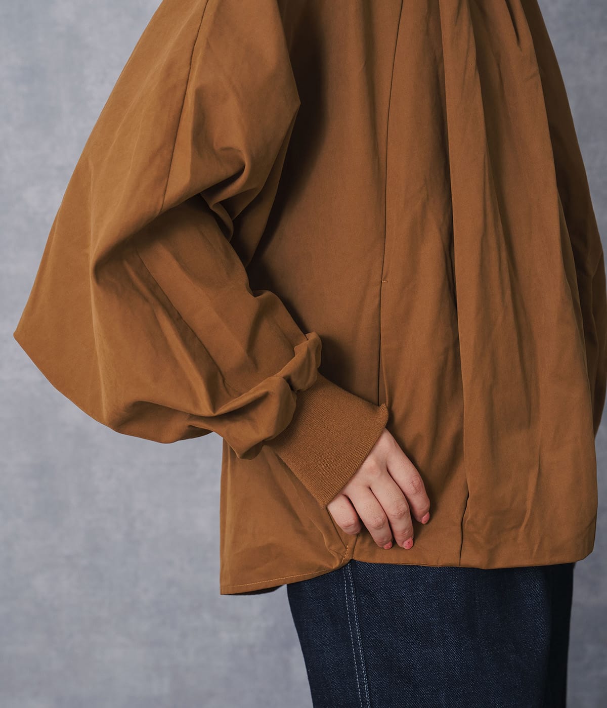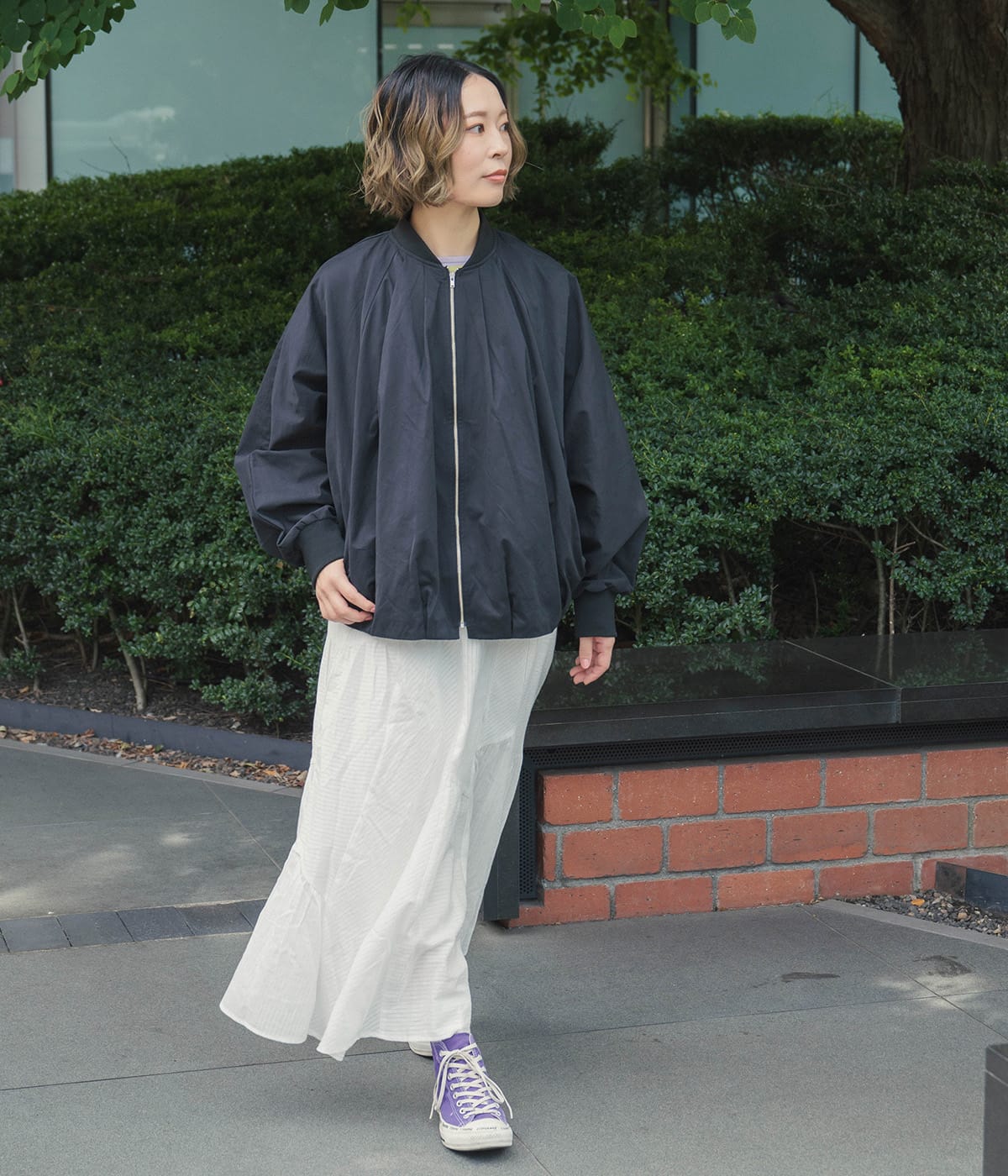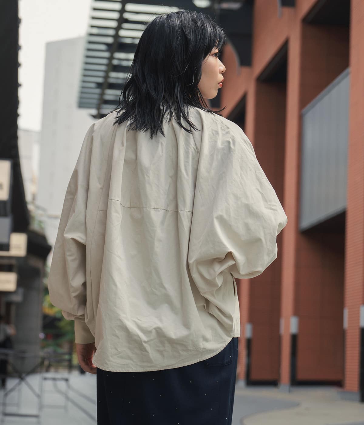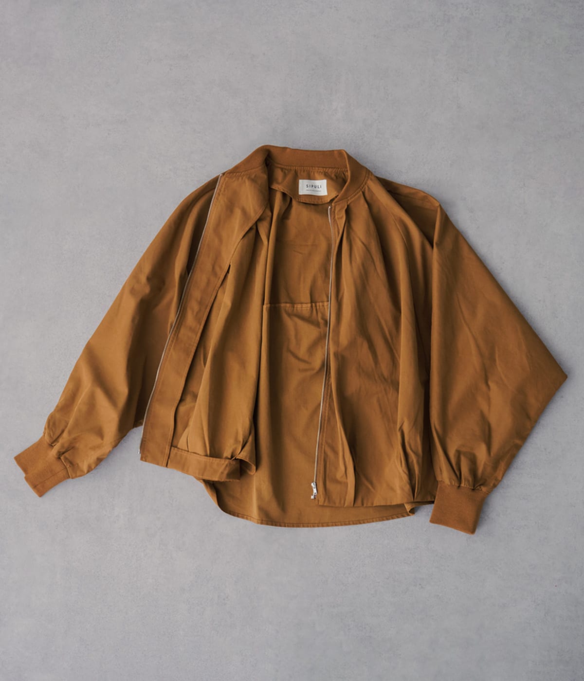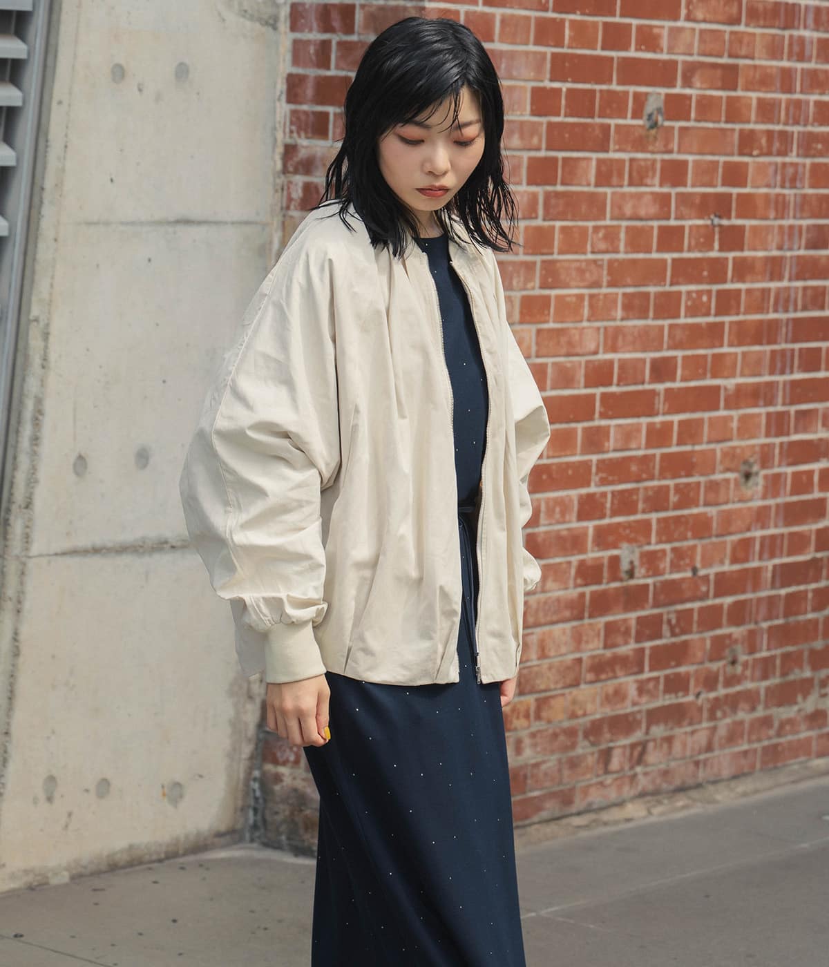 ファスナー開きのドルマンスリーブブルゾン。タックとギャザーをたっぷりと施し、後ろ身頃は中央付近で切り替えを入れることで立体感をプラス。さらに裾にもタックを入れ、裾すぼまりの丸みを描くコクーンシルエットに仕上げています。袖幅がゆったりとしたドルマンスリーブで、厚手のニットなどを合わせてももたつかず、すっきりとお召しいただけます。ポケットあり。裏地なし。