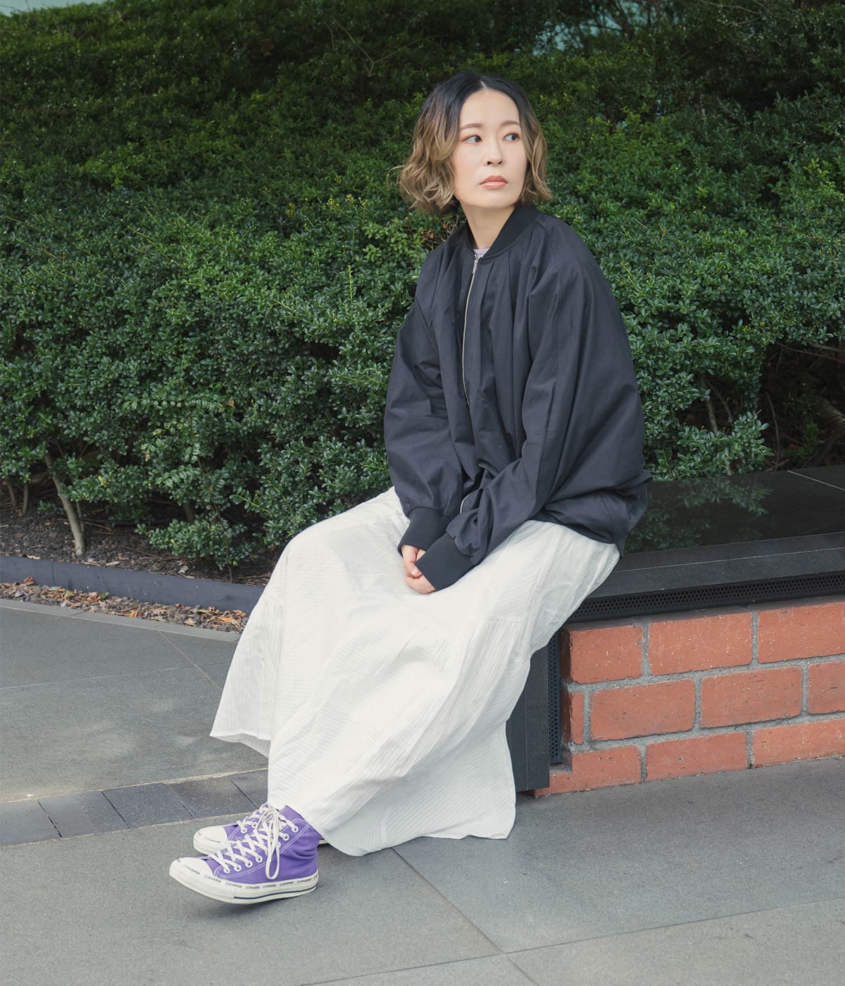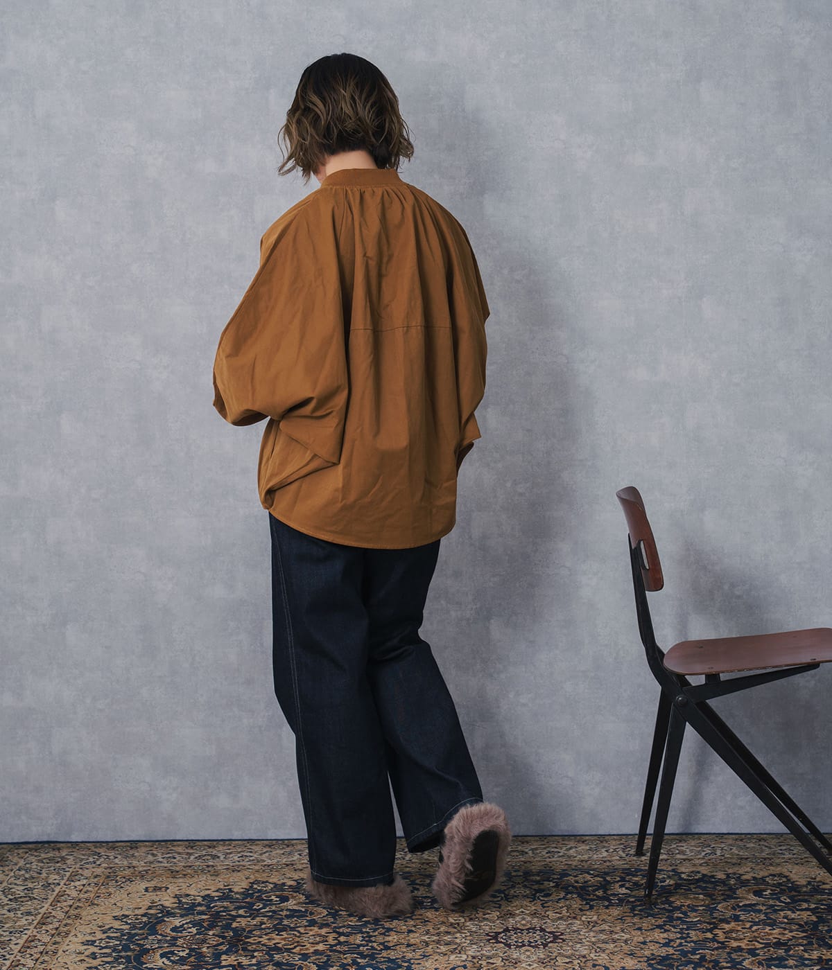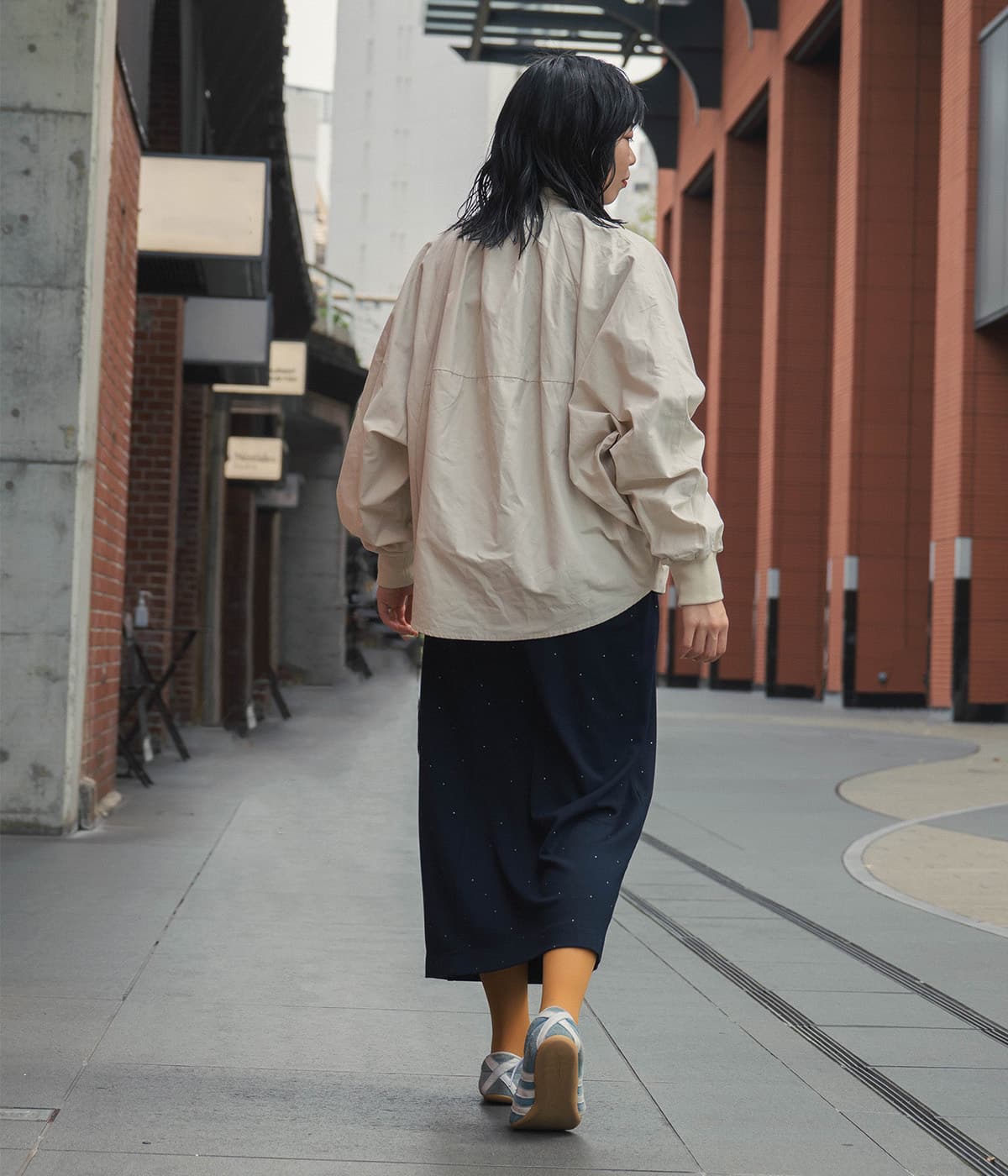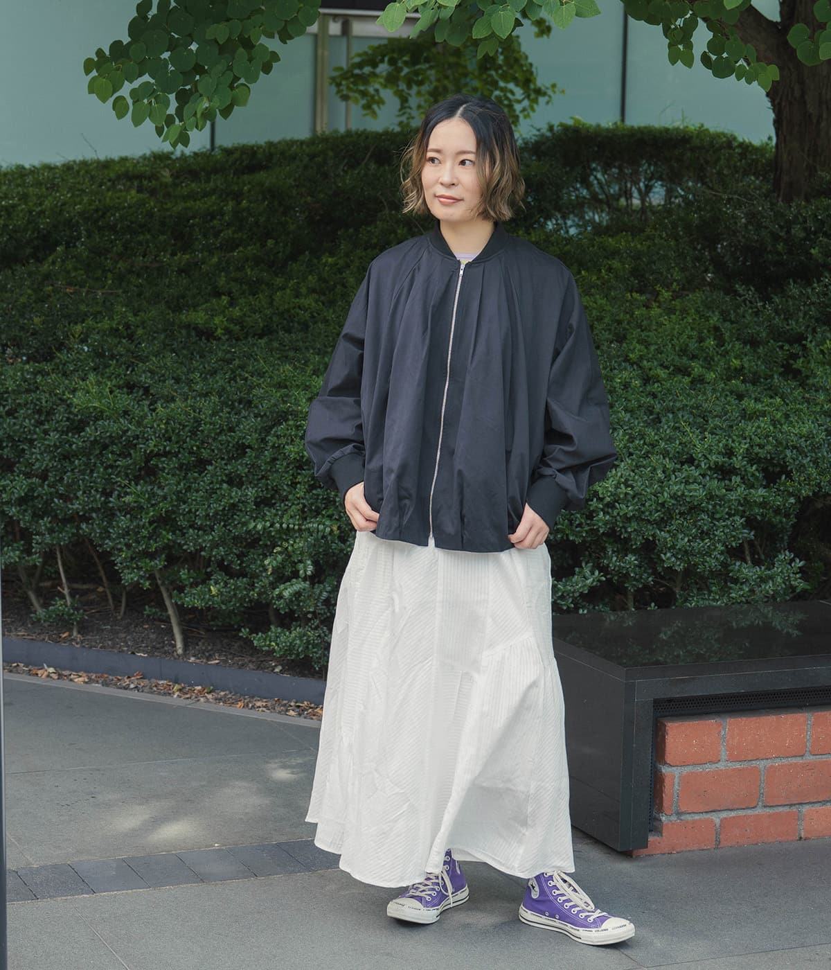 ファスナー開きのドルマンスリーブブルゾン。タックとギャザーをたっぷりと施し、後ろ身頃は中央付近で切り替えを入れることで立体感をプラス。さらに裾にもタックを入れ、裾すぼまりの丸みを描くコクーンシルエットに仕上げています。袖幅がゆったりとしたドルマンスリーブで、厚手のニットなどを合わせてももたつかず、すっきりとお召しいただけます。ポケットあり。裏地なし。