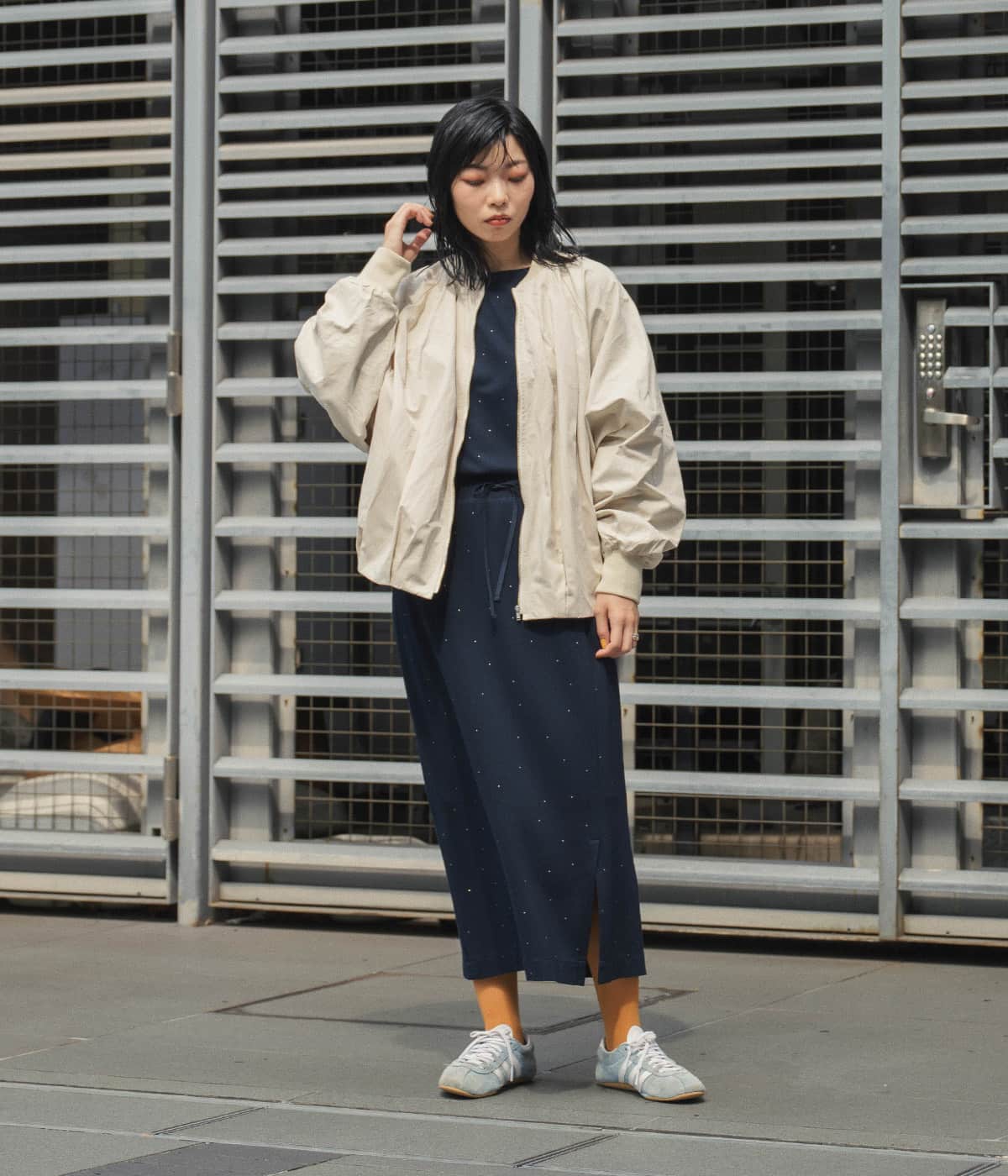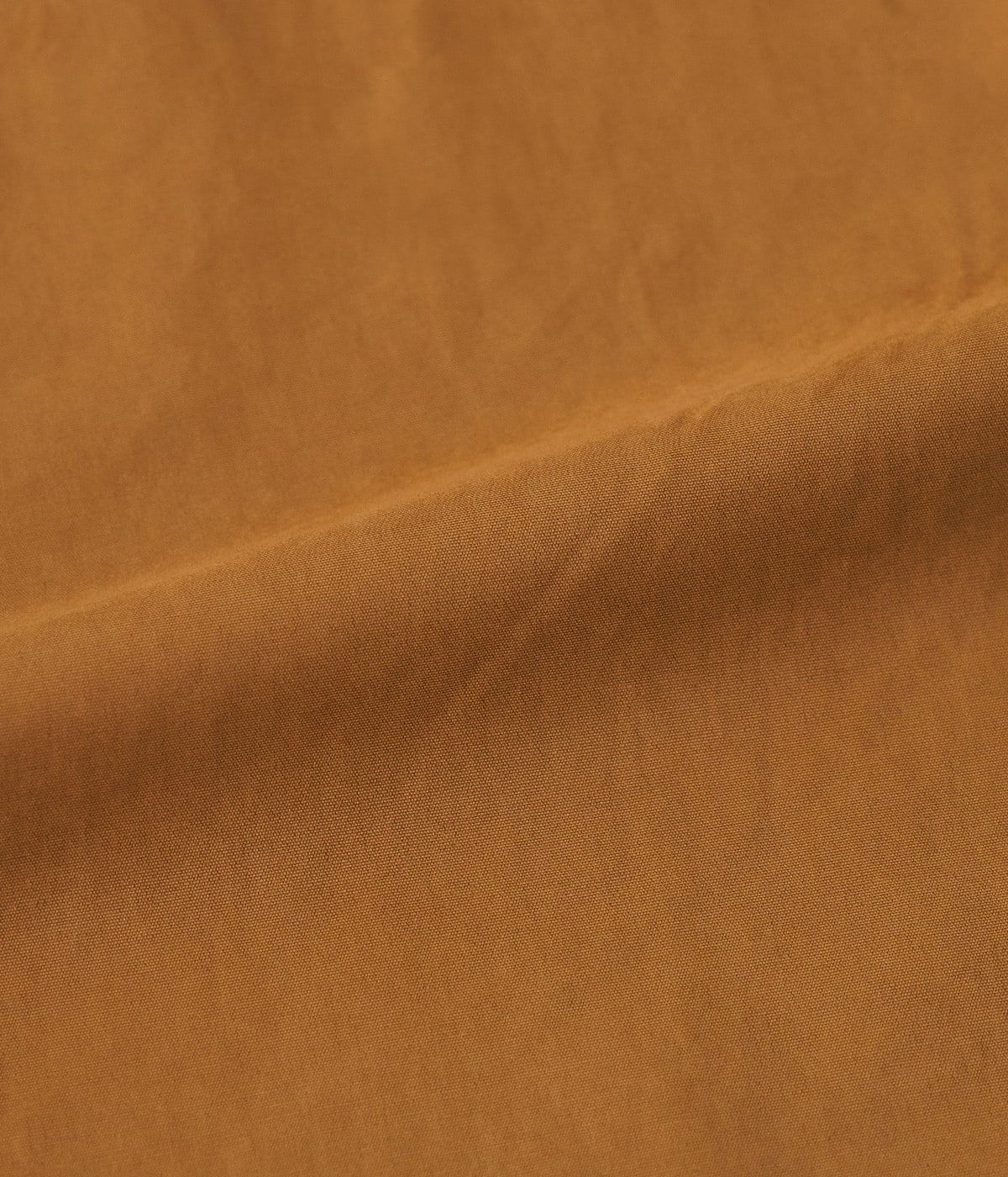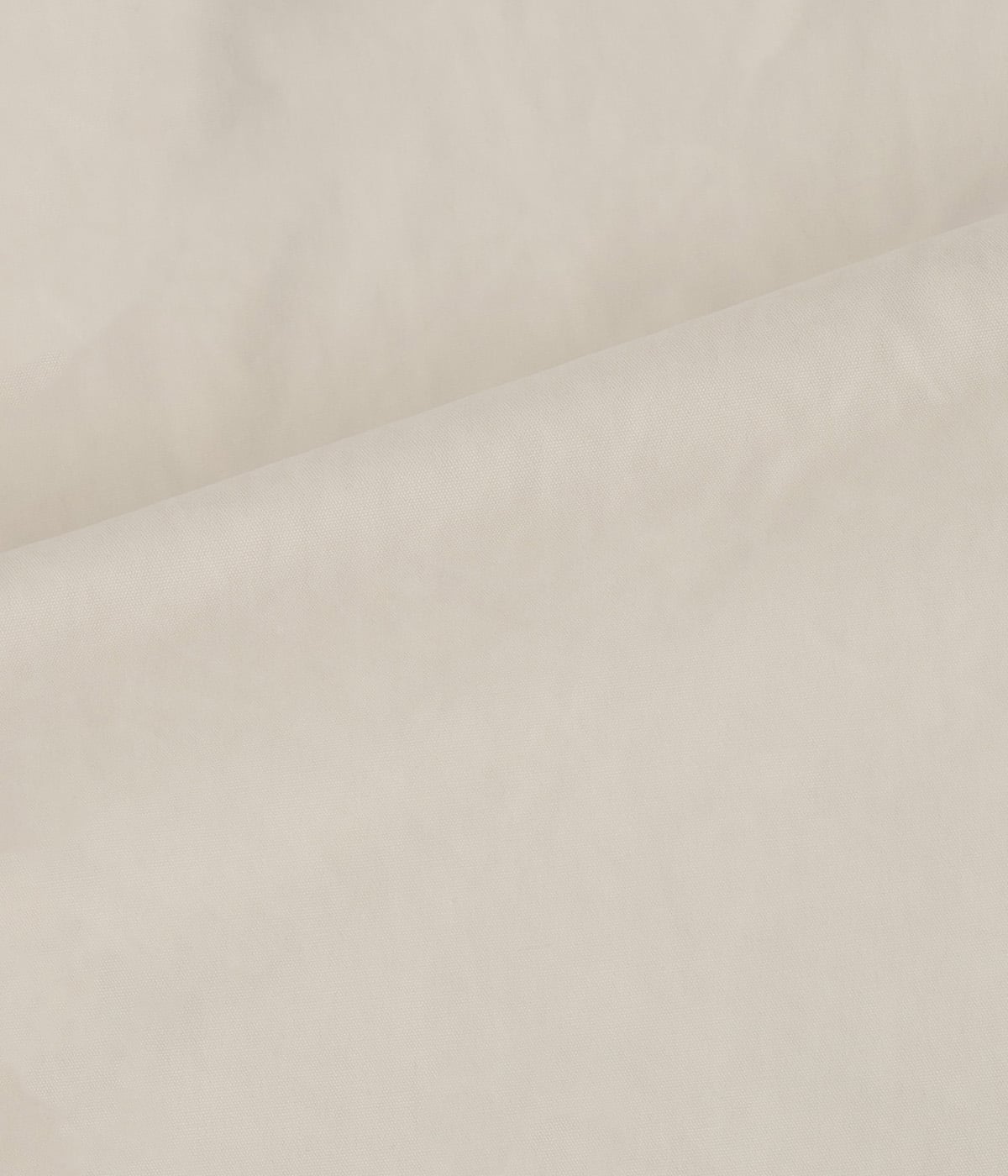 高密度に織り上げたナイロンツイルを使用。ほどよいハリがあり、自然なボリューム感と肌離れの良さが特徴です。襟と袖口にはポリウレタンが入ったリブを使用し、心地よいフィット感とキックバック性を持たせています。