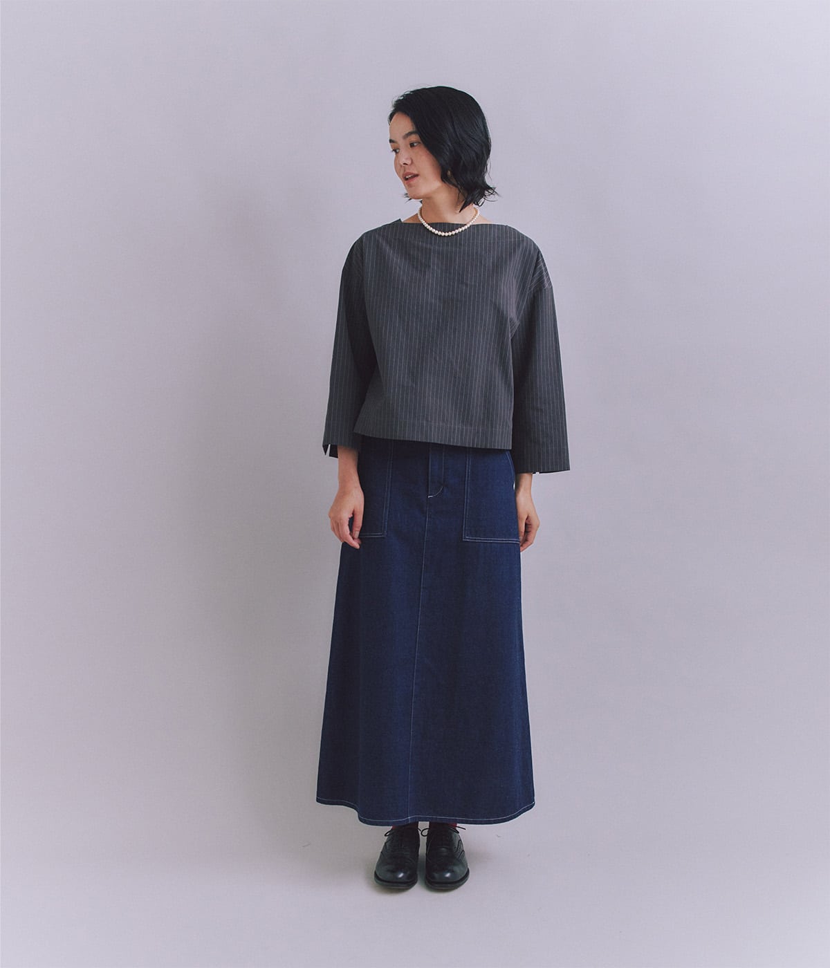 裾に向かって広がるAラインのロングスカート。シプリでは定番のベイカーパンツ(品番:37335091)のパッチポケットの仕様を活かし、スカートでお作りしました。後ろヨーク仕立てがヒップラインをすっきりと見せてくれます。また、ヨーク部分のフラップポケットもさりげないアクセントに。ウエストの両脇にはアジャスターボタンを付けており、ベルトなしでもサイズ調整が可能です。
