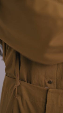 バギーシルエットの2wayタックパンツ。肩紐は内側の釦で取り外しができ、ハイウエストのパンツとしても着用いただけます。また、肩紐の長さはフロント側で2段階調節が可能ですが、やや短く感じる方は、紐をベルトループに結ぶとより長くなります。後ろはパッチポケットで、右のみ釦を付けアクセントに。ウエスト中央にスリットを入れ、さりげない抜け感をプラスしました。同素材のブラウス(品番:37616021)とセットアップでの着用もおすすめです。ポケットあり。裏地なし。
