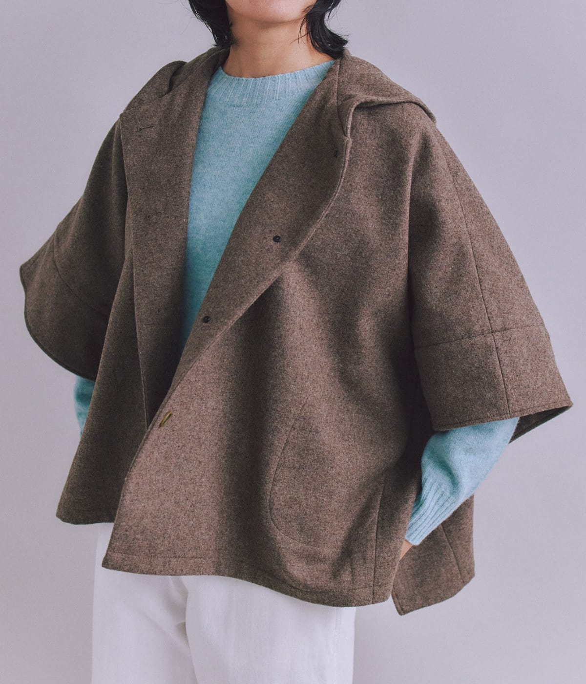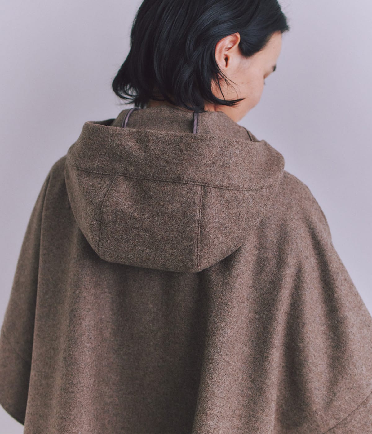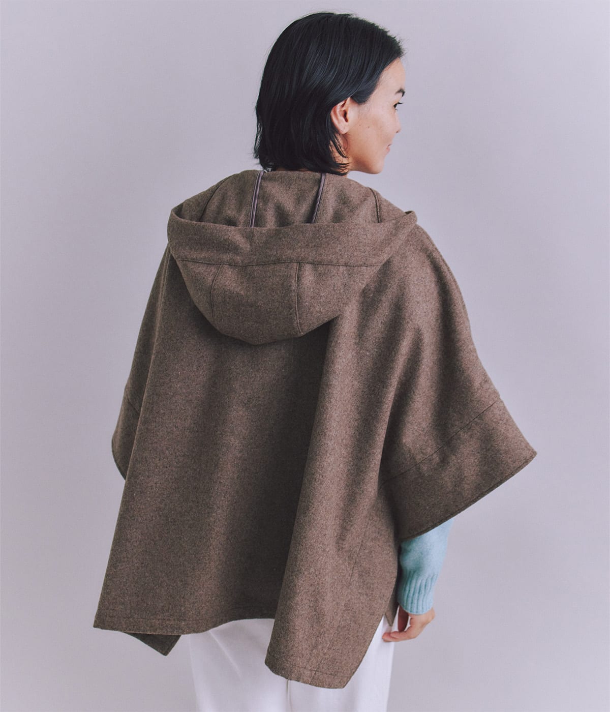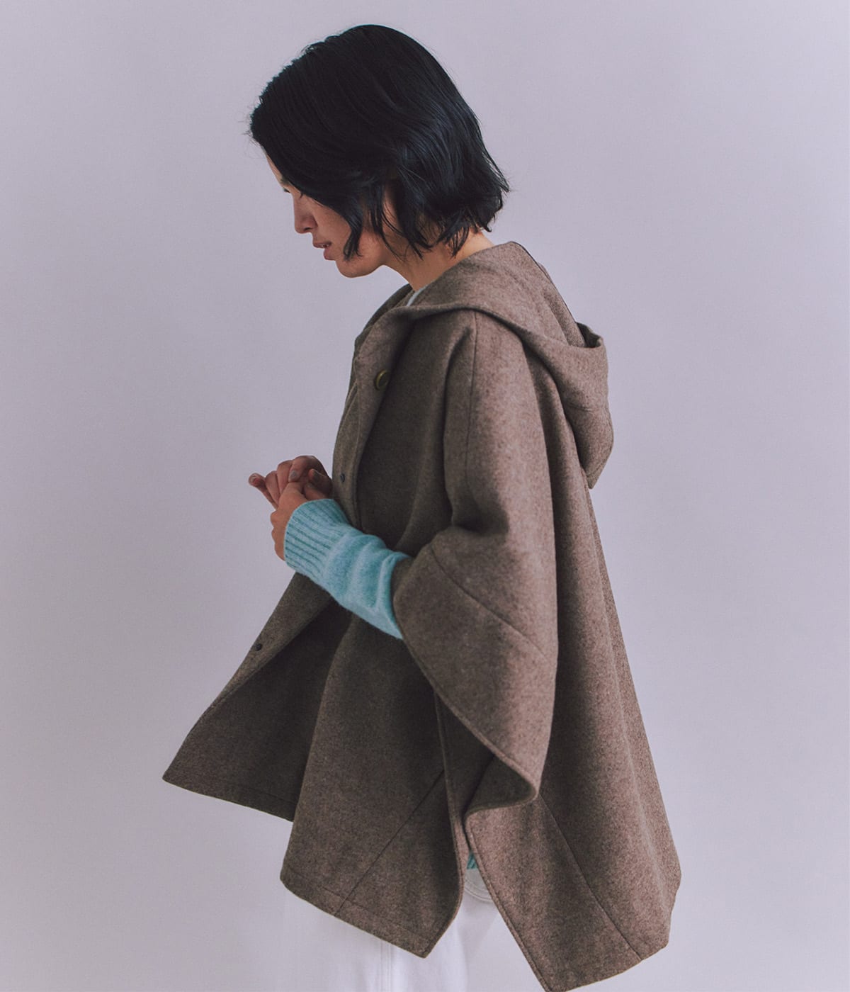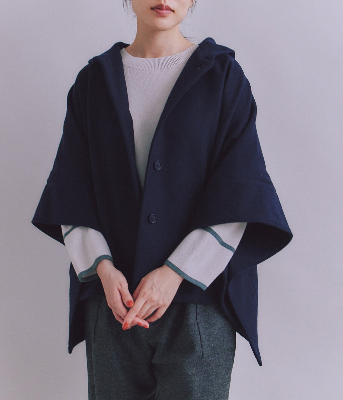 フードの立体感にこだわって仕立てた、ポンチョ型のコート。袖丈は七分ほどが隠れる長さで、冬の始まりにも取り入れやすい一着です。袖口の釦は開け閉めが可能なため、釦を開けてざっくりとした着こなしも楽しめます。ゆとりのあるポンチョシルエットで、ローゲージのニットも無理なく重ねていただけます。ポケットあり。裏地あり。