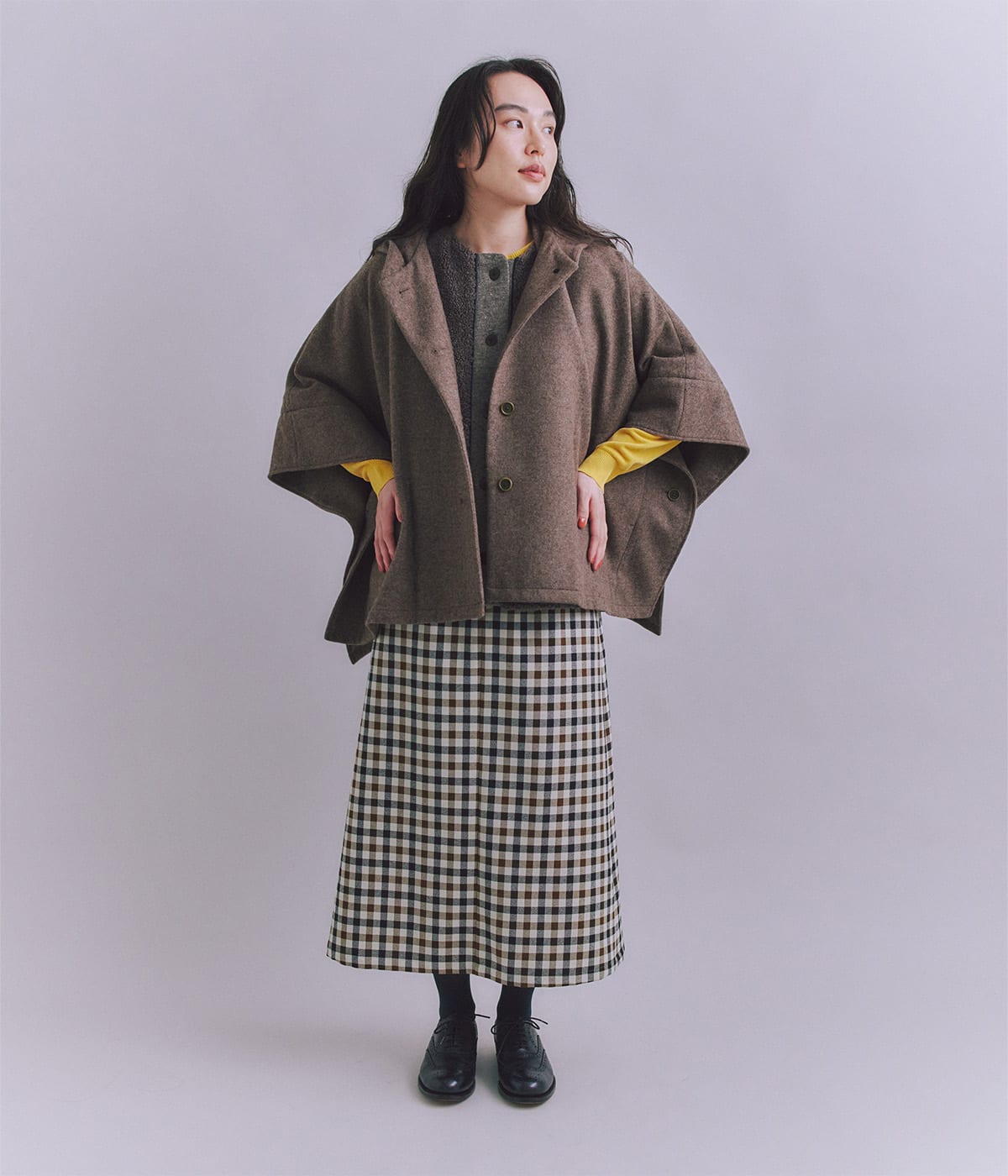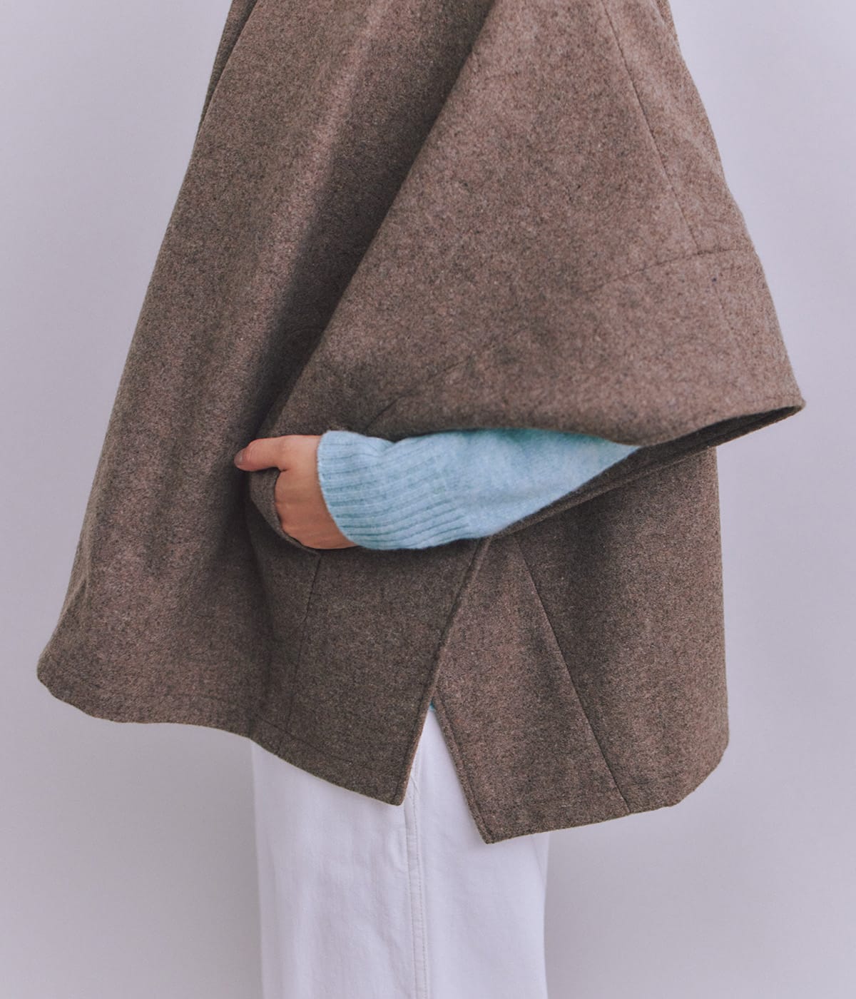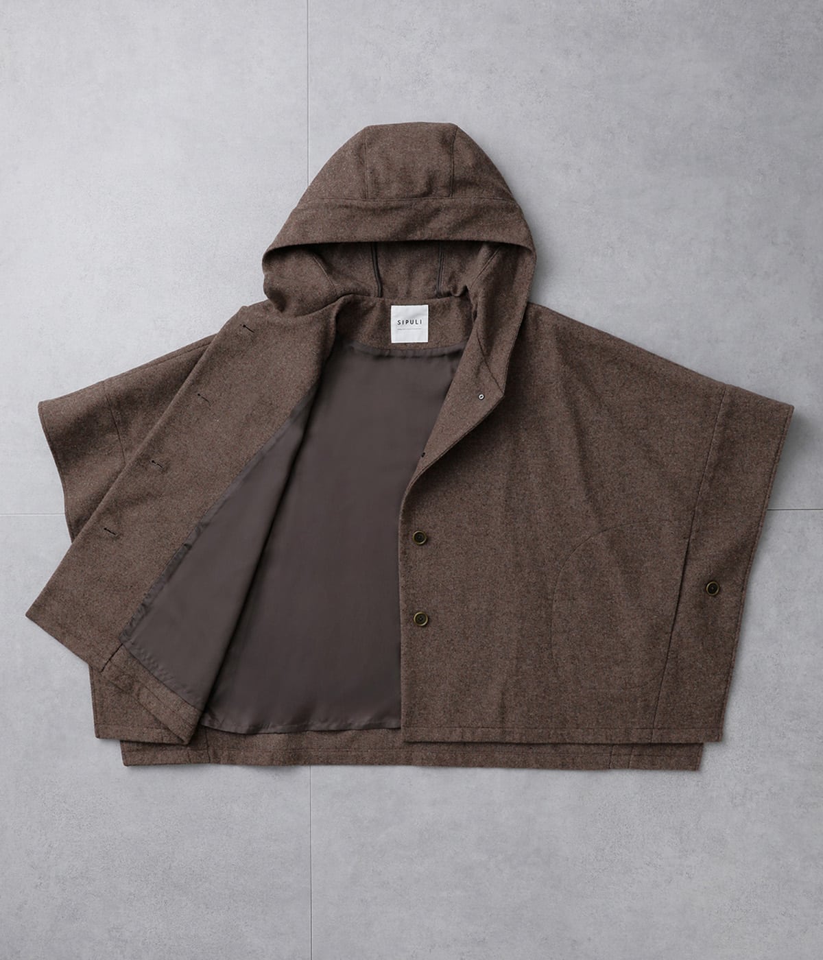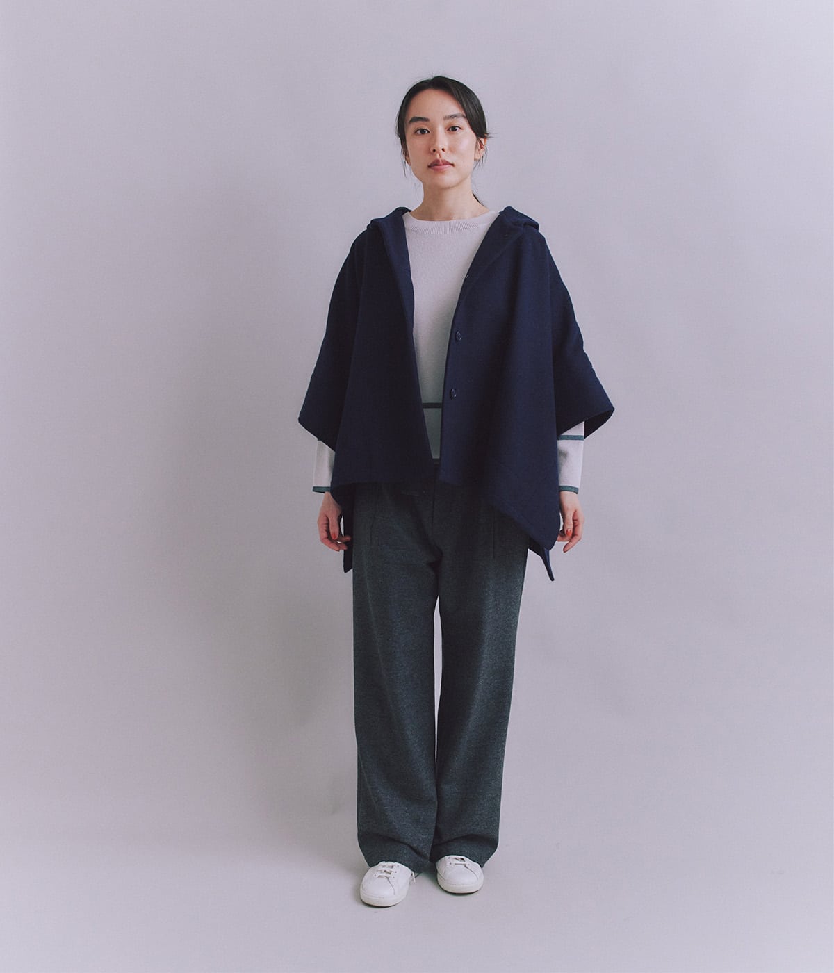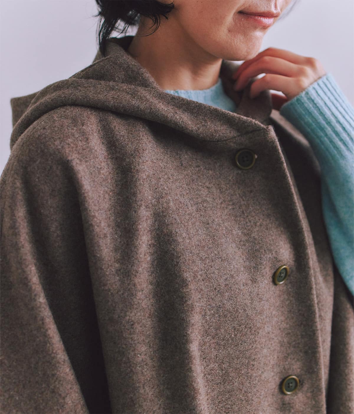 フードの立体感にこだわって仕立てた、ポンチョ型のコート。袖丈は七分ほどが隠れる長さで、冬の始まりにも取り入れやすい一着です。袖口の釦は開け閉めが可能なため、釦を開けてざっくりとした着こなしも楽しめます。ゆとりのあるポンチョシルエットで、ローゲージのニットも無理なく重ねていただけます。ポケットあり。裏地あり。