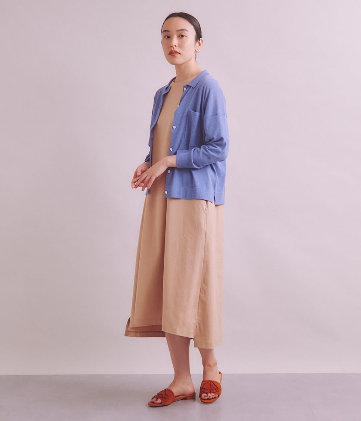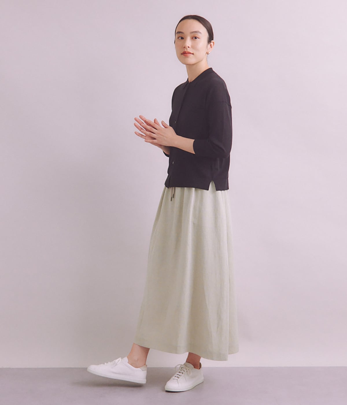 スカート(品番:37252041)にはボタンを留めてシャツライクに合わせれば、きちんと感のあるスタイルに。同素材のニットプルオーバー(品番:37762791)とのアンサンブルスタイルもおすすめです。