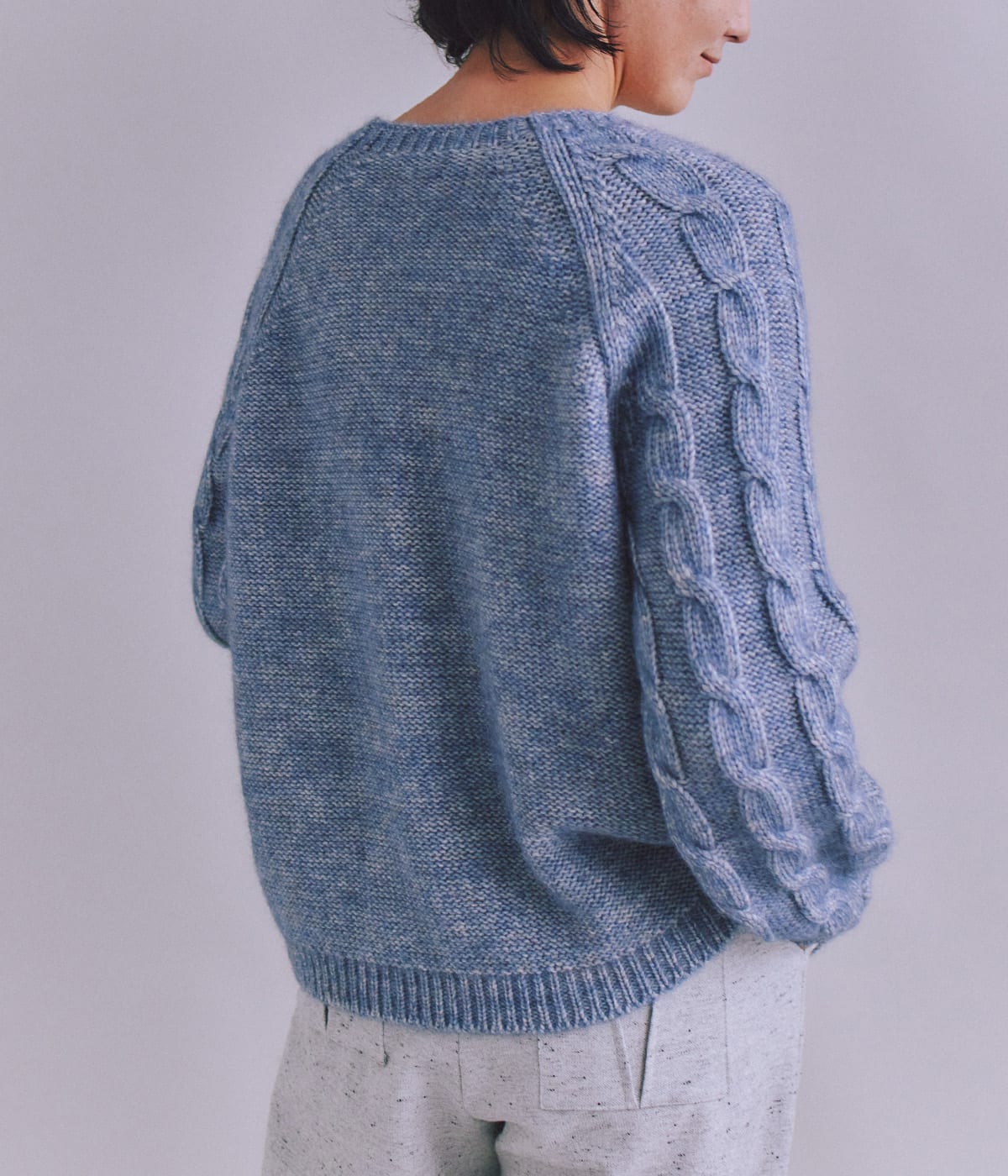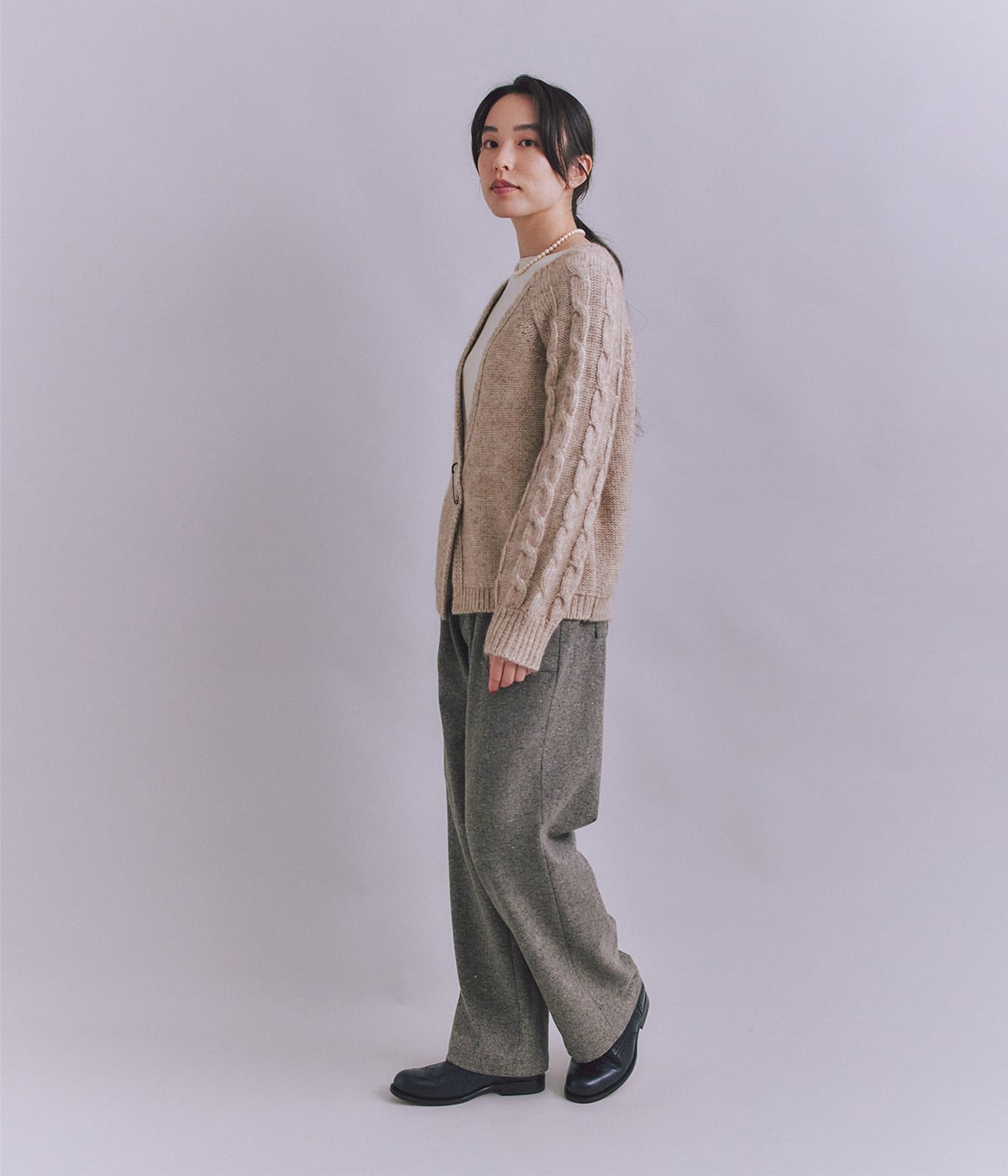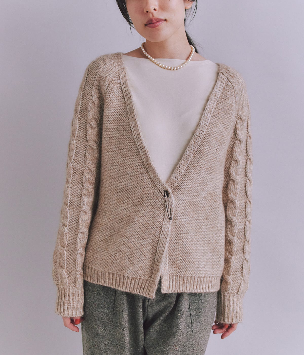 袖にケーブル編みをあしらい、身頃はすっきりとした裏天竺で仕立てたニットトッパー。付属のカブトピンで前を深く重ねれば、ほどよく体のラインをきれいに見せる着こなしに。前を留めずに羽織れば、軽やかなトッパーとしてラフな印象にもなります。同素材のケープ(品番:37796751)と合わせれば、奥行きのあるスタイリングを楽しめます。