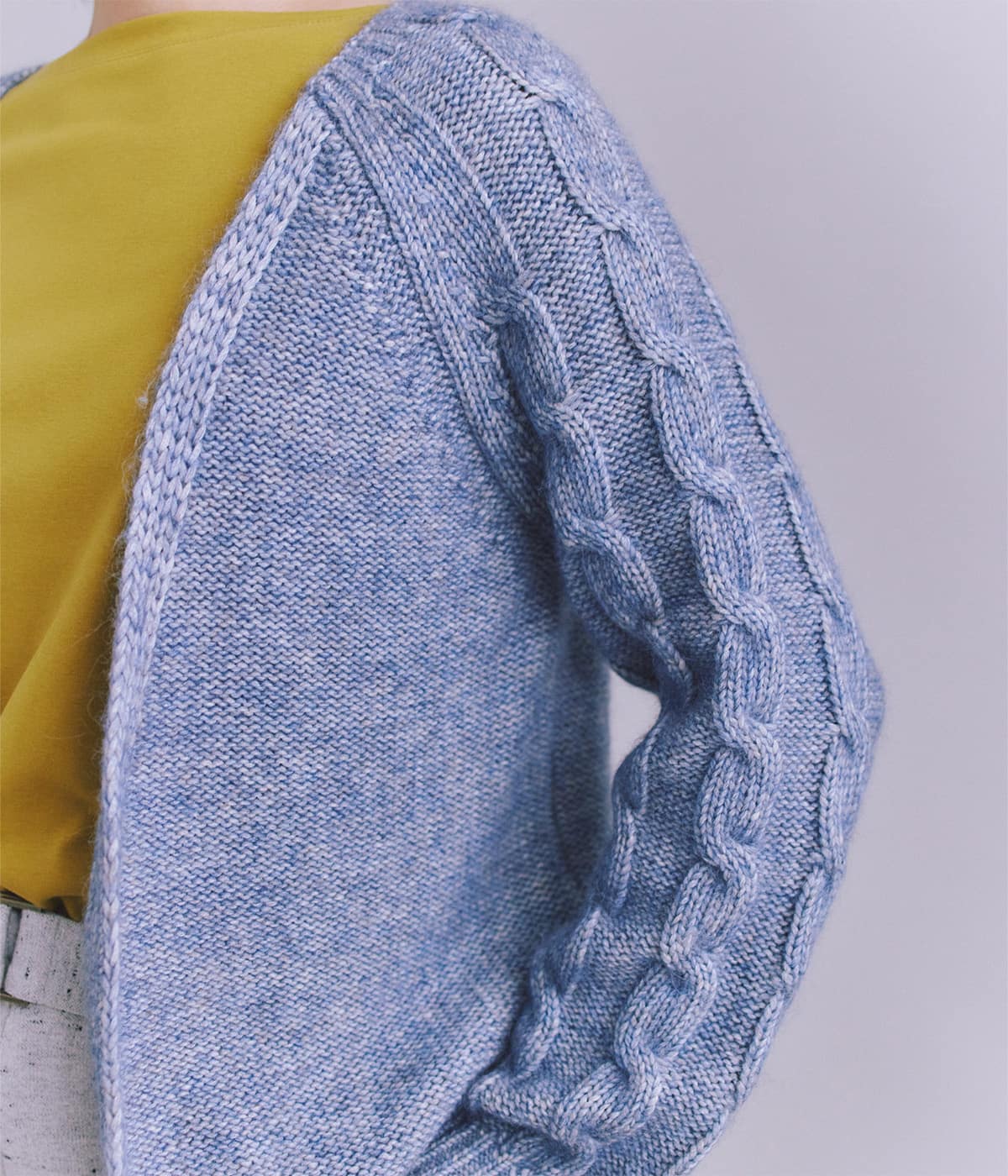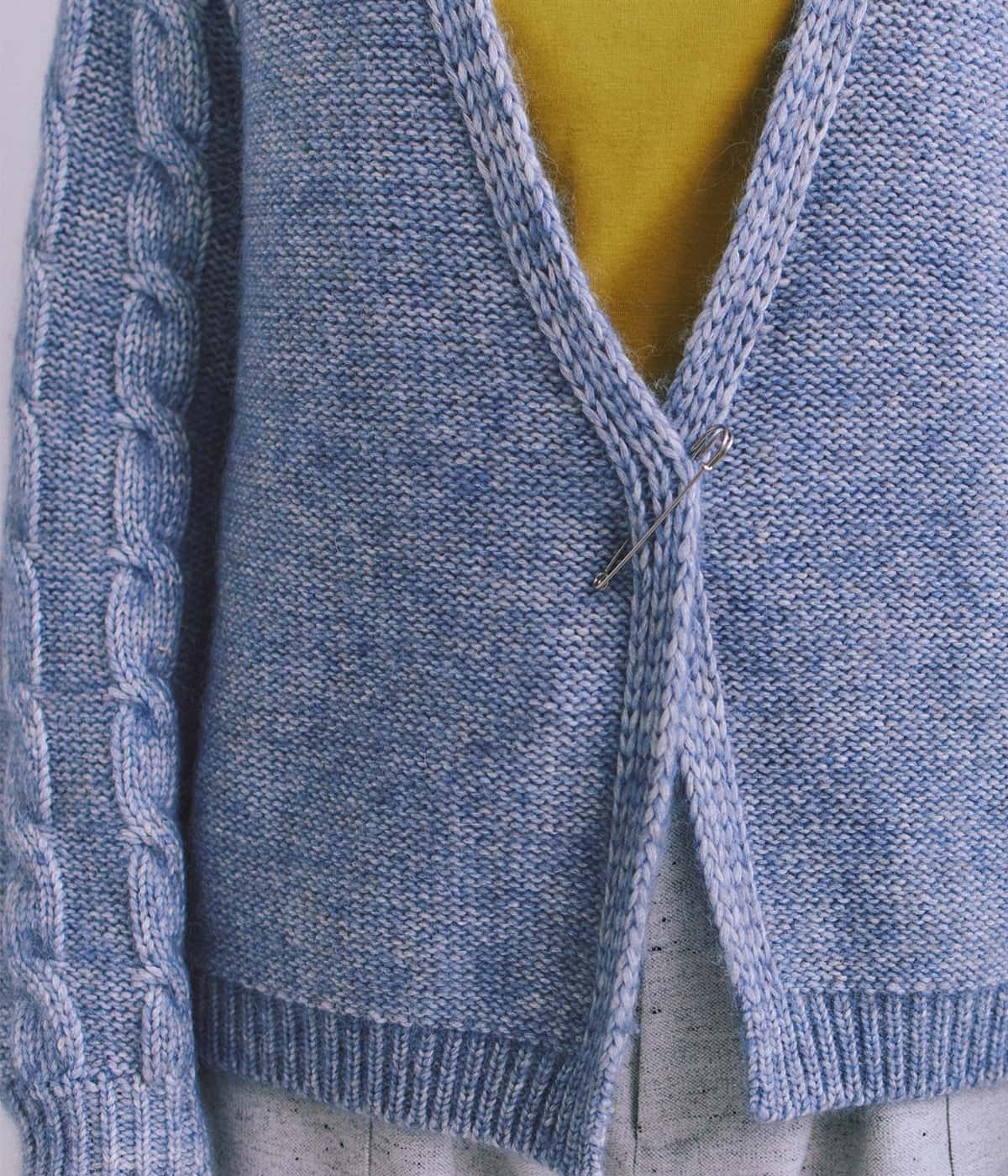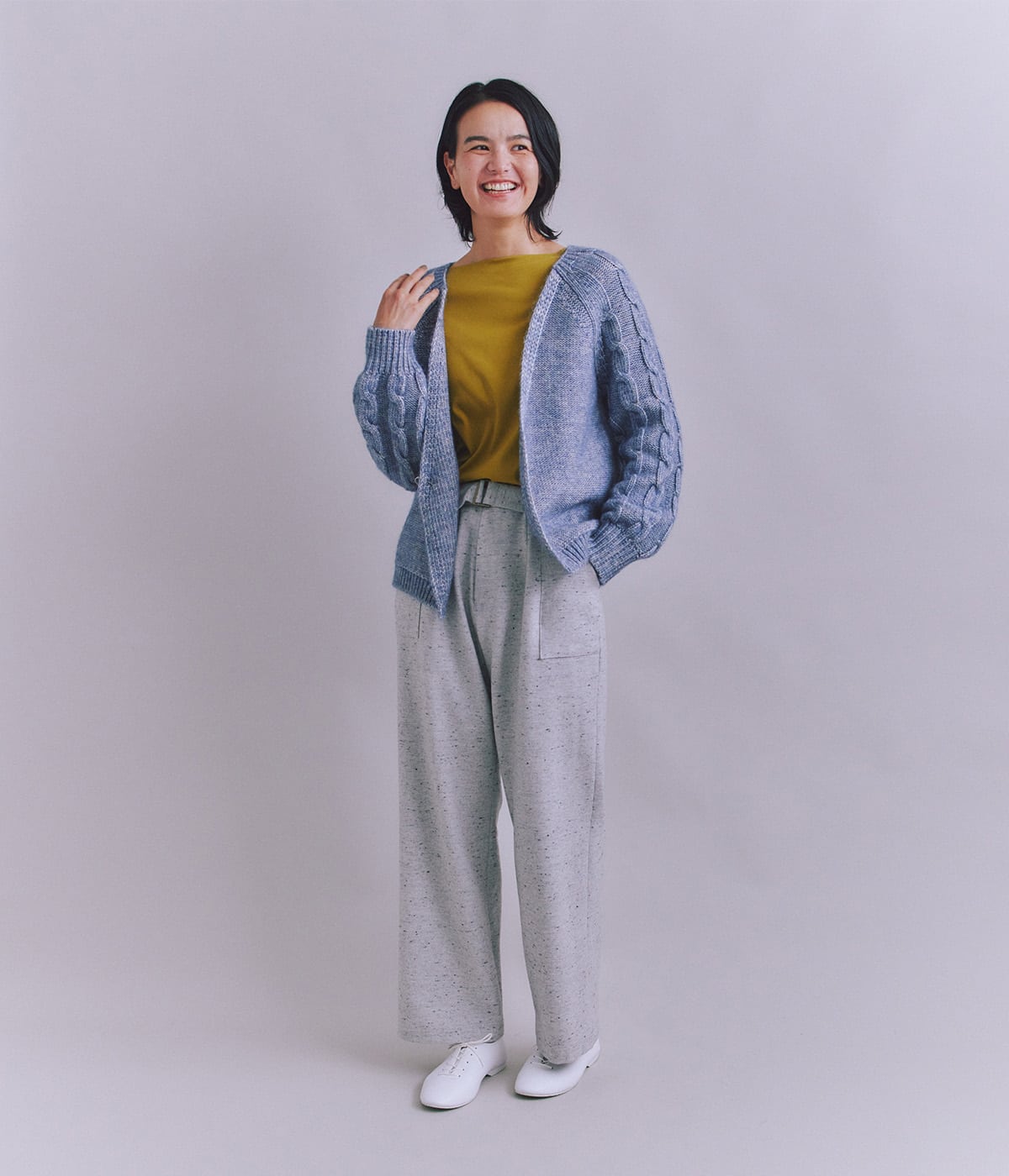 袖にケーブル編みをあしらい、身頃はすっきりとした裏天竺で仕立てたニットトッパー。付属のカブトピンで前を深く重ねれば、ほどよく体のラインをきれいに見せる着こなしに。前を留めずに羽織れば、軽やかなトッパーとしてラフな印象にもなります。同素材のケープ(品番:37796751)と合わせれば、奥行きのあるスタイリングを楽しめます。