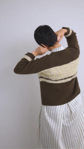 愛知県江南市で紡績しウールの特性を最大限に生かし、コード調のローゲージ用素材に仕立てました。空気をたっぷりと含み、スポンディッシュで、軽い編地が特徴です。身頃には非常にバルキッシュな特性を持つウールを使用した素材で、暖かみのある表情が魅力です。