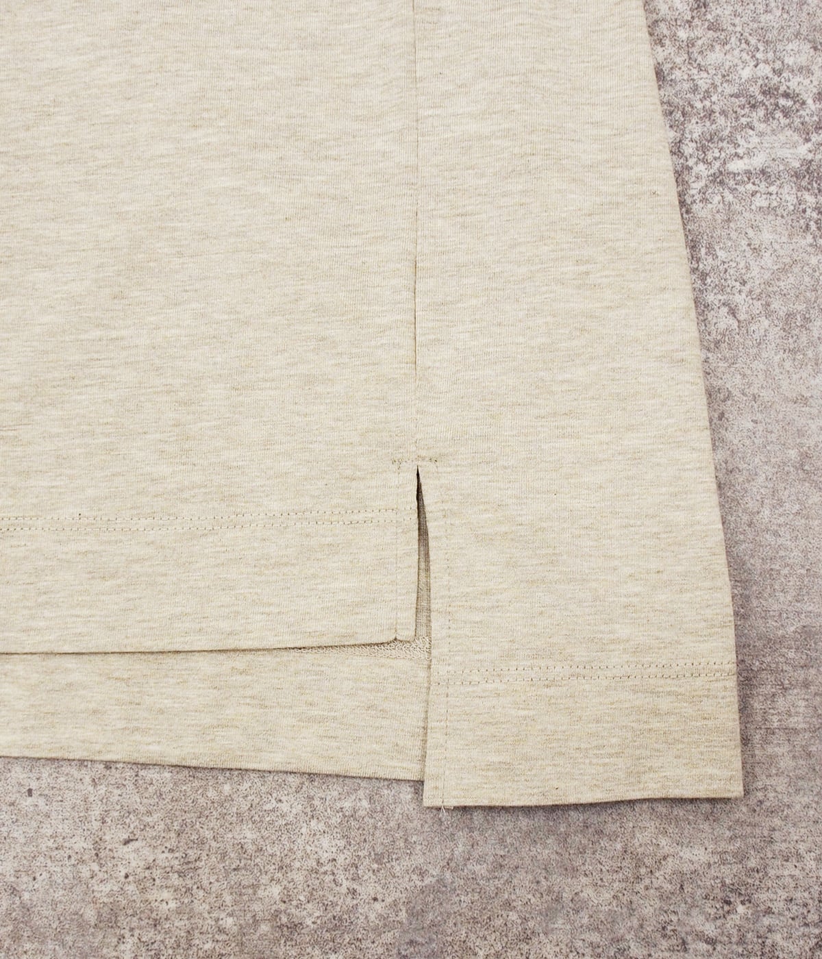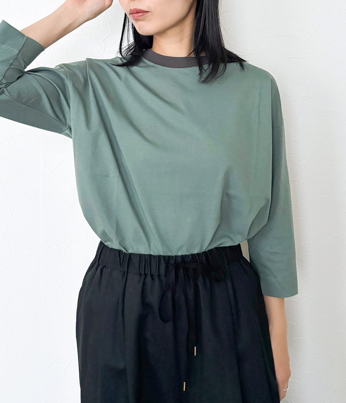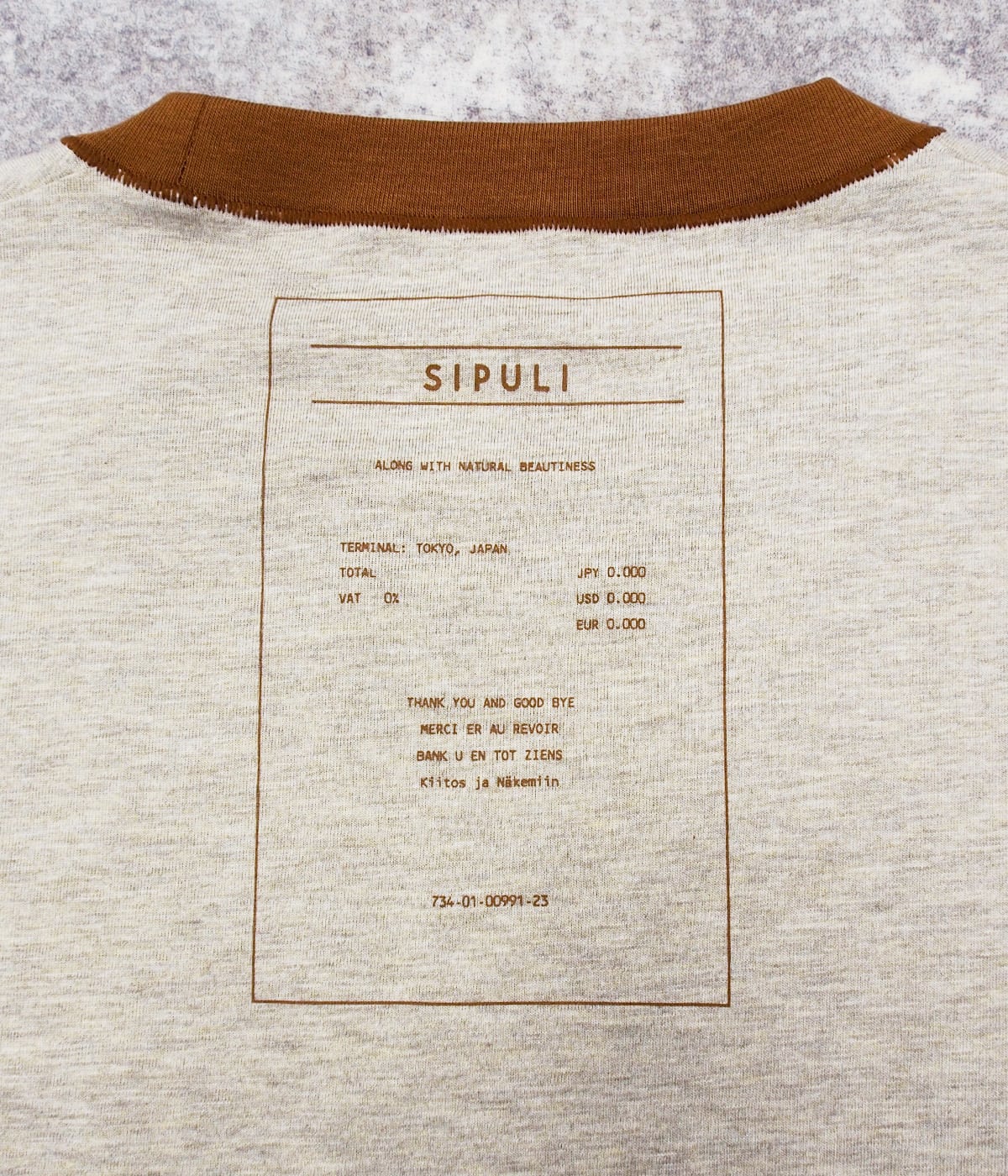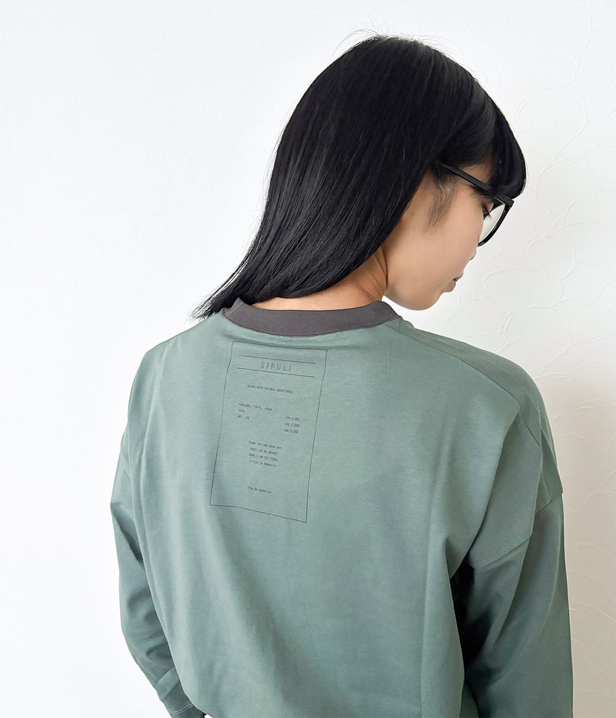 7分袖のクルーネックプルオーバー。ゆったりシルエットのルーズな着心地ながら、肩のドロップは程よく抑え、カジュアルになりすぎないバランスに仕上げています。襟ぐりは同じ糸でフライス切り替えを施し、接ぎ目には特殊ミシンによるルーズロックで手縫いのような表情をプラスしました。バックプリントには、シプリのKeittoグループのカットソーにも使用しているネームをプリント。レシートを模した遊び心あるデザインで、四か国語で「サンキュー&グッバイ」が記載されています。