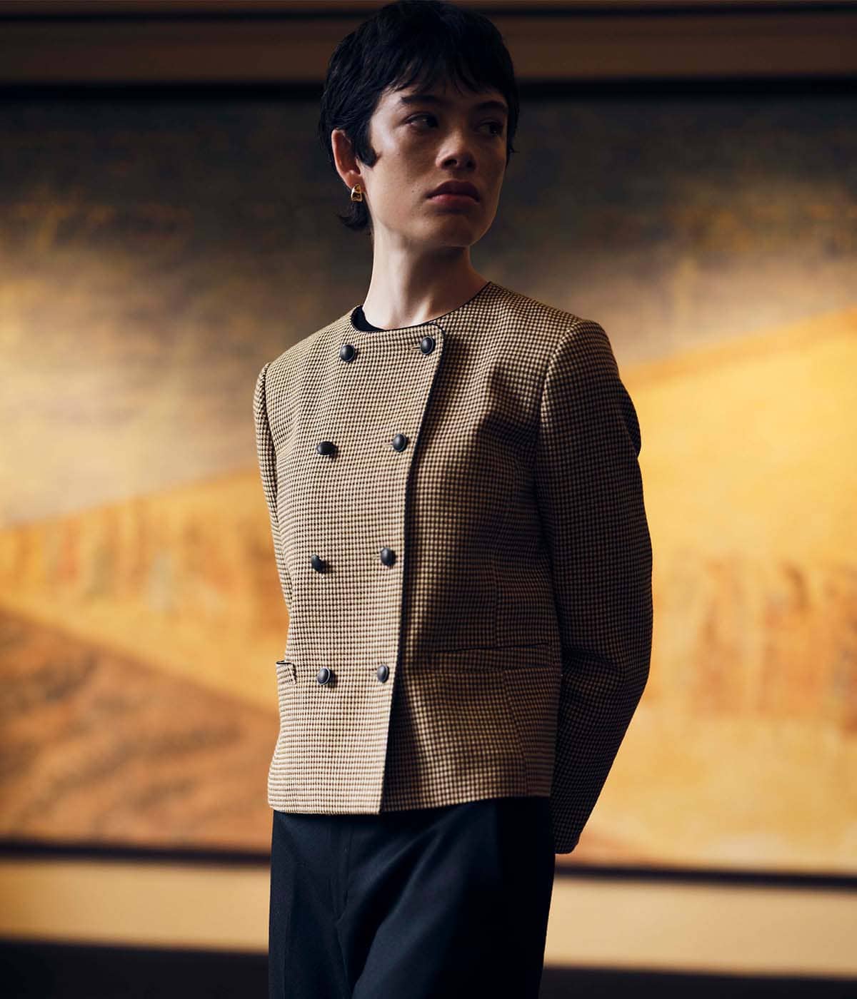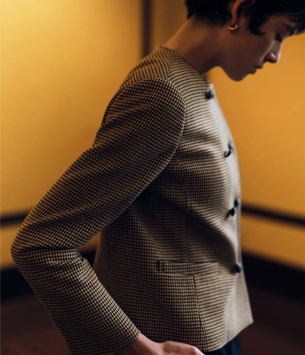 ダブルブレストのノーカラージャケット。生地に馴染む落ち着いた光沢感のメタル釦を配し、クラシカルな雰囲気に仕上げました。襟ぐりと前端、ポケット口にはパイピングを施し、輪郭をはっきりとさせることでシャープな印象に。コンパクトな着丈で、デザイン性がありながらも軽やかにお召しいただけます。裏地あり。ポケットあり。
