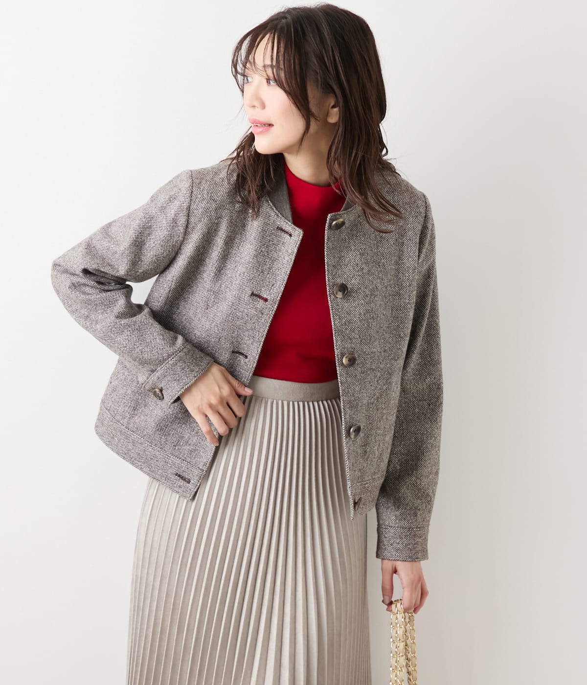 秋から冬にかけての羽織りとして活躍する、きちんと感とリラックス感を兼ね備えたツイードブルゾン。カジュアルなシルエットながらもツィードを使用することで品のあるアイテムに。オフィスではジャケット感覚で、休日にはリラックスした羽織りとして、オンオフ問わず着まわしを楽しめます。同素材のキュロット(品番:51336162)やテーパードパンツ(品番:51316162)とのコーディネートで、洗練されたセットアップスタイルもお楽しみいただけます。知的でクールな印象を楽しめるライトグレー、シーズンムードを高めてくれるブラウンの2色展開。