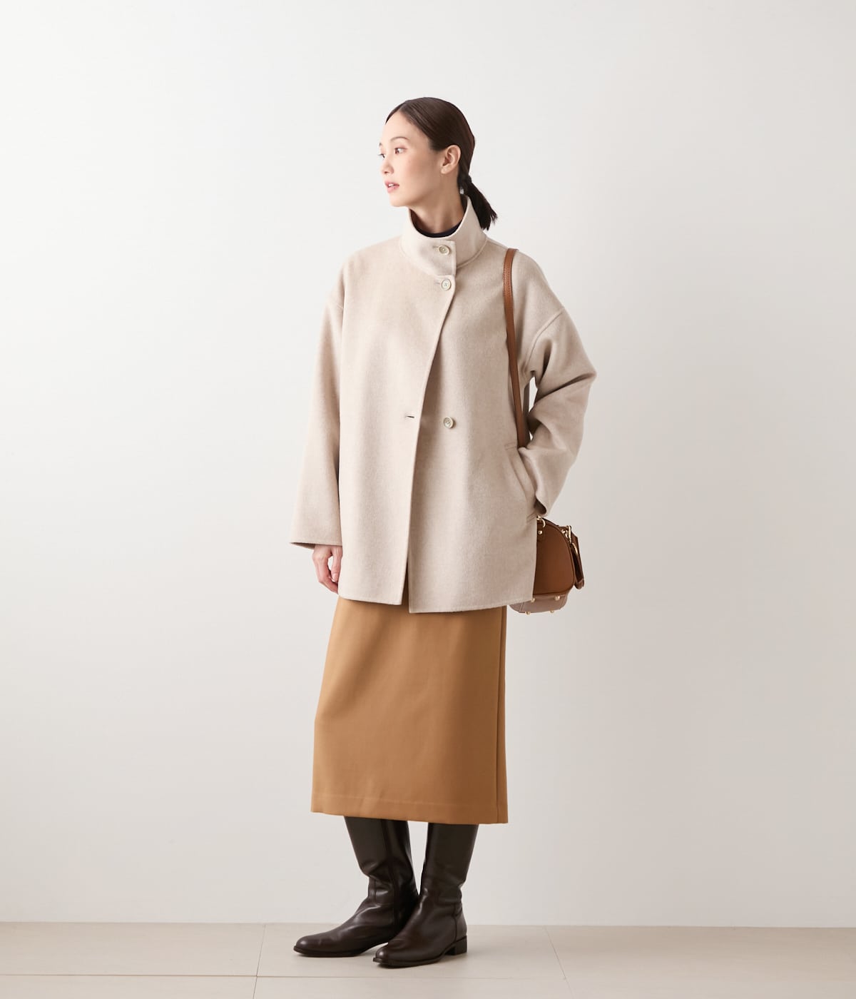 ウールをブレンドしたダブルクロス素材を使用。程良い肉感で体のラインを拾いすぎず、上品な落ち感を演出します。ウール混ならではのあたたかさと、生地のストレッチ性により快適な着心地を実現しました。ご自宅で手洗いできる、お手入れのしやすさも魅力。