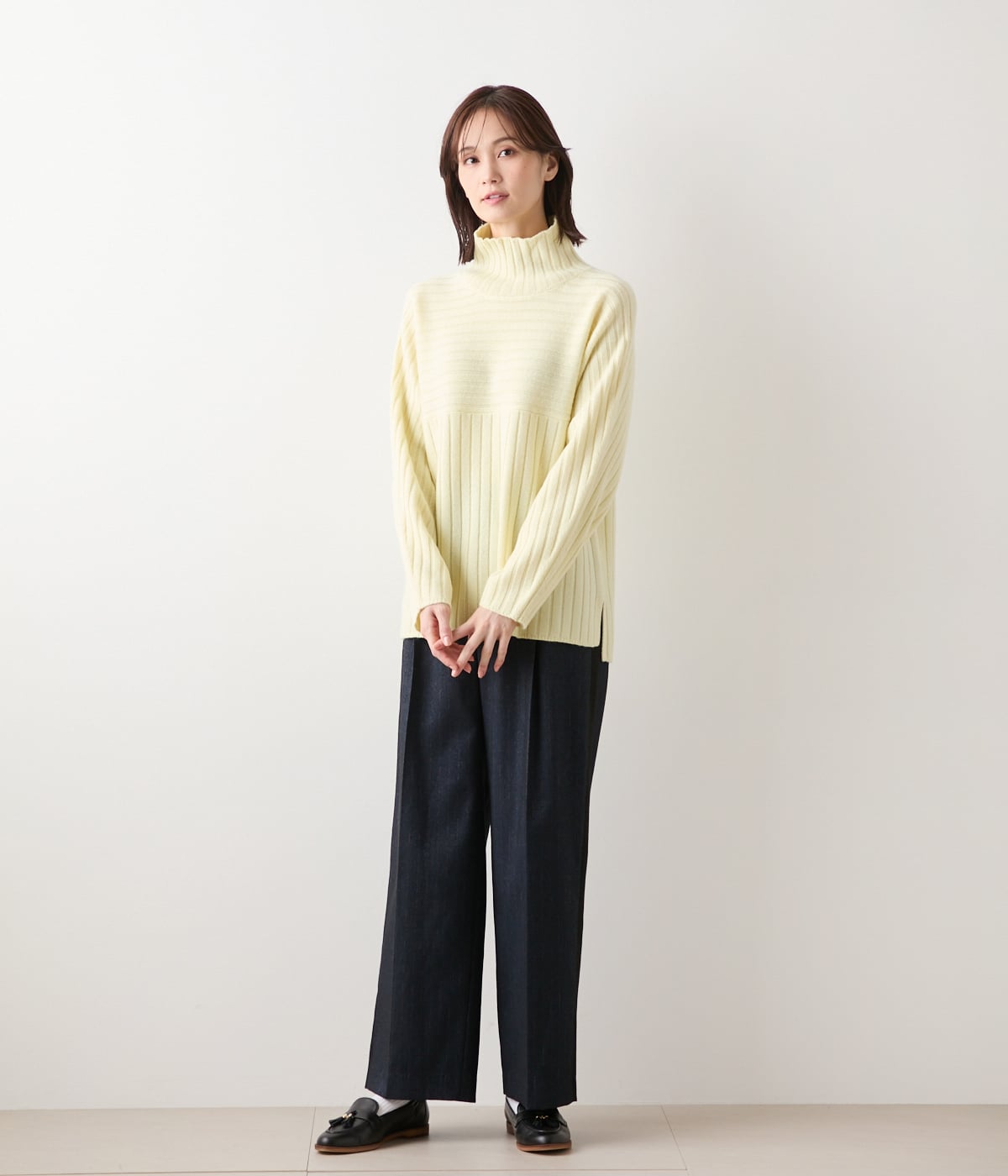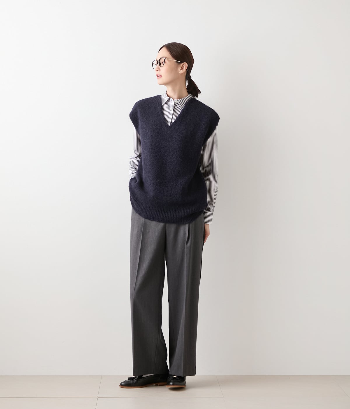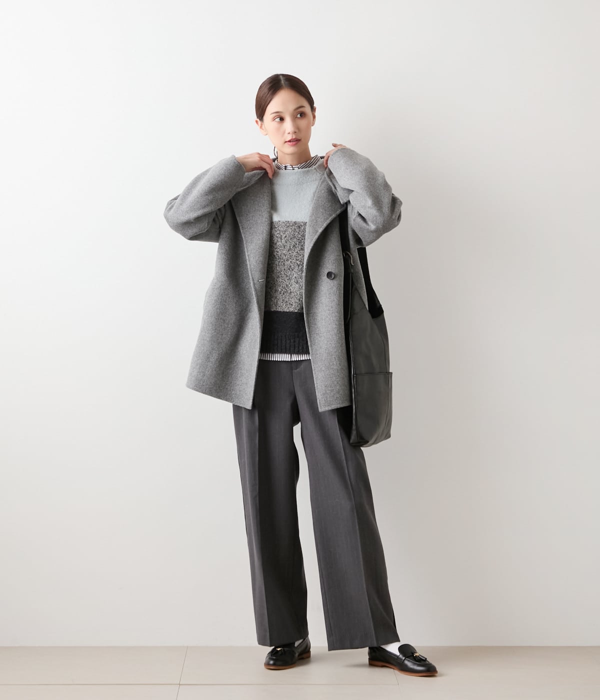 シャンブレー調のデニムっぽさを表現した、デニム調メランジストライプ生地を使用。ウールのあたたかさとほどよい光沢感があり、カジュアルな印象になりすぎず上品な風合いです。また、きれいめな風合いながらもストレッチが効いており、着心地の良さもポイント。