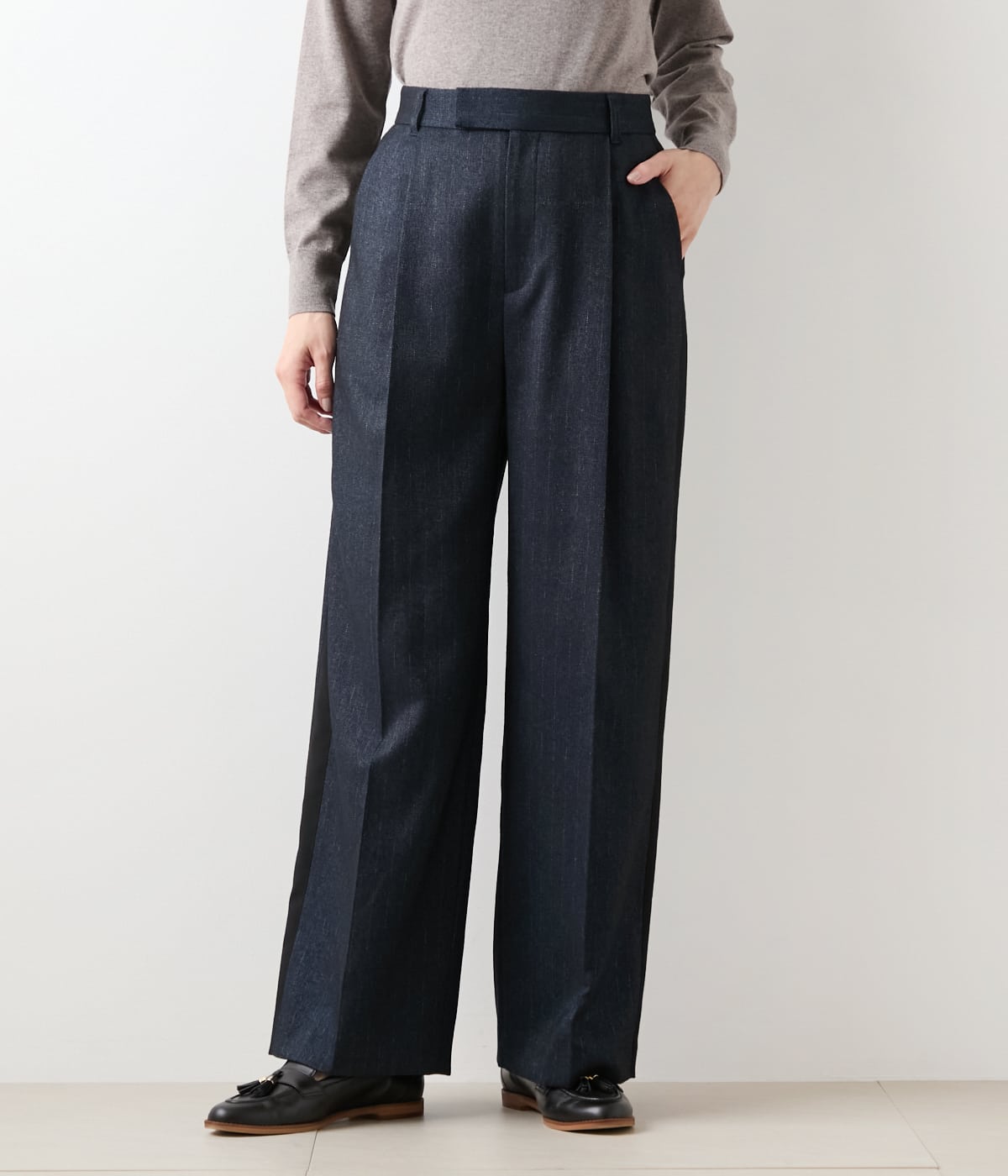 シャンブレー調のデニムっぽさを表現した、デニム調メランジストライプ生地を使用。ウールのあたたかさとほどよい光沢感があり、カジュアルな印象になりすぎず上品な風合いです。また、きれいめな風合いながらもストレッチが効いており、着心地の良さもポイント。