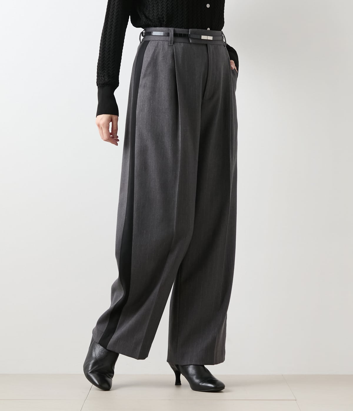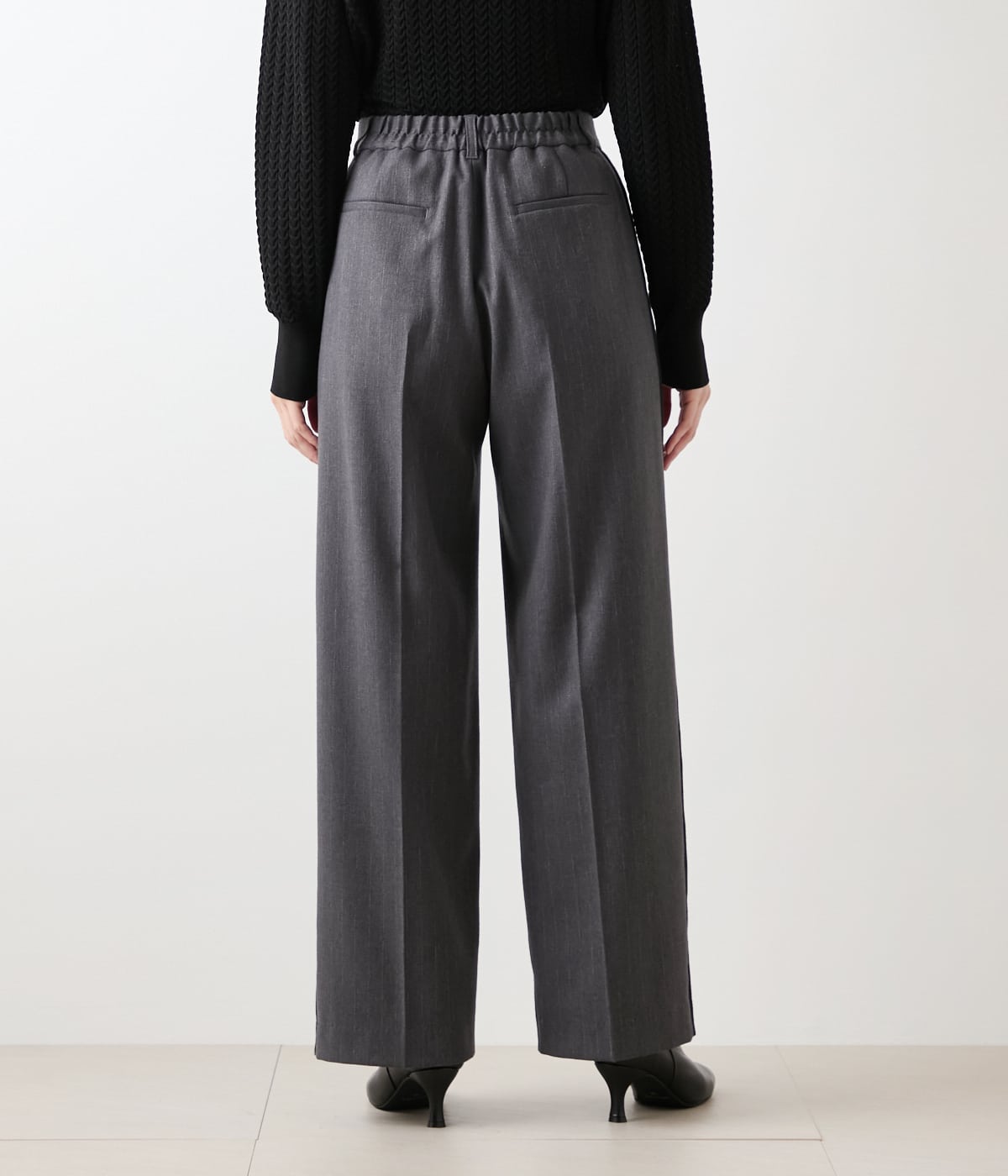 ワンタック入りのワイドシルエットで、体型を拾いにくく美しいレッグラインを演出。脇にさりげなくあしらったブラックのラインは、スポーティなムードを漂わせつつも強調しすぎず、コーディネートに馴染みやすいデザインです。さらに、後ろウエストがゴム仕様のため、締め付けすぎず快適な穿き心地をサポートしてくれます。ポケットあり。裏地あり。