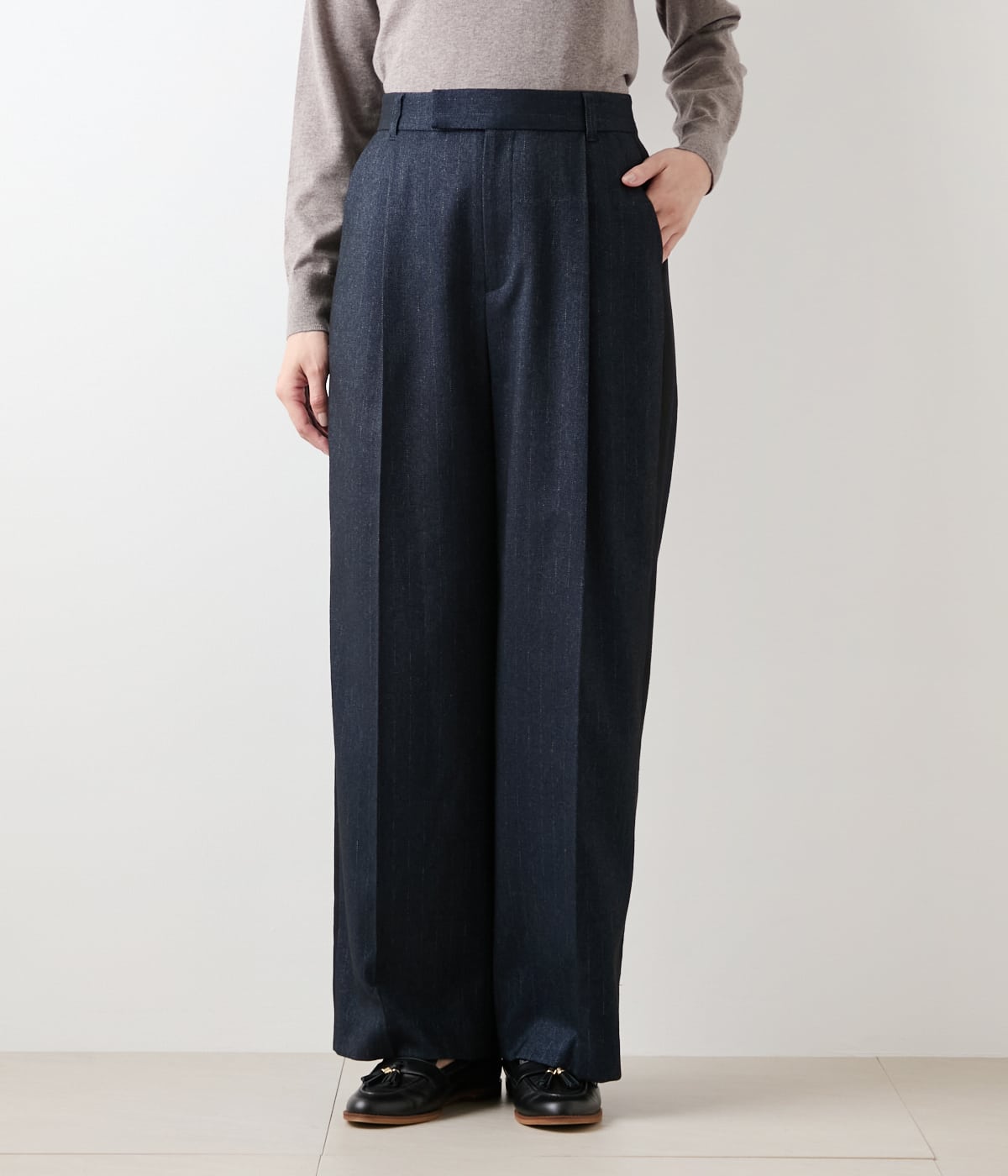 【ストレッチ】デニム調メランジストライプ サイドラインタックパンツ ネイビー