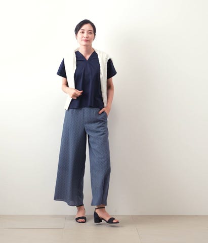 モロッコタイルをモチーフにしたプリントが華やかな、リゾート感あふれるキュロットパンツ。シンプルなカットソーやニットを合わせるだけで季節感が高まる、日常使いしやすいアイテムです。カラーはインディゴ風の落ち着いたネイビーで、デニム感覚でお召しいただけます。
