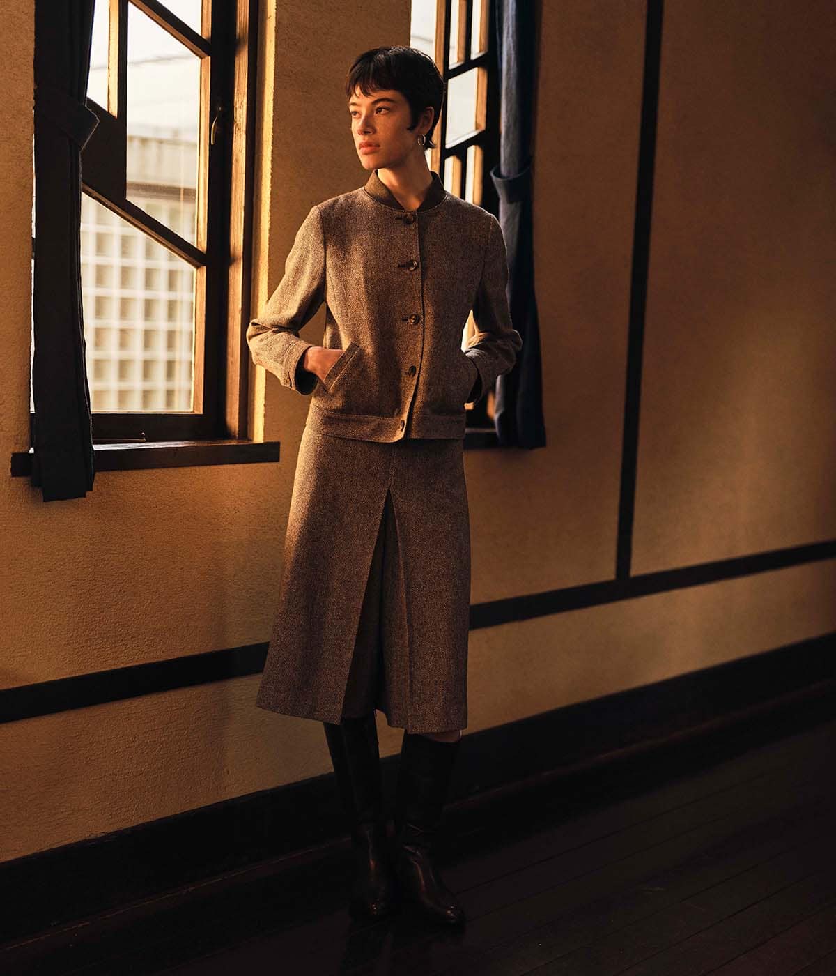 尾州産地で織り上げたオリジナルの変形ヘリンボーンツイードを使用。さりげないカラーネップを散りばめ、上品さの中に表情をプラスしました。肉感は厚すぎず薄すぎないため、軽やかでありながら安心感のある着心地。ナチュラルなストレッチが効いているのもポイント。