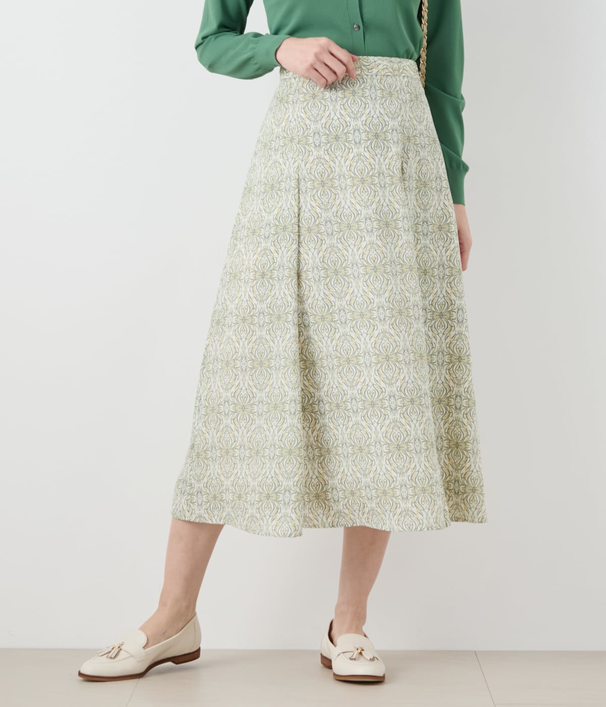 ミモザの花を思わせる幾何学柄が華やかなワンピース。1枚で季節感を高め、リラクシーにもきれいめにも着こなせる汎用性が嬉しいアイテムです。カラーはミモザを色で表現したクリーム、ブラックウォッチをイメージしたボトルグリーンの2色展開。