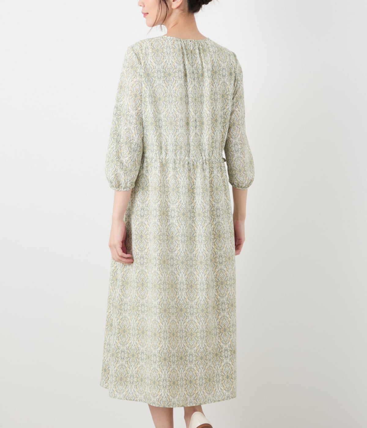 たっぷりとギャザーをあしらった7分袖ワンピース。襟ぐりを小さく、着丈を長めにし、ややモードな印象に仕上げました。後ろ側にボリュームを持たせた袖のデザインもさりげないポイント。ウエストのドローストリングは緩めるとカジュアルに、締めるときれいめなフィット&フレアにと、シルエット変化で異なる雰囲気をお楽しみいただけます。ドローストリングの端は結ばずに、あえて垂らすのもおすすめ。身頃のみ裏地あり。ポケットなし。