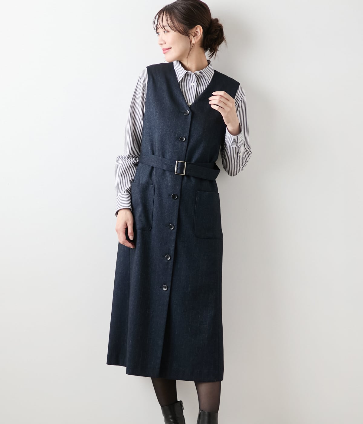 シャンブレー調のデニムらしい風合いに、ストライプをのせた生地で仕立てたジャンパースカート。すっきりとしたシルエットながら着こなしの幅が広く、オンオフ兼用で活躍するアイテムです。年末年始の食事会や顔合わせなど、きれいめなシーンにも取り入れられる汎用性の高いアイテム。合わせるアイテムを引き立て、シンプルで洗練された印象を与えるグレー・ネイビーの2色展開。