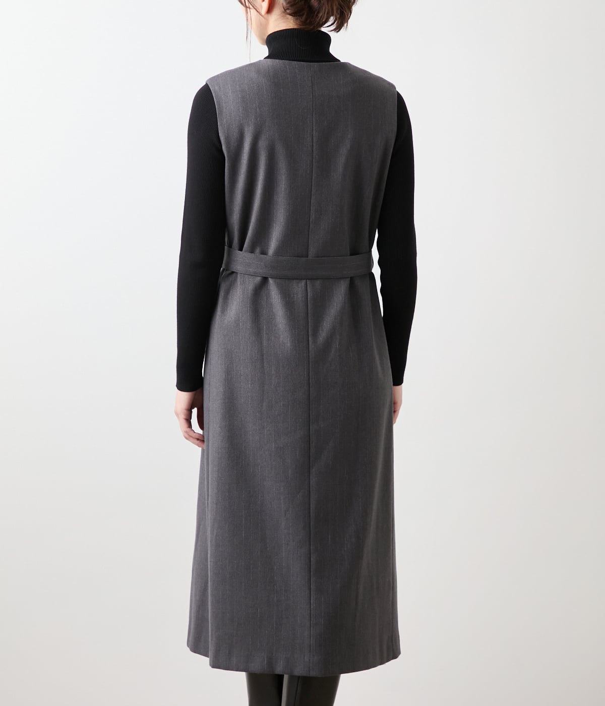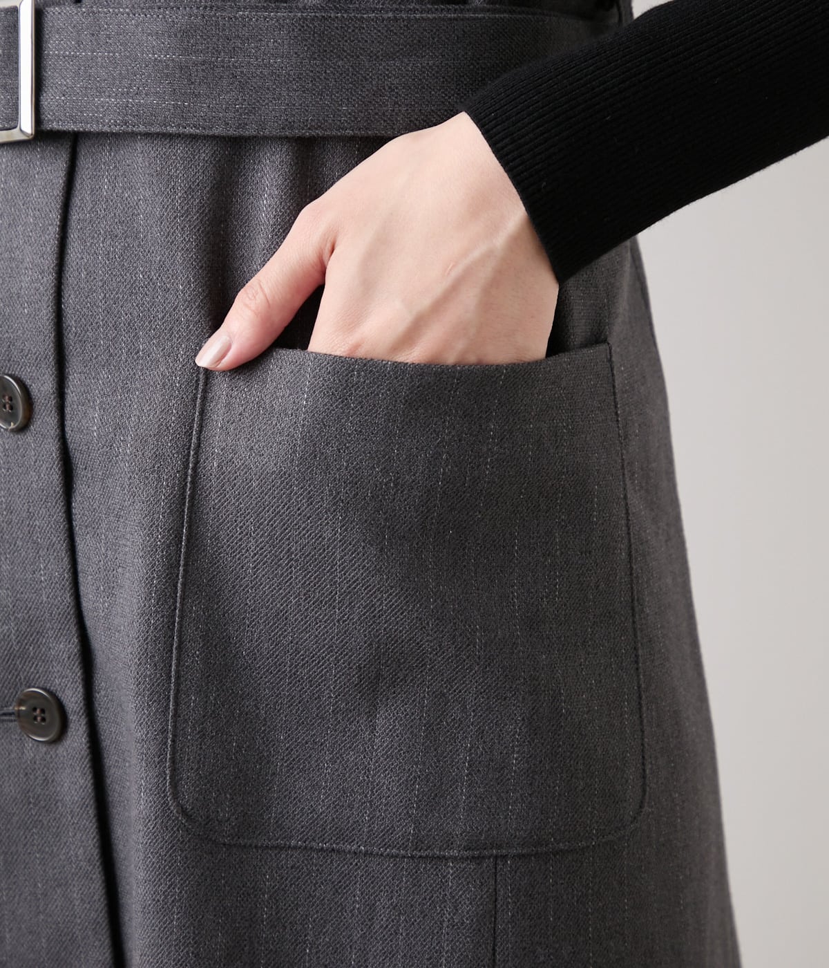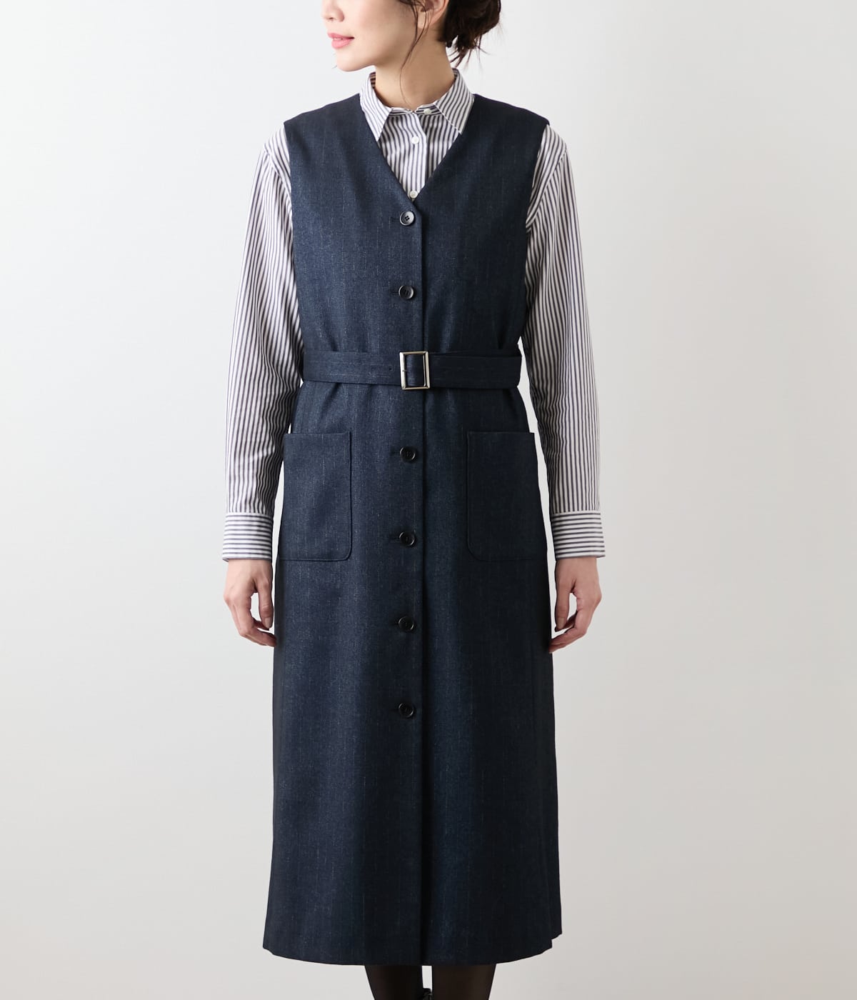 シンプルなストレートシルエットで、付属の共布ベルトを結べばウエストマークして女性らしい印象を楽しめます。フロントのボタンを開けてロングジレのように羽織るスタイルもおすすめ。同素材のパンツと揃えて、セットアップ風の着こなしも楽しめます。ポケットあり。裏地あり。