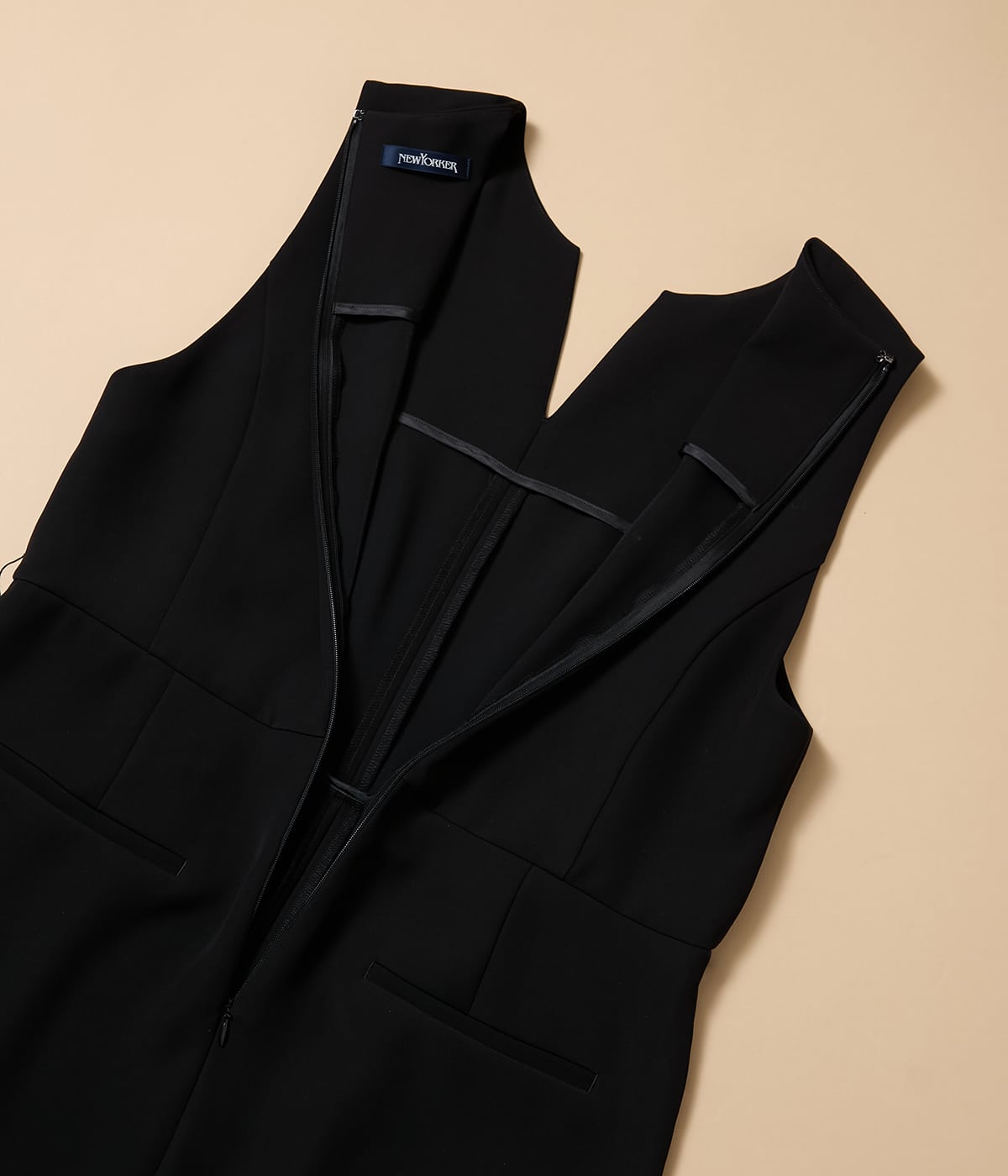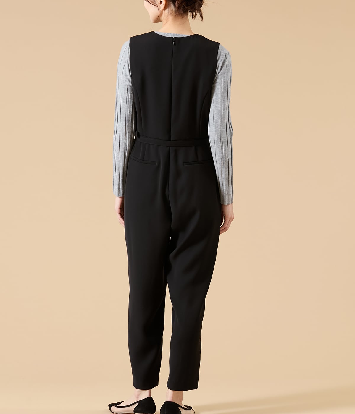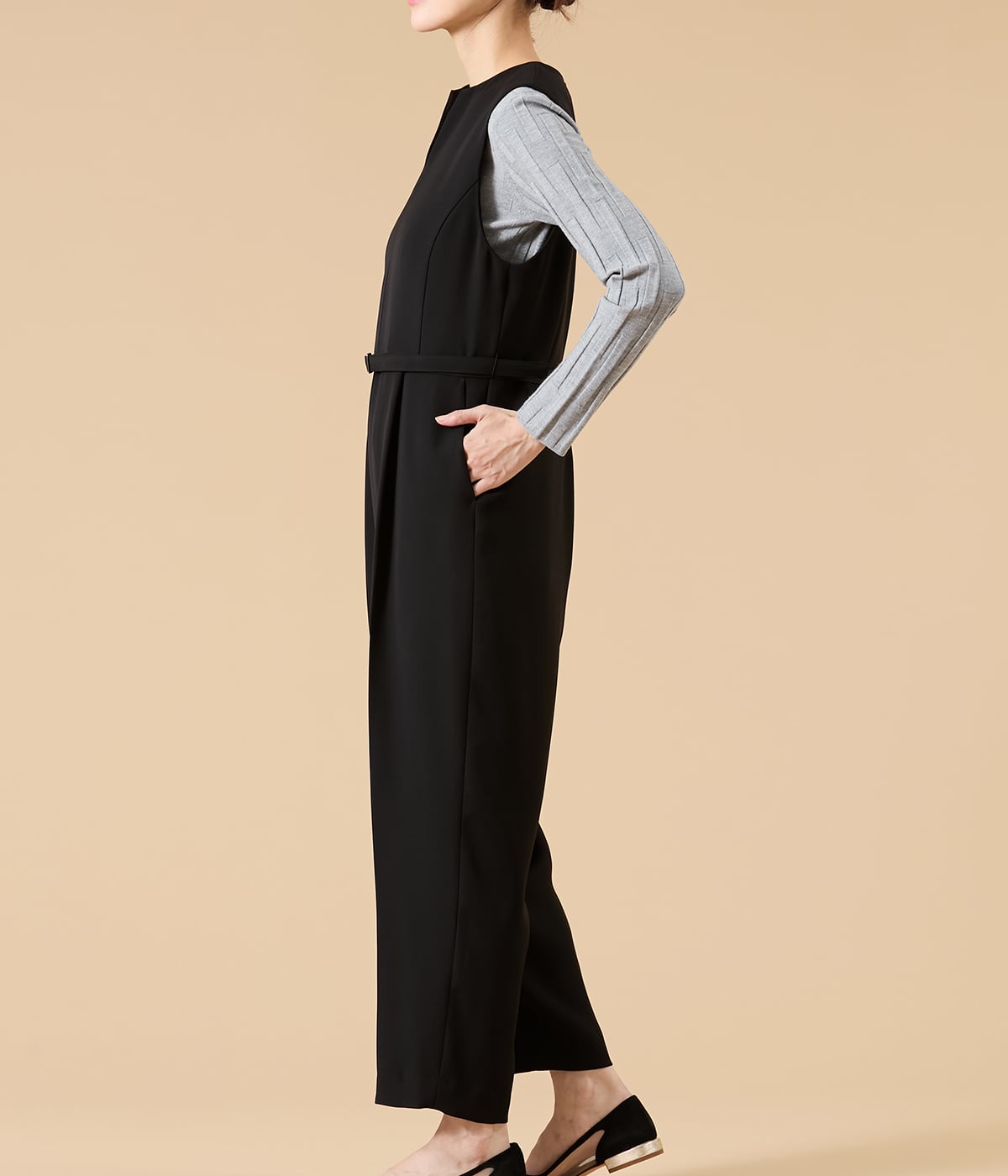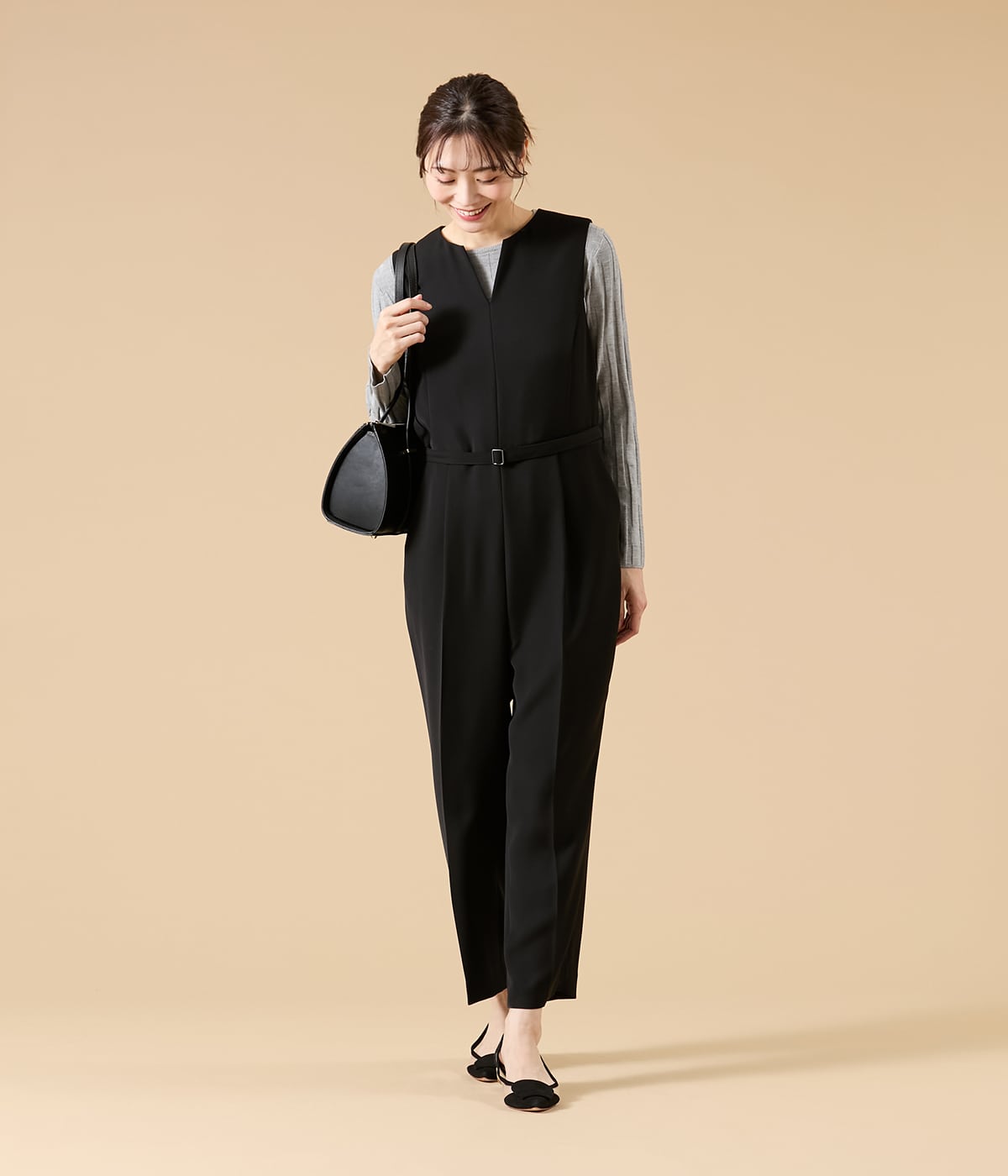 スタイリッシュさと着心地の良さを両立した、大人のためのオールインワン。ブラックがもたらす“締め色効果”で全身をすっきり見せつつ、インナーや羽織りのレイヤード次第で、きれいめにもカジュアルにも表情を変えるマルチなアイテムです。