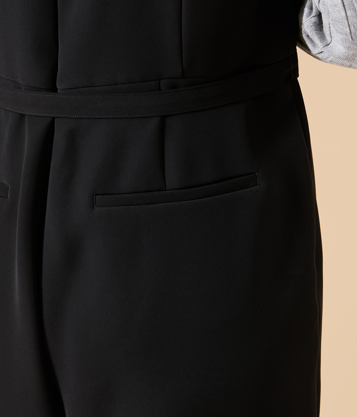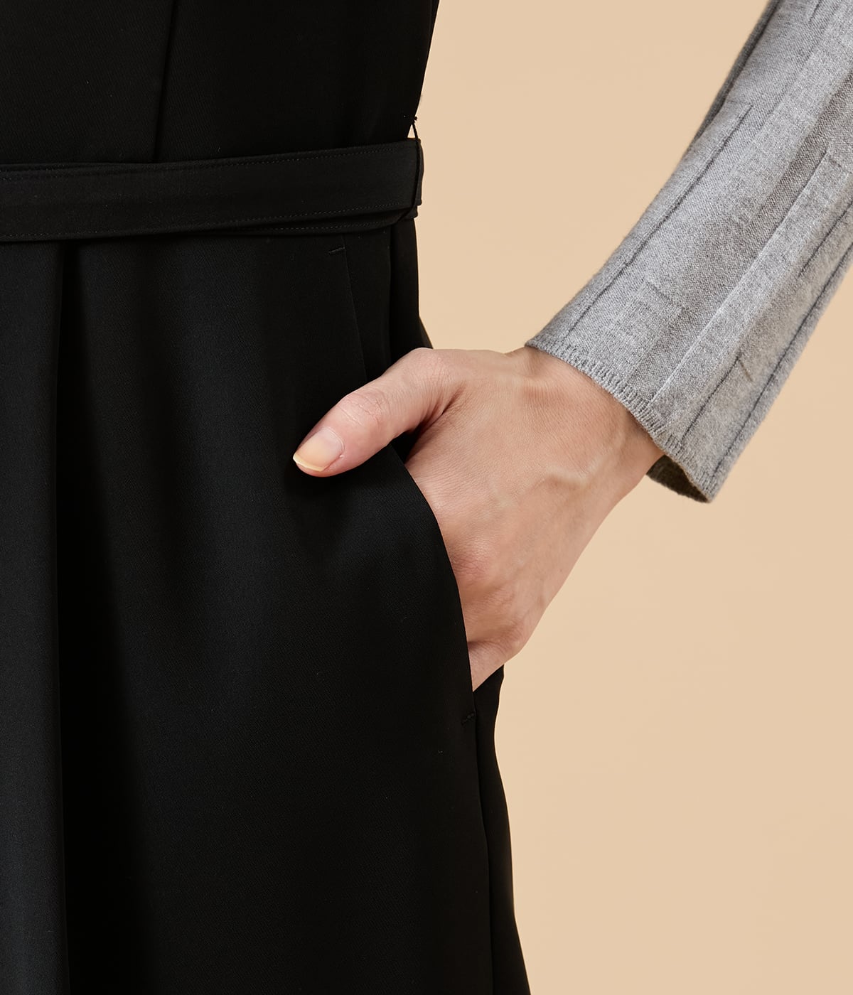 胸元は抜け感をプラスしてくれるキーネック、身頃はパネル切替えですっきりシャープな印象に。ボトムはタック入りの程よいテーパードシルエットを採用し、下半身をすっきり見せてくれます。また、共地ベルトでウエストマークすれば、メリハリのあるシルエットにアレンジが可能です。裏地なし。ポケットあり。