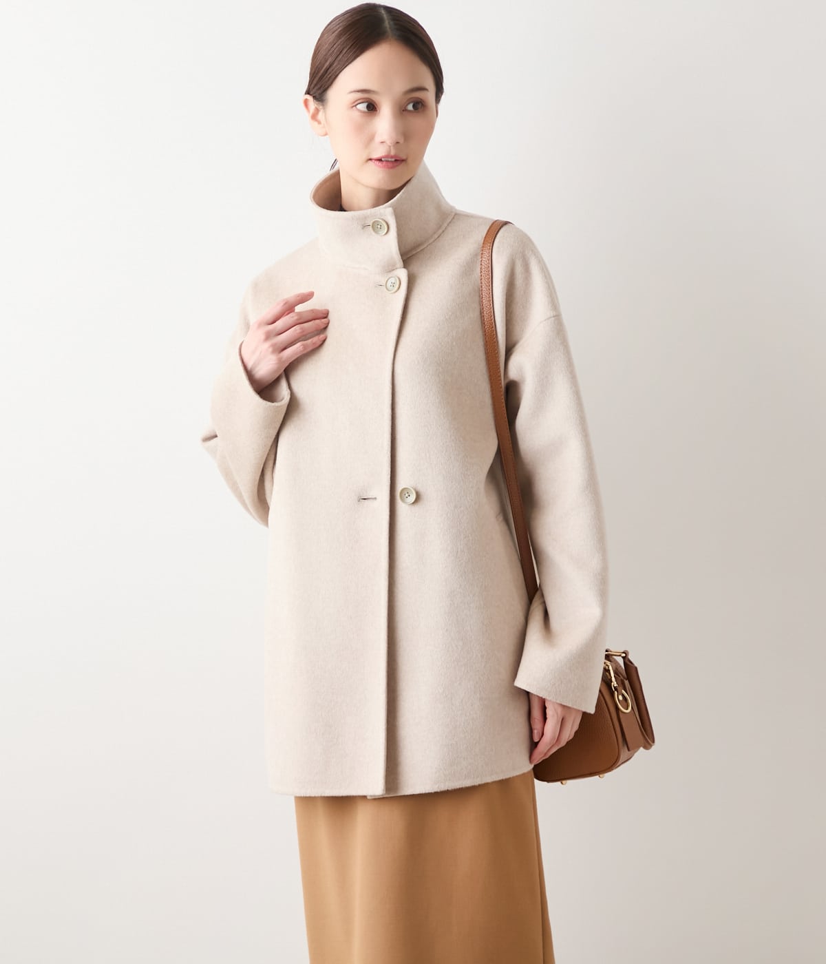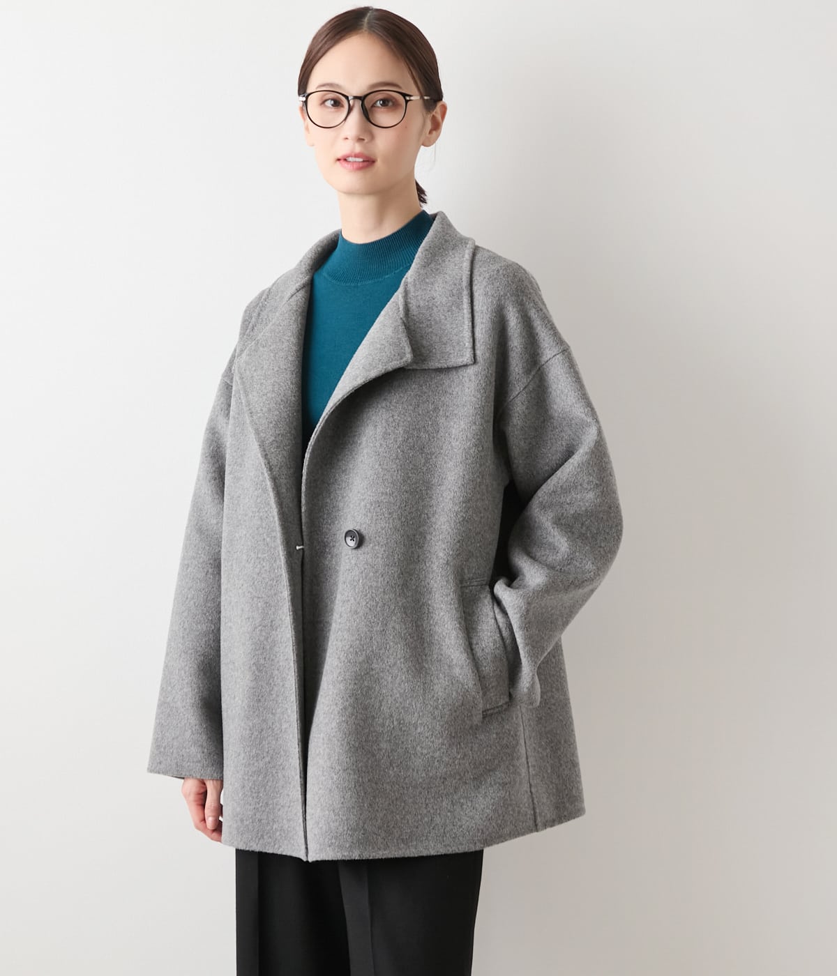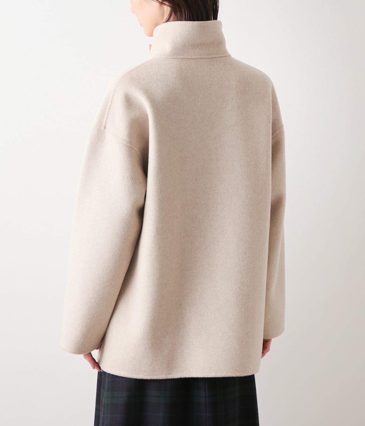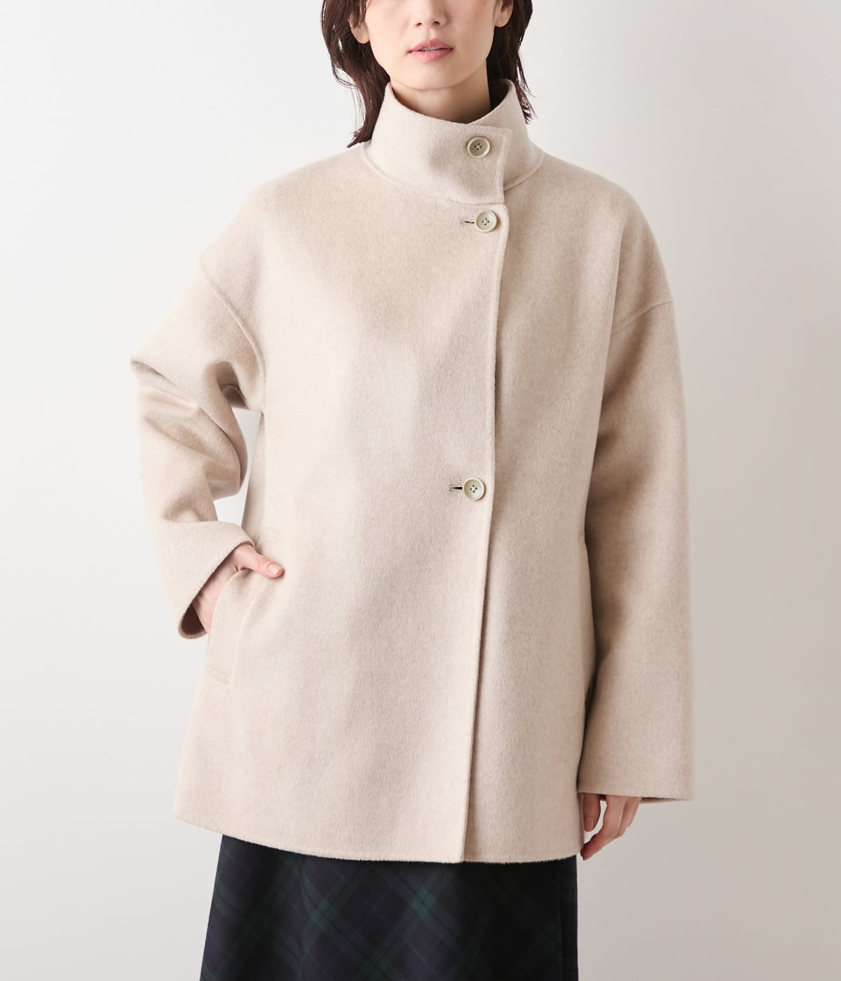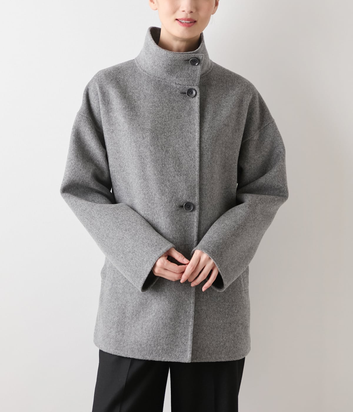 オンにもオフにも映える、凛とした品を纏うスタンドカラーのショートコート。細番手のウールを贅沢に使用し、ナイロンをブレンドすることでやわらかさと耐久性を両立したリバー素材を使用。軽やかな着心地ながら、ふんわりとしたあたたかさに包まれます。通勤やオケージョン・普段のお出かけまで。シーンレスに寄り添う、上質感漂う大人のきれいめコートです。清潔感がありながらも都会的な洗練された印象のグレー、ソフトで落ち着きを感じさせる優しいグレージュの2色展開。