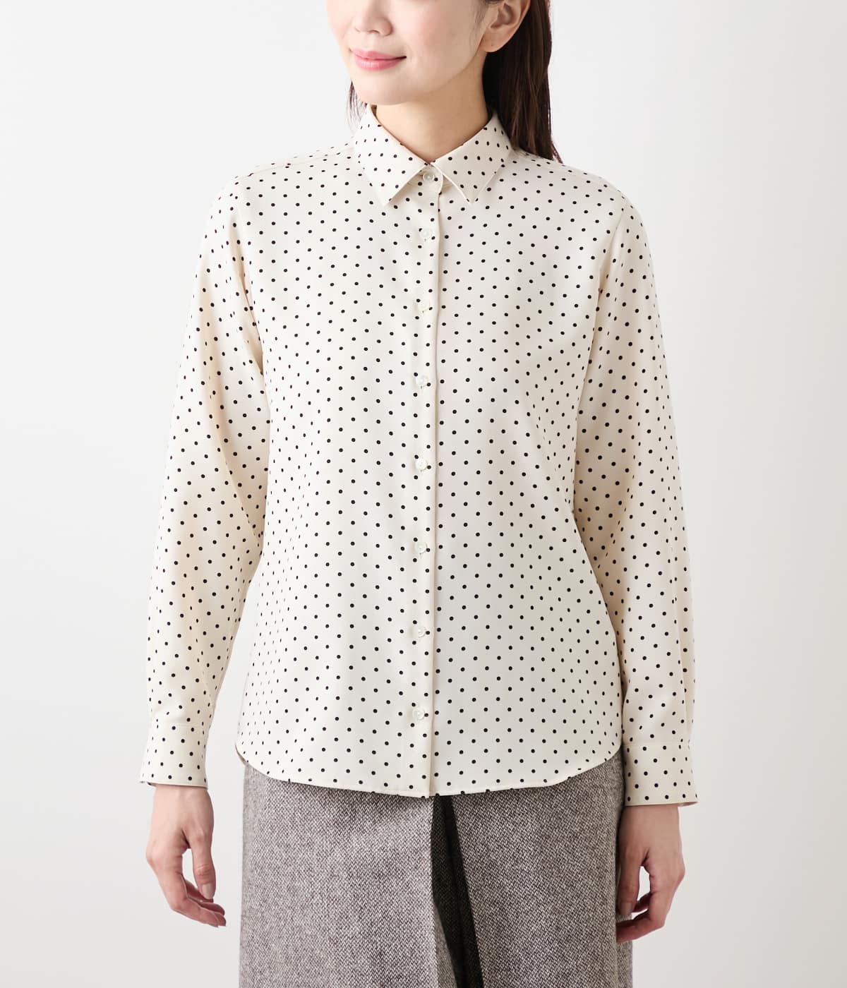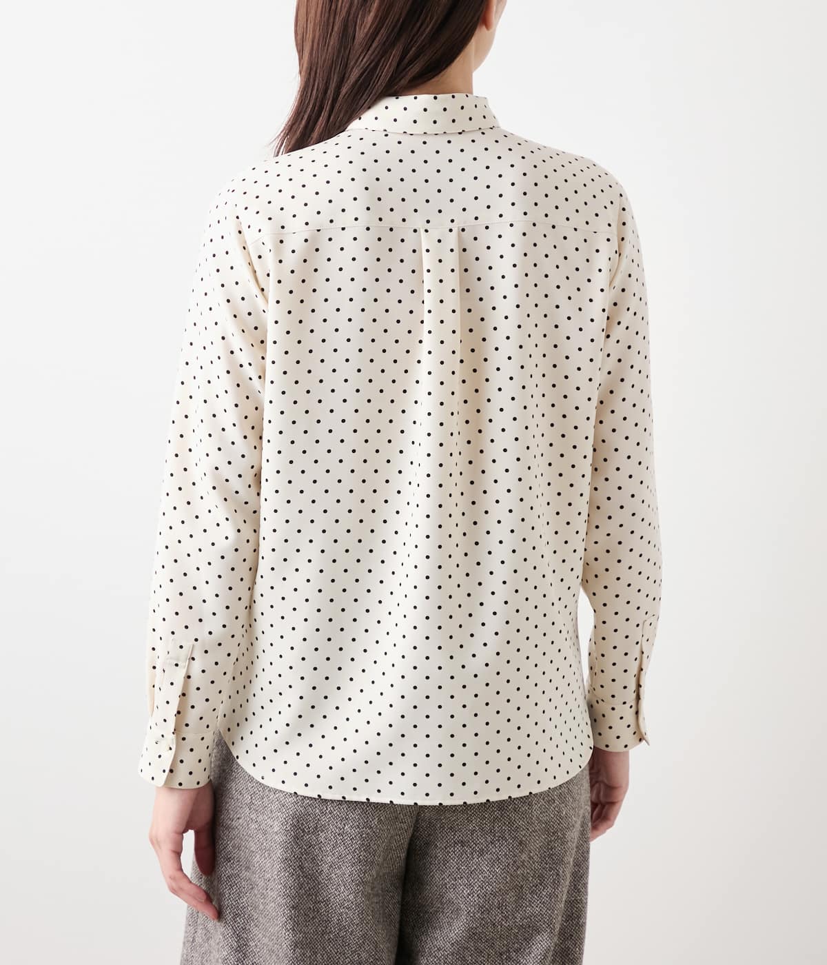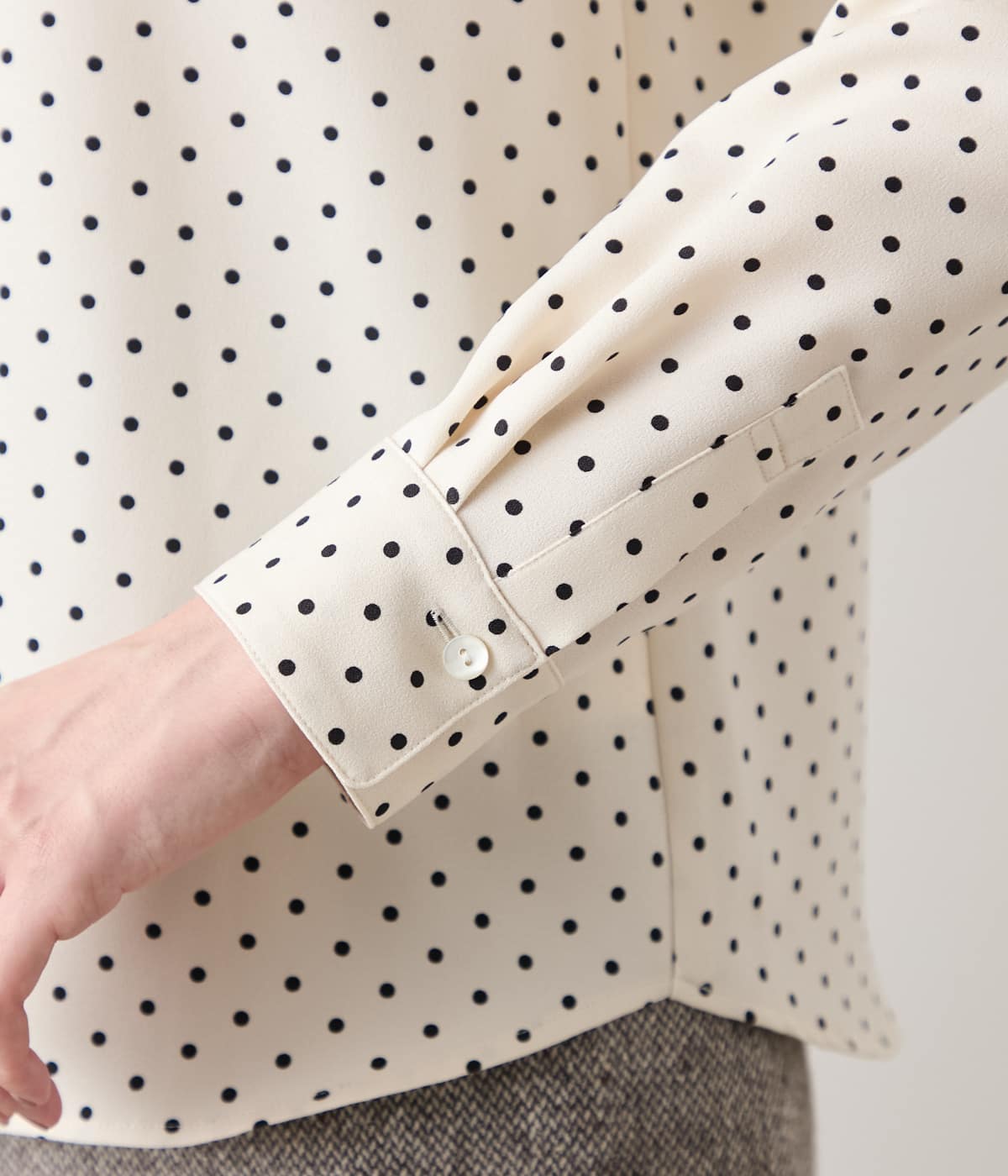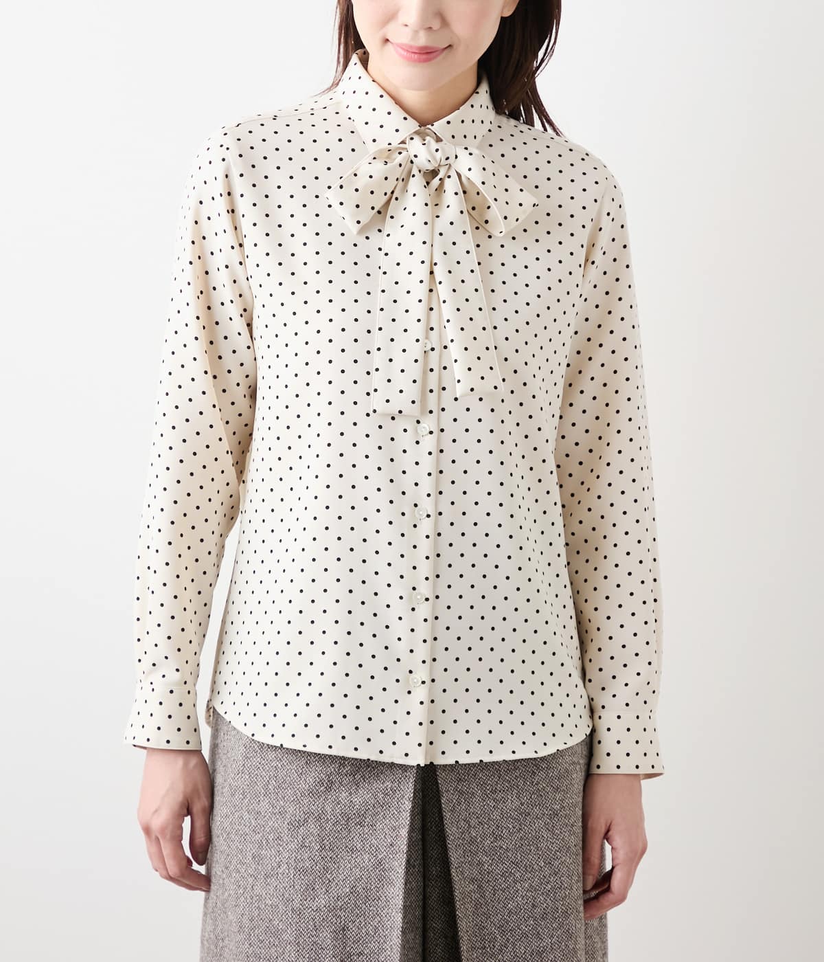 上品なドットプリントが、纏うだけで着映えするボウタイブラウス。ジャケットのインナーとしてはもちろん、ジャンスカなどとのレイヤードにも一役買ってくれる優秀アイテム。ボウタイは取り外し可能なので、オンオフ関係なくスタイリングの幅を広げてくれます。ベーシックに着回ししやすいアイボリー、シックで大人な印象に導くネイビーの2色展開。