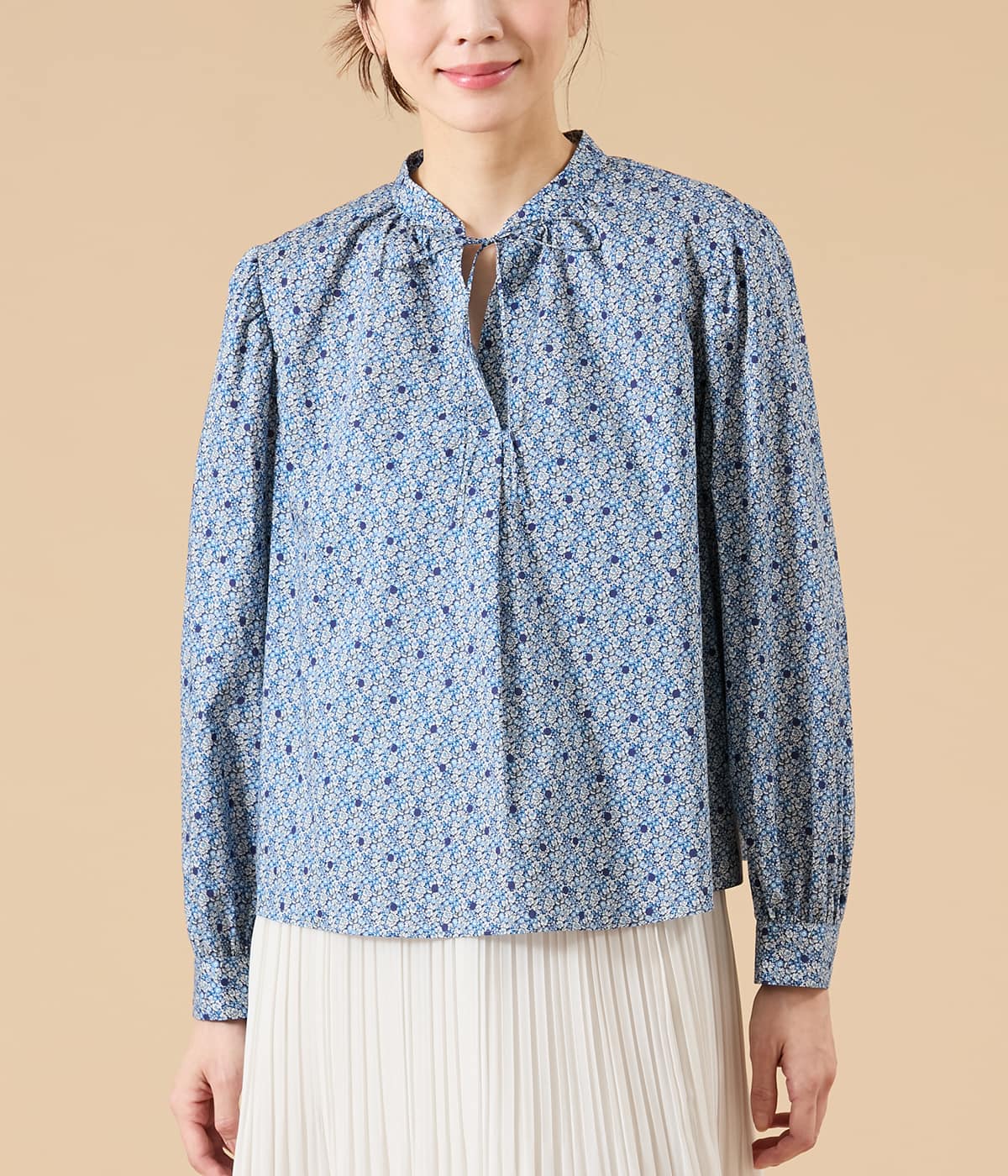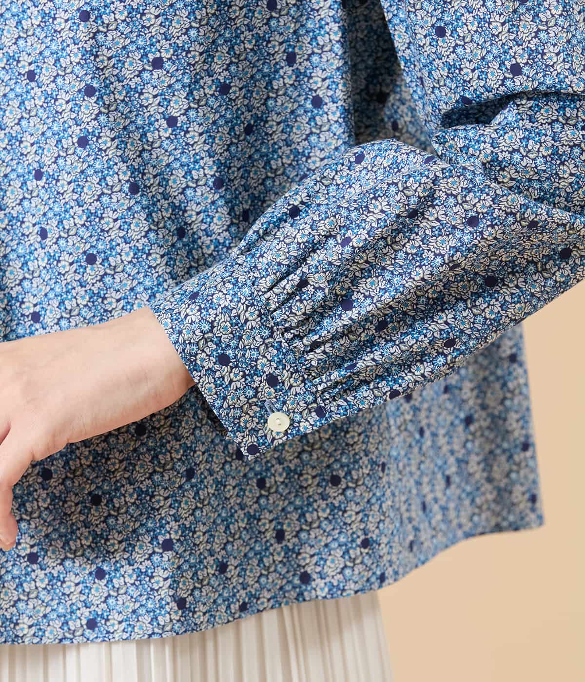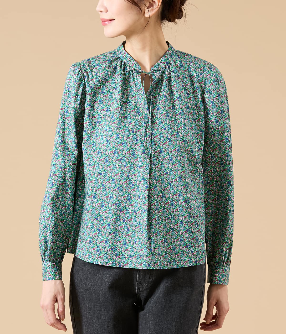 細やかなボタニカル柄に水玉模様の遊び心を忍ばせた、リバティプリントの華やぎブラウス。鮮やかさとほど良い可憐さが共存し、寒い季節のスタイリングに“ぱっと花が咲くような”明るさを添えてくれます。フレッシュな彩りで顔映りもばっちりなグリーン、品のある落ち着きが知的な印象のブルーの2色展開。