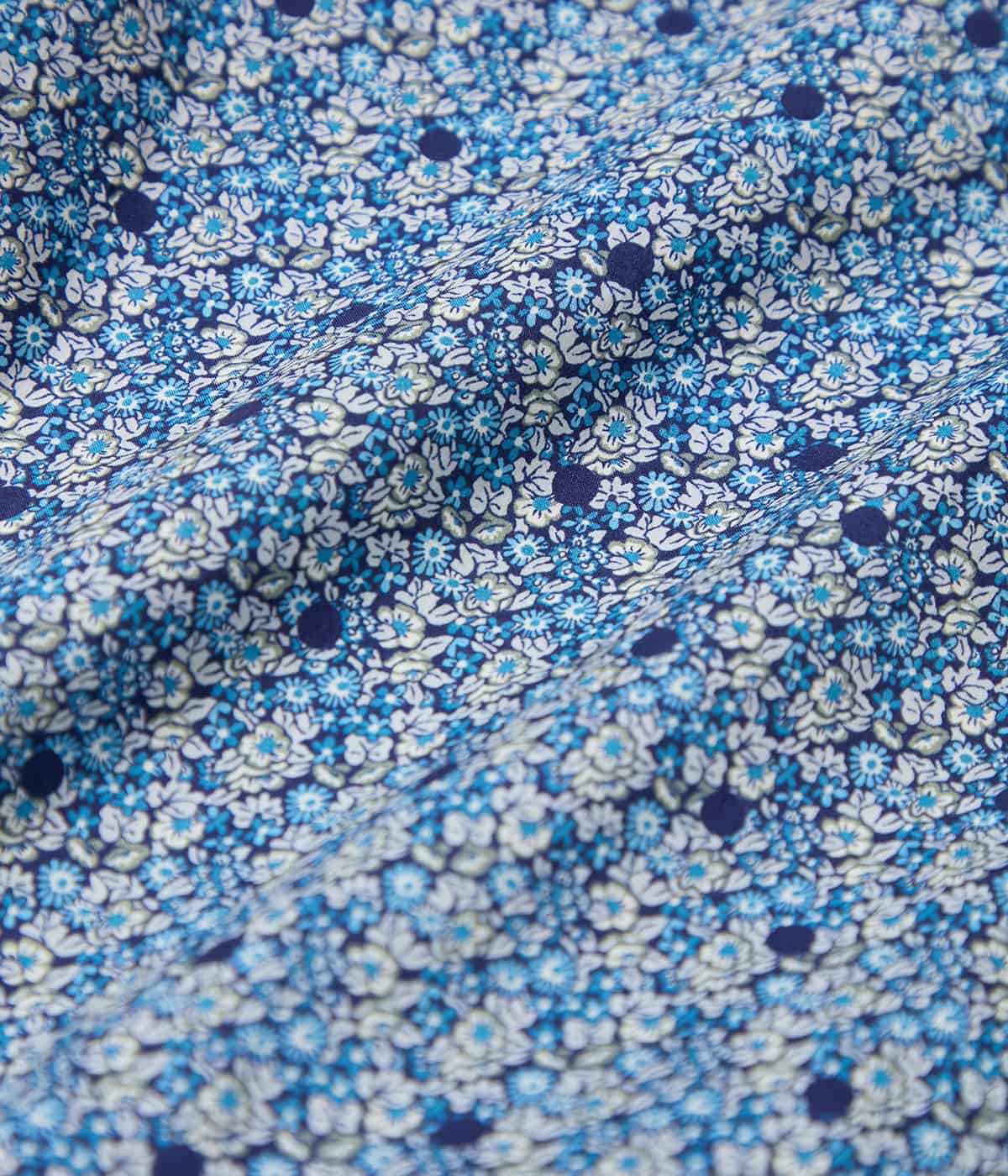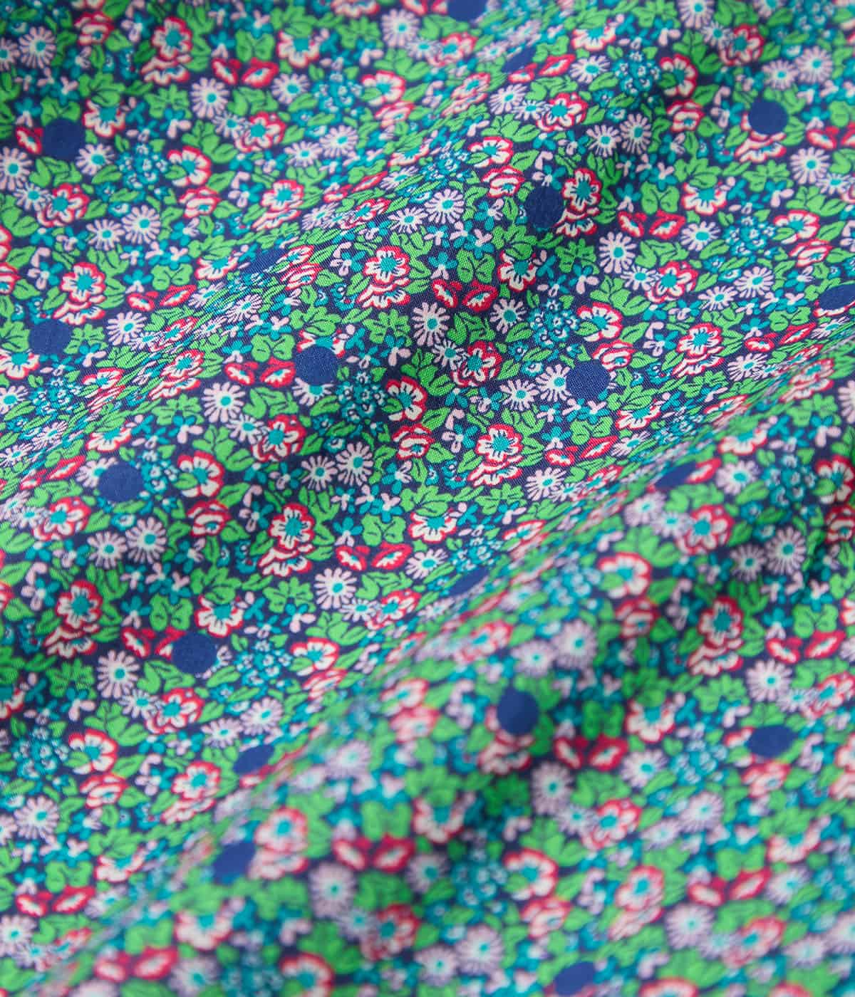 リバティ社のエターナルコレクション「Abasan Spot(アバサン・スポット)」をチョイス。ヒナギク・バラ・アサガオなど複数の花を組み合わせた緻密なボタニカルに、水玉のリズムを加え再構築したプリントです。遠目にはテクスチャー生地のように見える奥行きがポイント。生地はしなやかで上質な綿100%タナローンで、軽さと肌触りの良さが特徴です。