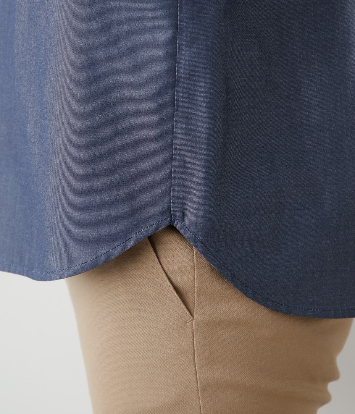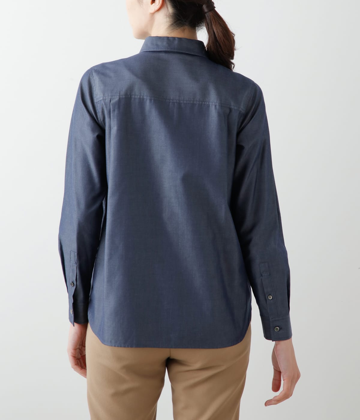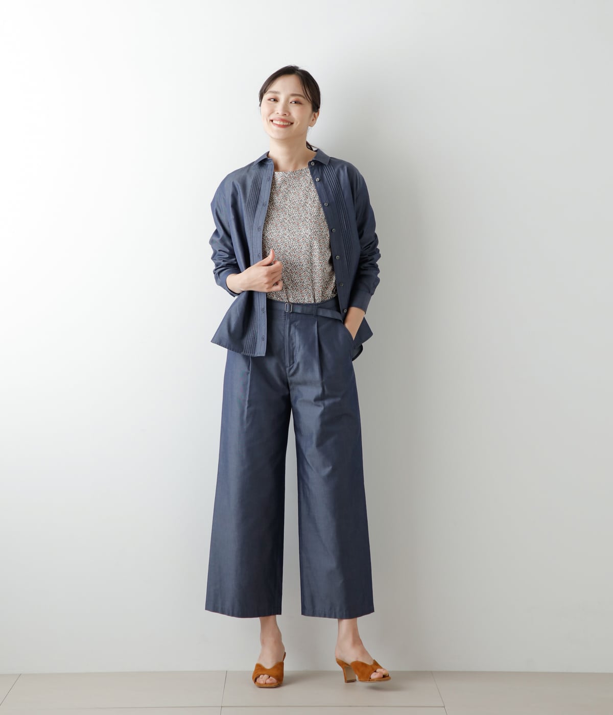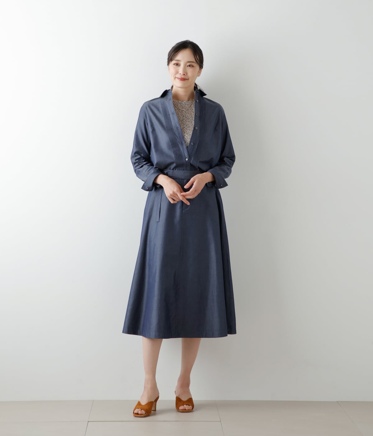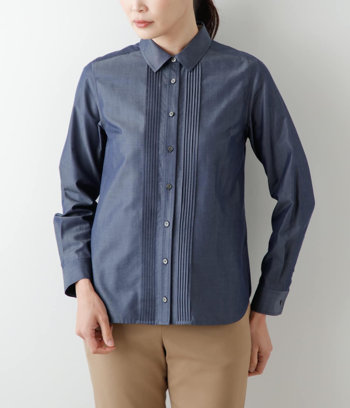 光沢感が上品なダンガリーのピンタックシャツ。1枚ではもちろん、ニットのインナーから羽織り使いまで、ロングシーズン着回せるマルチなアイテムです。同素材ボトムとのセットアップスタイルもおすすめ。カラーはベーシックに着回せるネイビーをご用意いたしました。