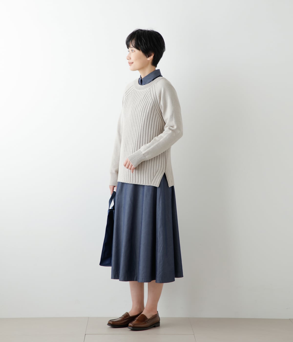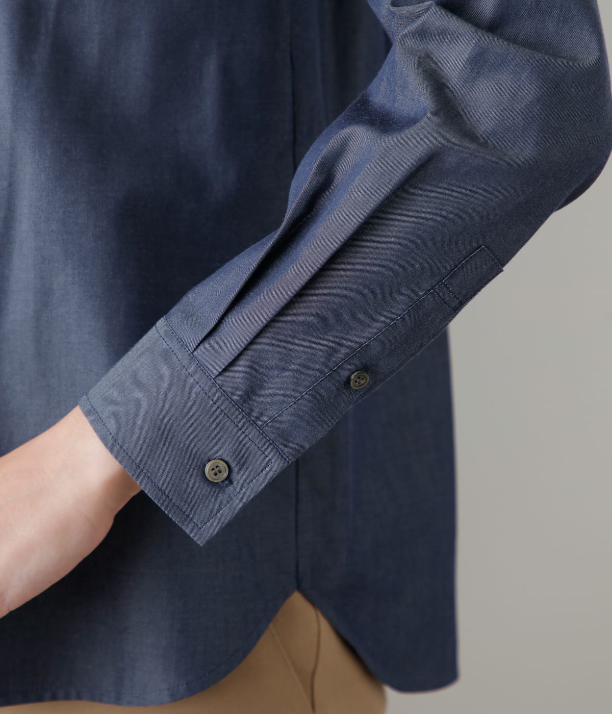 コットンと再生繊維を使用したダンガリー生地。表面に光沢を持たせ、カジュアルに見えがちなダンガリーを上品な面持ちに仕上げました。また、ご自宅で手洗いが可能です。