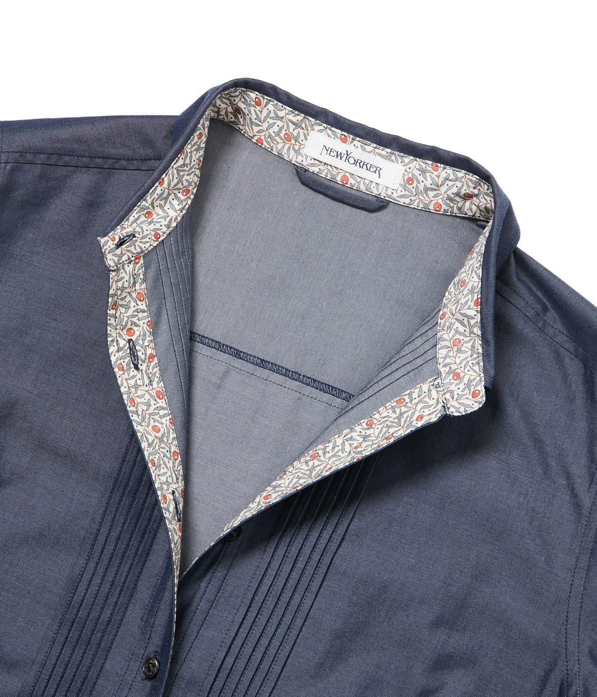 レギュラーカラーの長袖シャツ。フロントに細かいピンタックを施し、シンプルながらきちんと感のあるデザインにしています。台襟と前立ての裏には、リバティのボタニカル柄「Juniper」の生地を使用し、さりげないアクセントを添えました。
