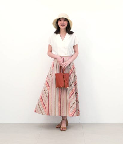 Wブレストの開襟ブラウス。デコルテをきれいに見せつつ深すぎない、絶妙な襟開きが魅力です。フレンチスリーブの丈はやや長めに設定し、二の腕をカバーしながら、涼しさもキープしています。ツヤのある貝釦もさりげないポイント。