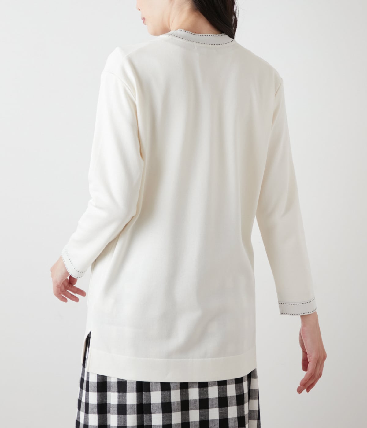 コントラストの効いた配色ステッチが目を惹くロングカーディガン。デザイン性がありながらもコーディネートしやすく、カジュアルにもきれいめにもマッチします。同素材のプルオーバー(品番:51725520)とのアンサンブルスタイルもおすすめ。カラーは汎用性の高いホワイト、ネイビーの2色展開。