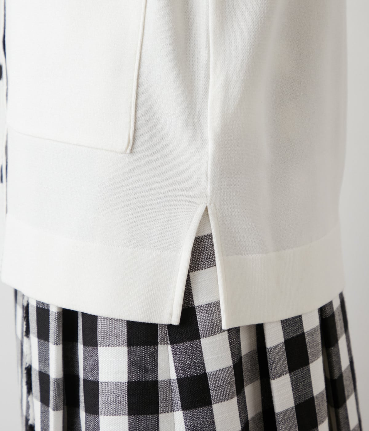 Vネックのロングカーディガン。前立てや袖口、ポケット口の配色ステッチがポイントです。ニットならではの着心地や着脱のしやすさを損なわず、伸縮性を保つため、ステッチ部分はニットのジャカード編みで表現しました。ステッチと色をリンクさせた釦使いもポイントです。