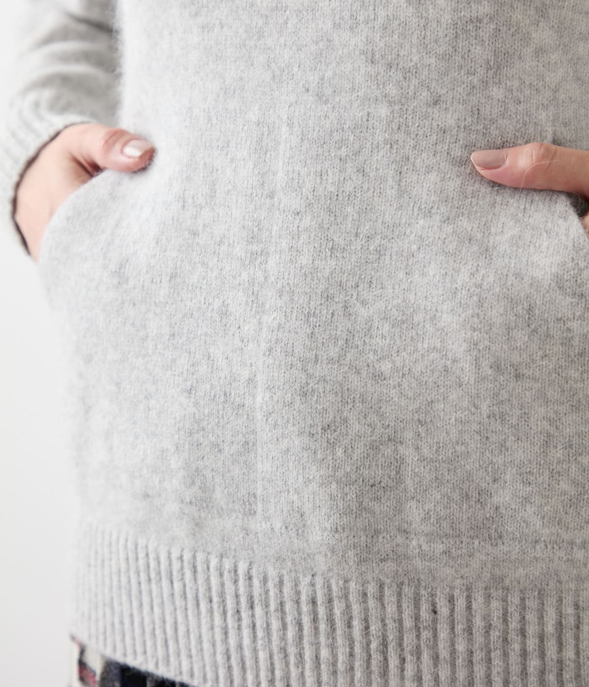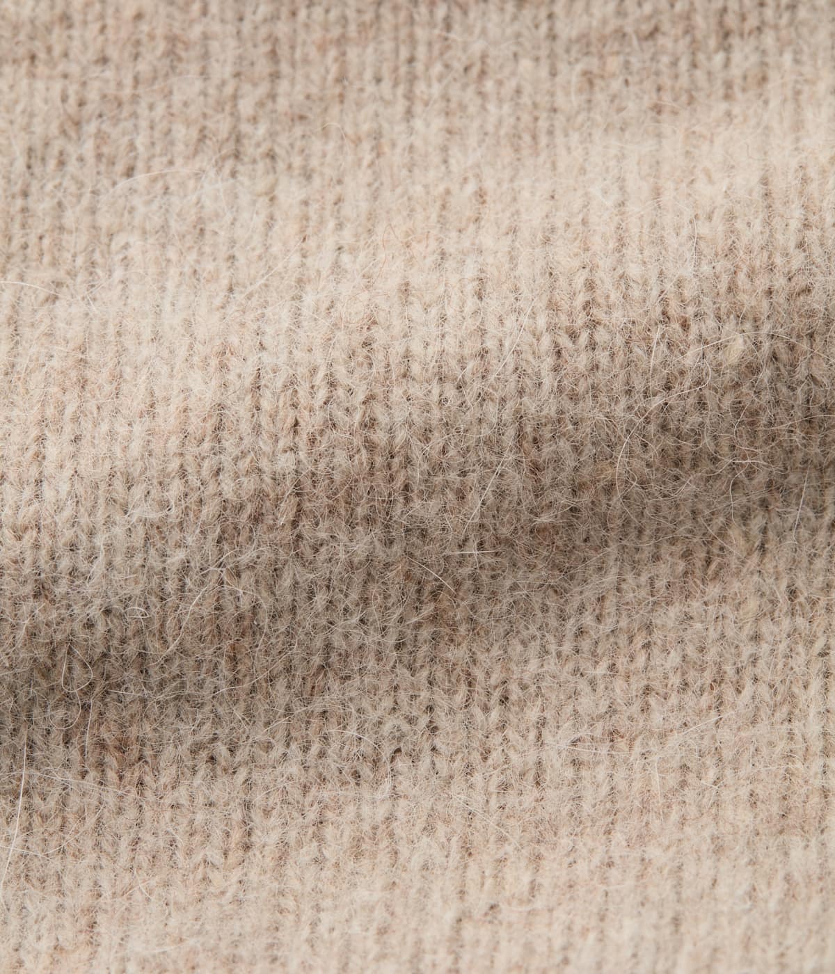 アンゴラ・ウール・ナイロンをブレンドした糸を使用。ふんわりとした風合いとやわらかな肌触り、軽やかな着心地が特徴です。ホールガーメントで編み立てることでごろつきがなく、素材の良さを引き立てる快適な仕上がりになっています。