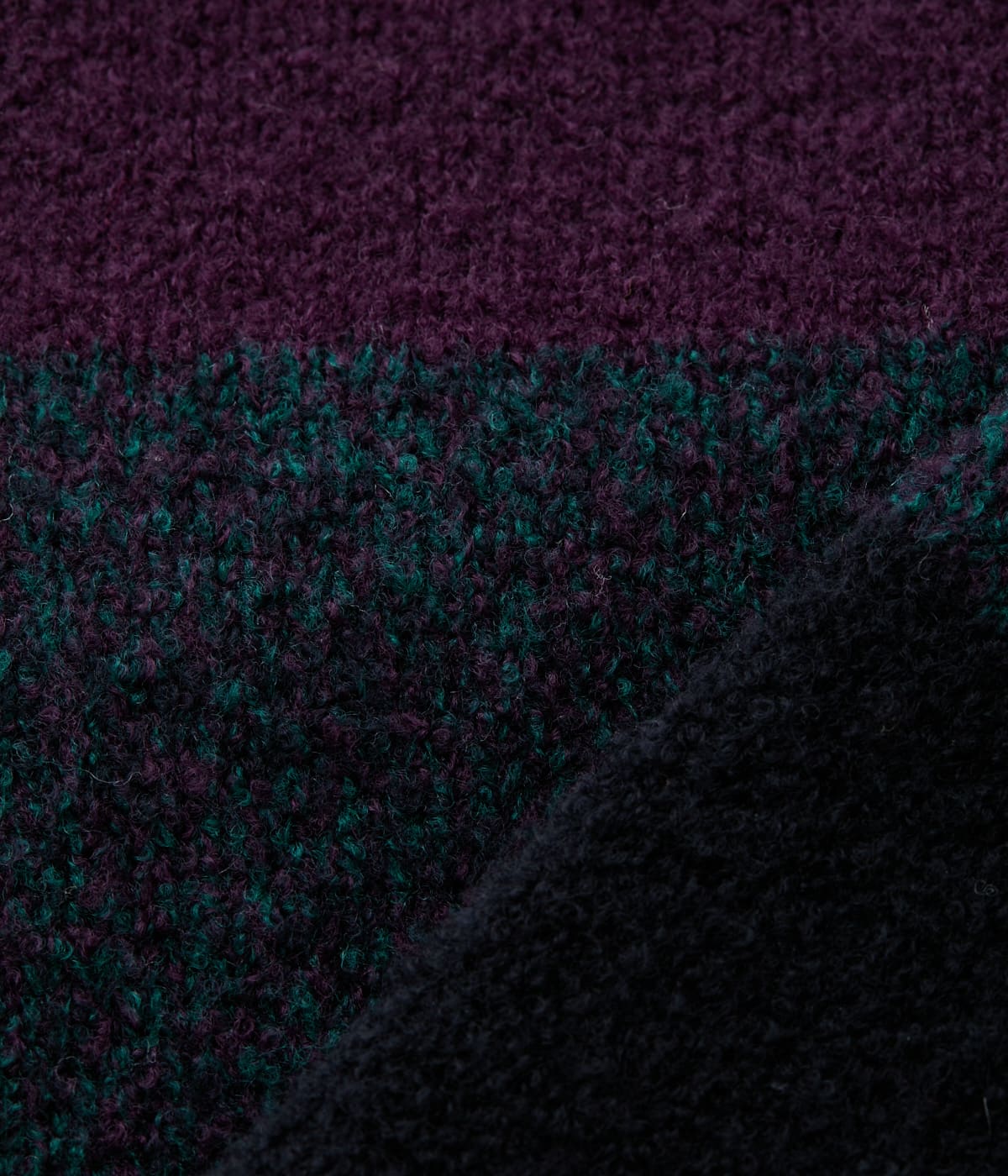 エクストラファインウールを使用したブークレーヤーン素材。ふっくらとした膨らみとやわらかな肌触りが特徴で、軽やかで暖かい着心地です。