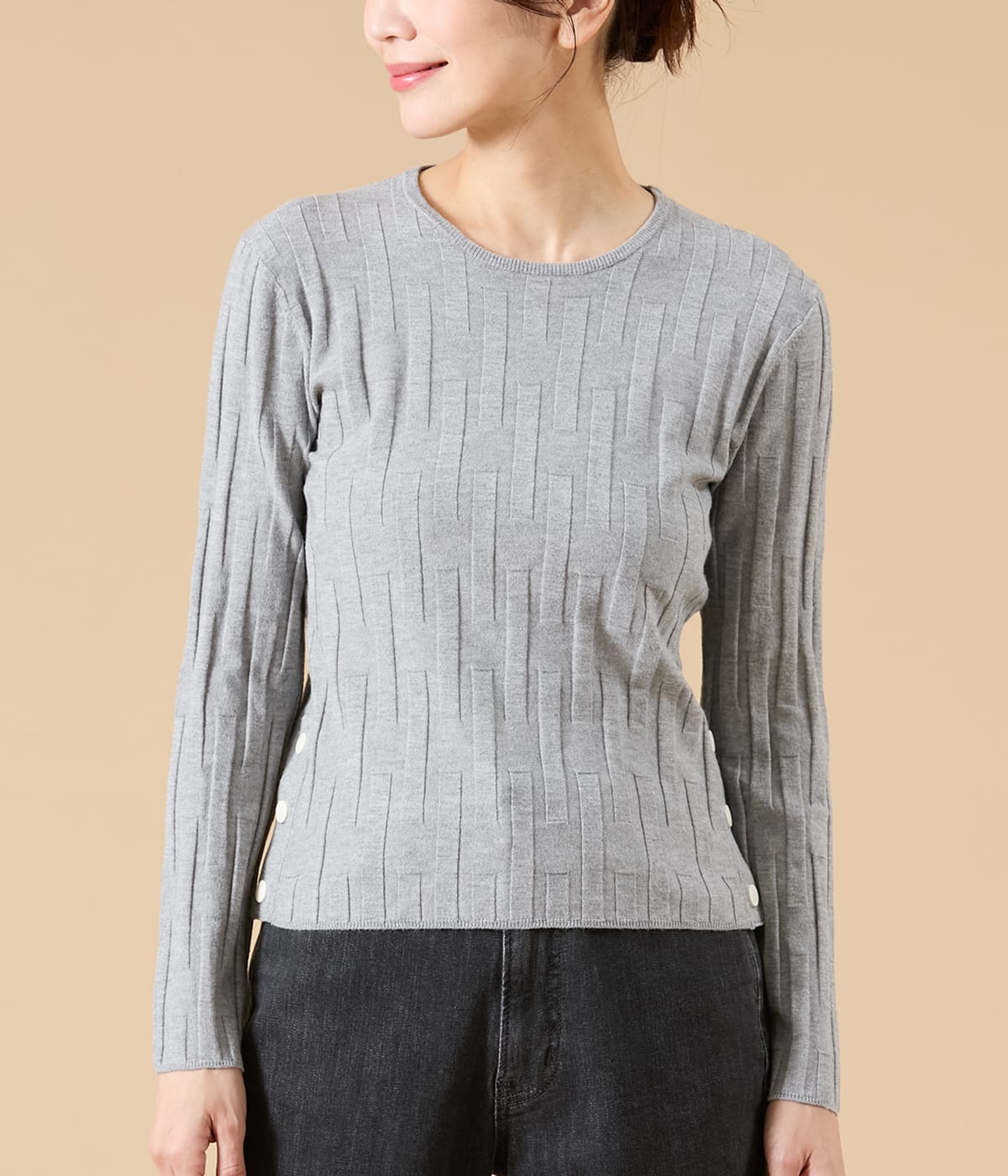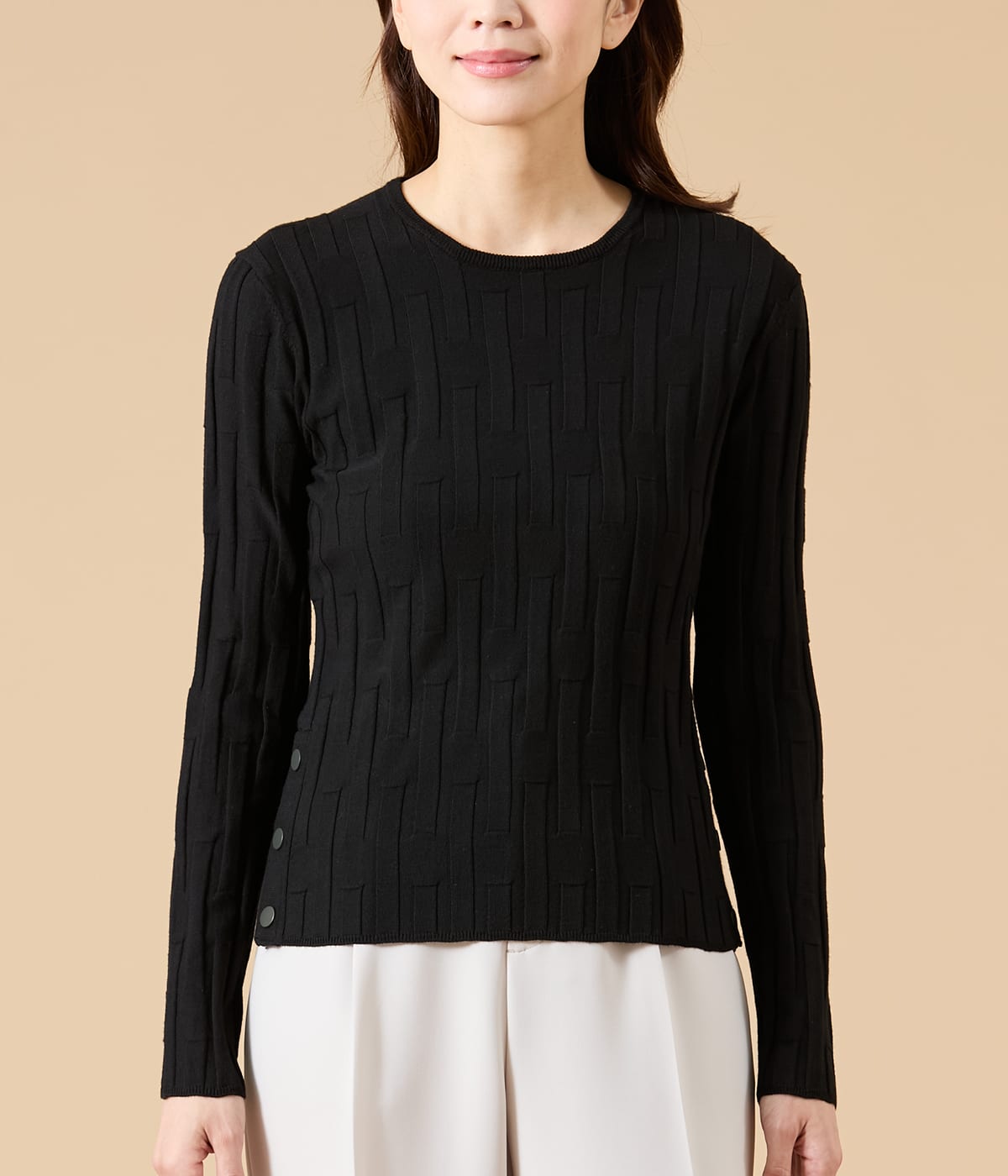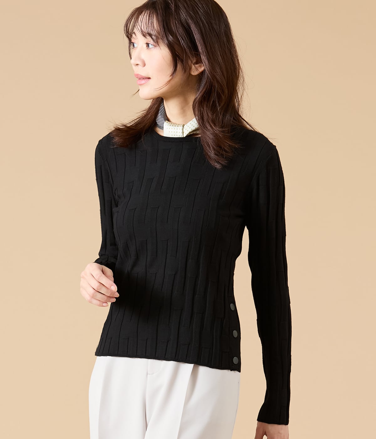 リブをアレンジした凹凸のある編地がポイントのプルオーバー。着ぶくれしないすっきりシルエットでジャケットインにもおすすめ。両脇裾のドットボタンで開き具合を調整でき、タックインせずとも抜け感のある着こなしも楽しめます。