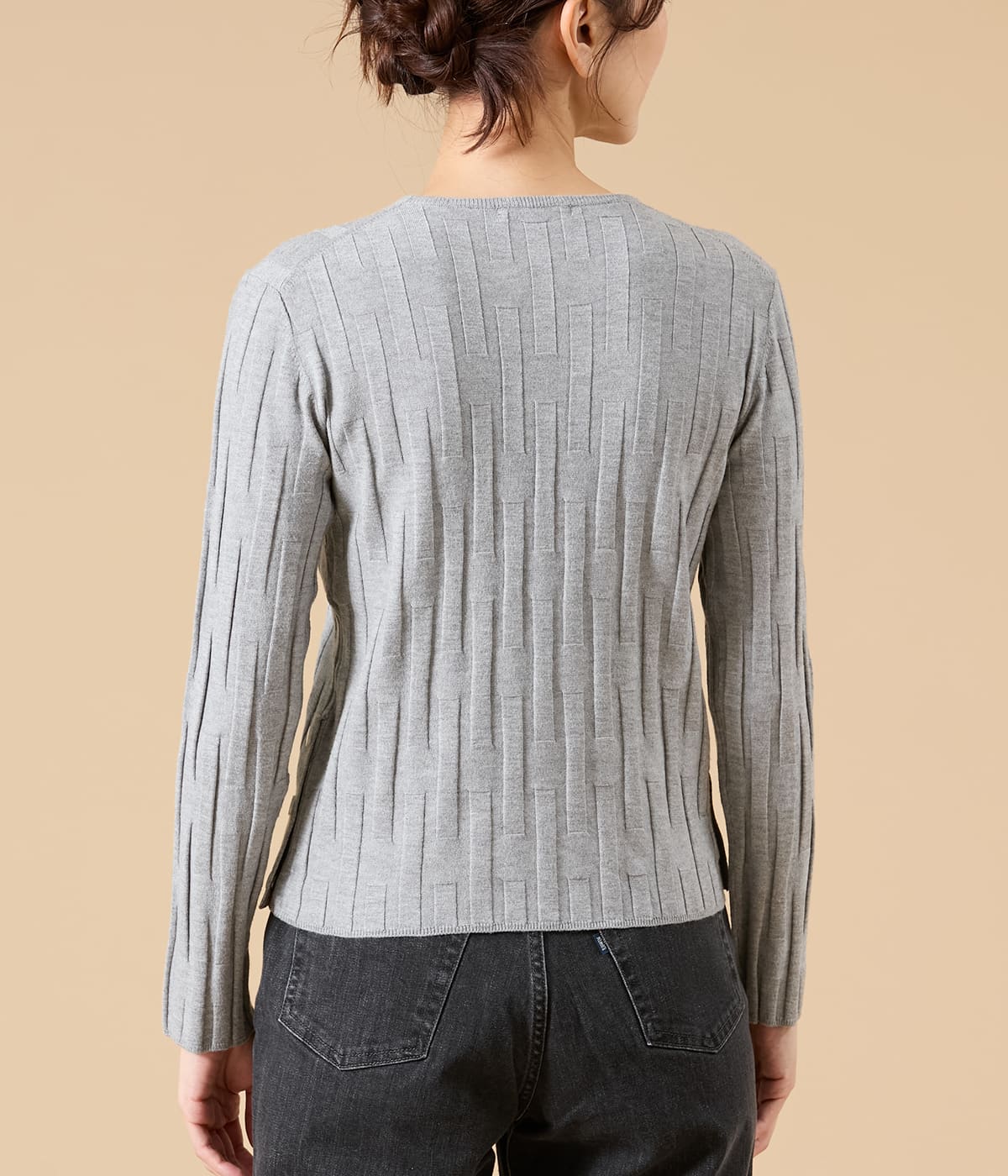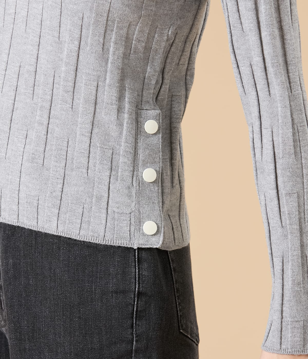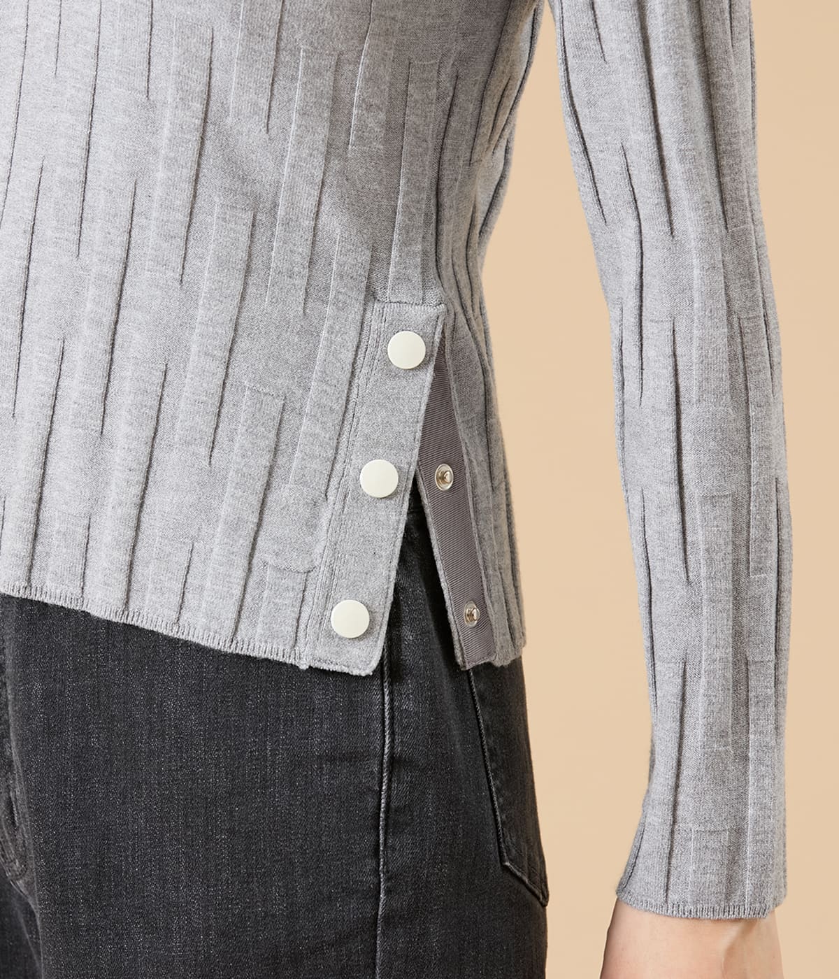 リブをアレンジした凹凸のある編地がポイントのプルオーバー。着ぶくれしないすっきりシルエットでジャケットインにもおすすめ。両脇裾のドットボタンで開き具合を調整でき、タックインせずとも抜け感のある着こなしも楽しめます。