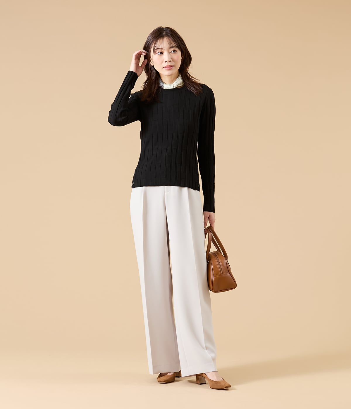 レーヨン×ポリエステルのやわらかく肌ざわりの良いリブニット素材。ロングシーズン着用できる素材感です。