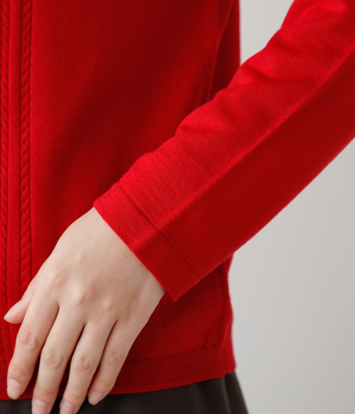 シンプルで着回しやすい、クルーネックの長袖カーディガン。前立て脇に太さの異なる繊細なケーブル編みを施し、リズムのある編地に仕上げました。また、袖口や裾をリブではなく袋始末にすることで、プレーンな表情に。洗濯による多少の縮みをカバーするため、やや大きめのサイズ感にしています。