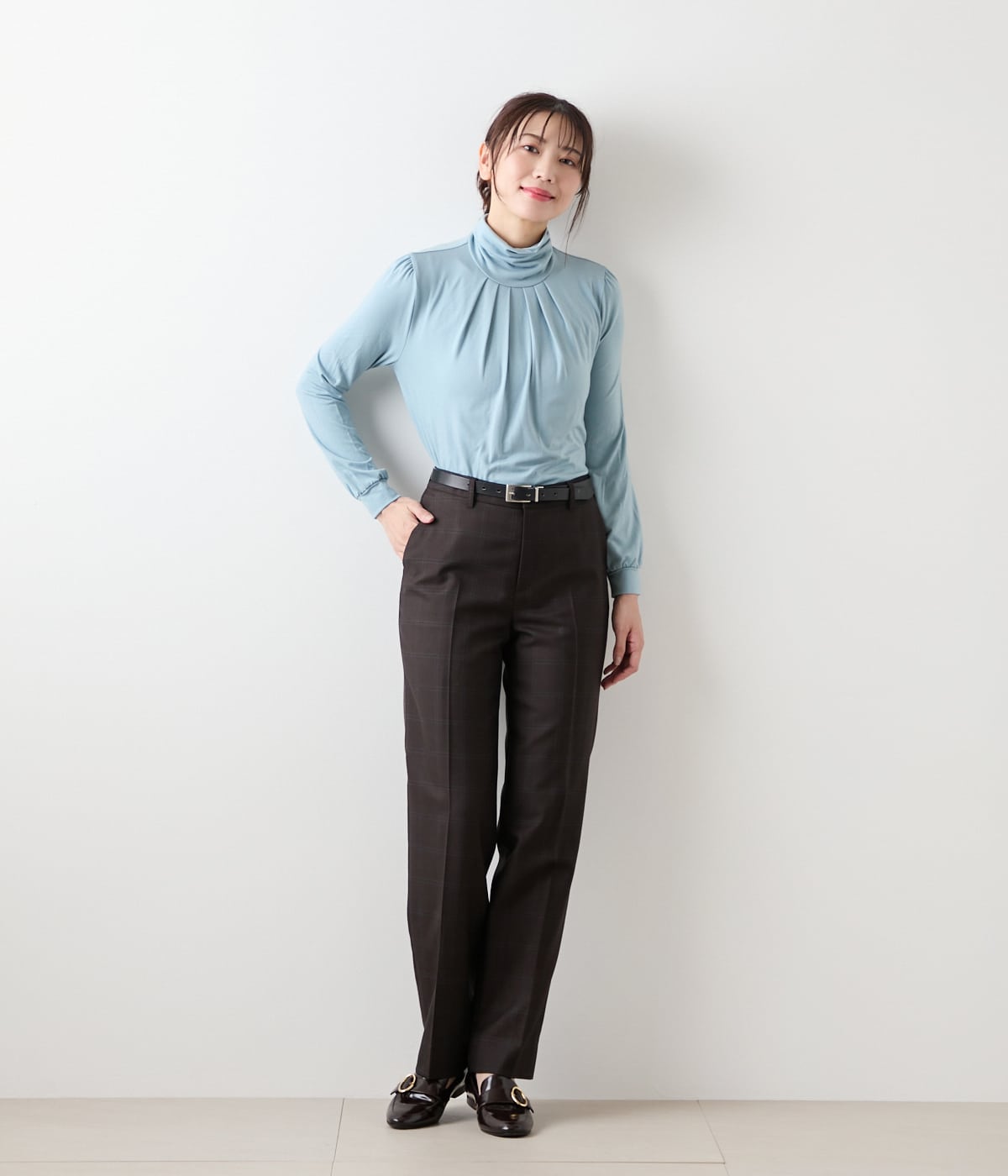首元まであたたかく包み込む、タートルネックのカットソー。胸元にタック、裾にギャザーを入れてふんわりとさせることで、身体のラインを拾いにくいシルエットに仕上げました。胸元のタックは、ジャケットスタイルにも映える繊細なアクセントに。薄手ながらもあたたかく、着ぶくれを気にせずに冬のレイヤードスタイルをお楽しみいただけます。タートルネック部分は外側に折り込んでも、ゆとりを残して折らずに着用してもバランス良く決まります。