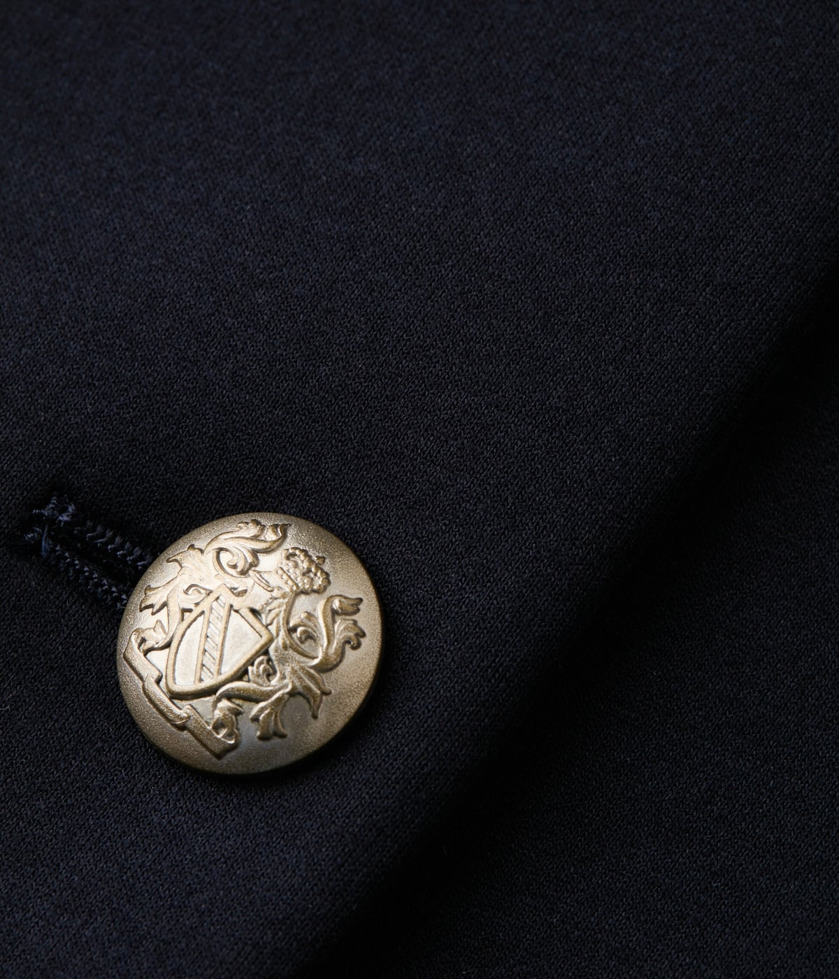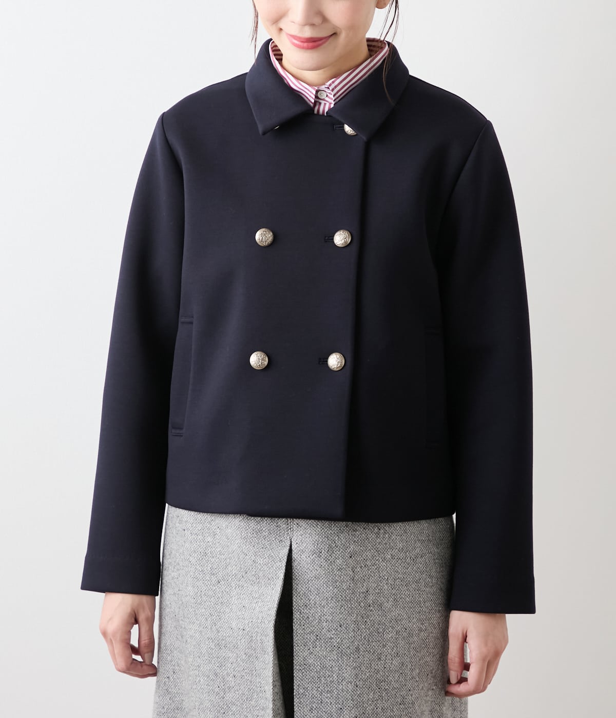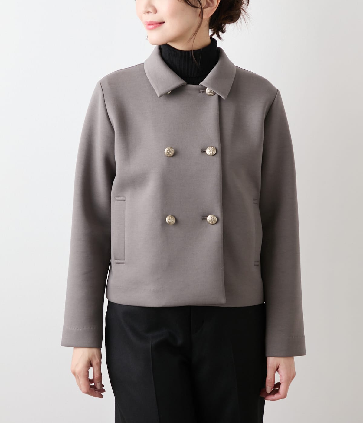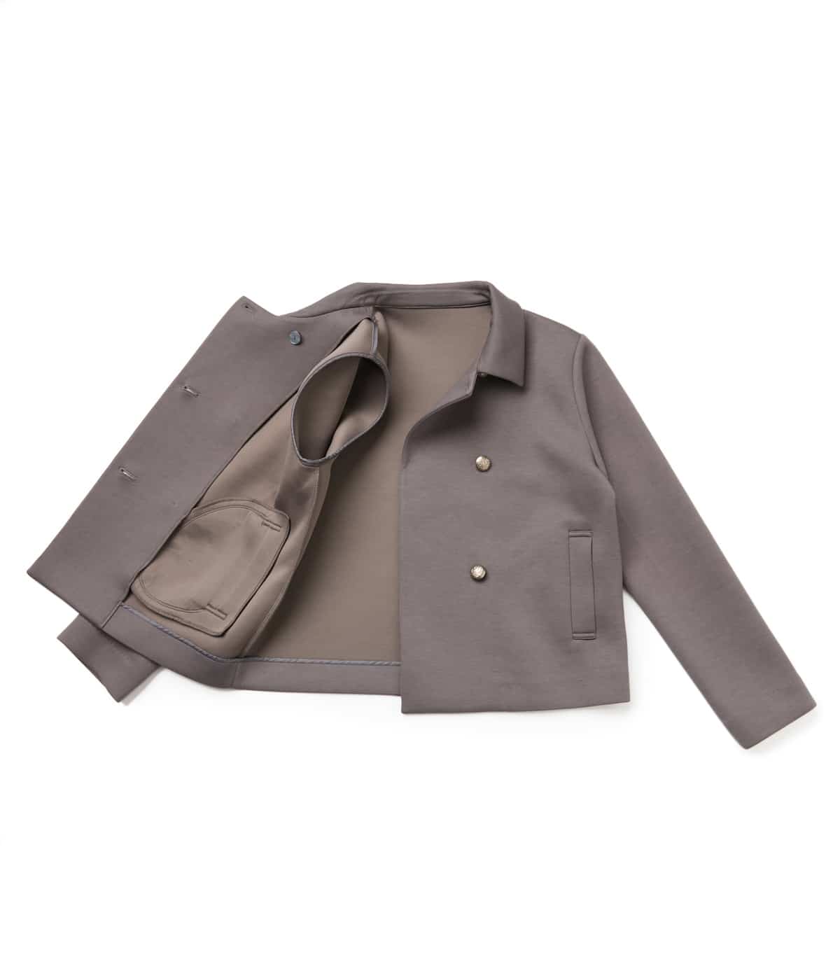 ダブル釦のクラシカルなデザインで、見た目はしっかりとしたジャケットのような印象。コンパクトめのシルエットでトレンド感を取り入れつつ、オフィスにも対応できるきちんと感を備えています。裏地なし。ポケットあり。