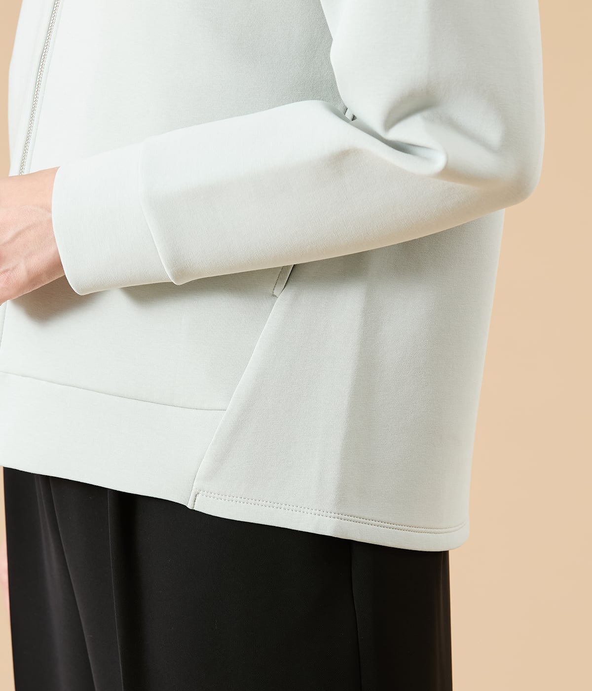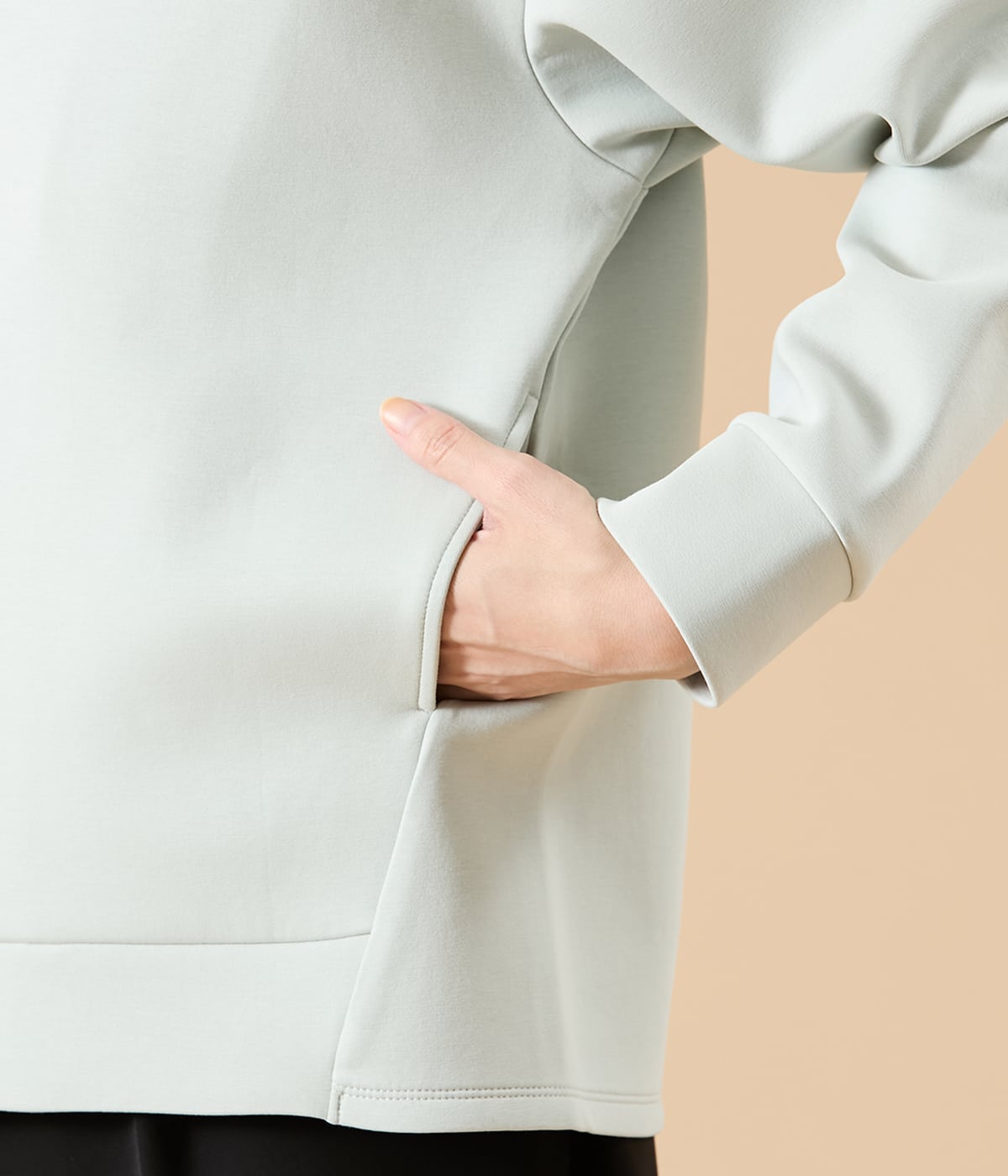 ゆとりのあるサイズ感ながら、脇線を前寄りに切り替えることでシルエットはすっきり。軽く羽織るだけでこなれたバランスが完成する、大人のためのキレイめパーカーです。