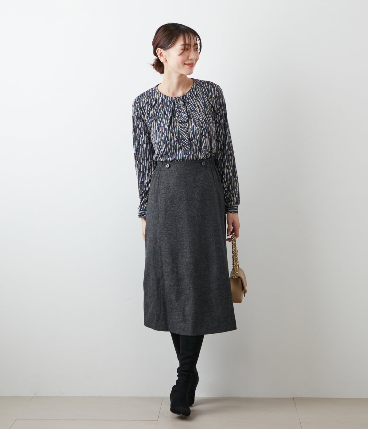 クルーネックの長袖プルオーバー。柄が引き立つシンプルなデザインに、襟元のボウタイできちんと感をプラスしました。ボウタイは釦で留め付けており、付け外しの手間や着崩れを気にせず着用できるのがポイント。スクエア型の飾り釦は、アクセサリー感覚で顔周りに華やぎを添えてくれます。