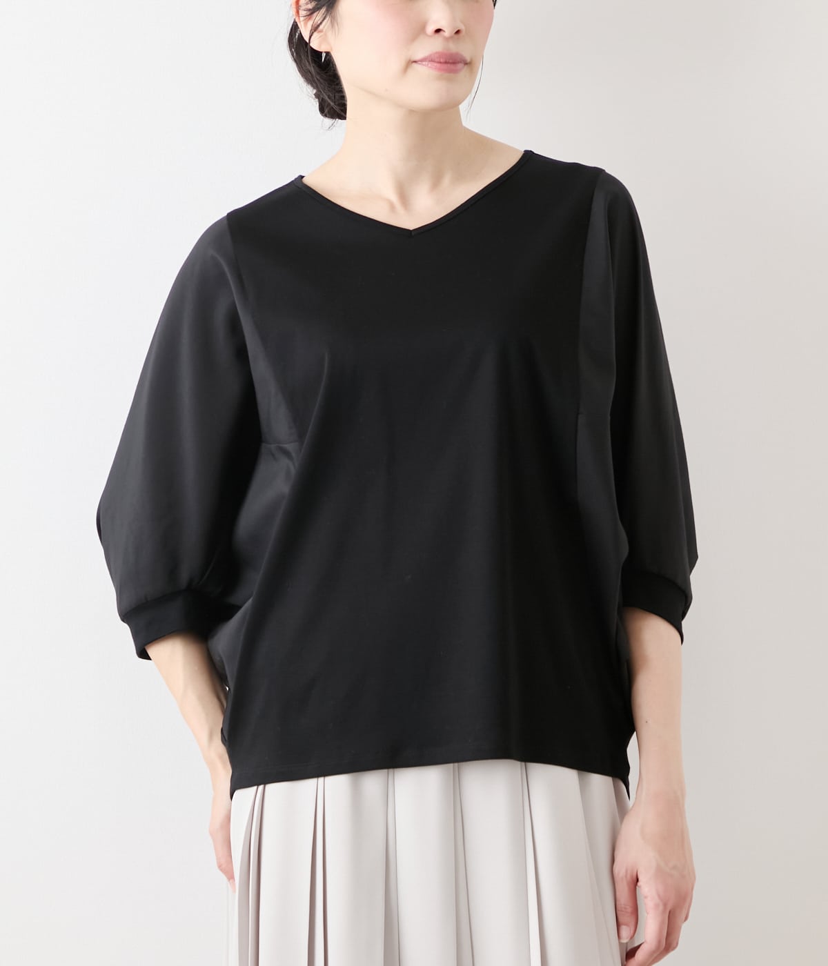 浅Vネックの6分袖プルオーバー。たっぷりとボリュームを持たせたドルマンスリーブは、手元がすっきり見せる長さと薄手の素材切替で軽やかな印象に仕上げました。腕周りだけでなく身頃にもゆとりがあり、身体のラインを拾いにくいデザインです。腰回りやヒップをカバーできる、前後差を付けた着丈もポイント。